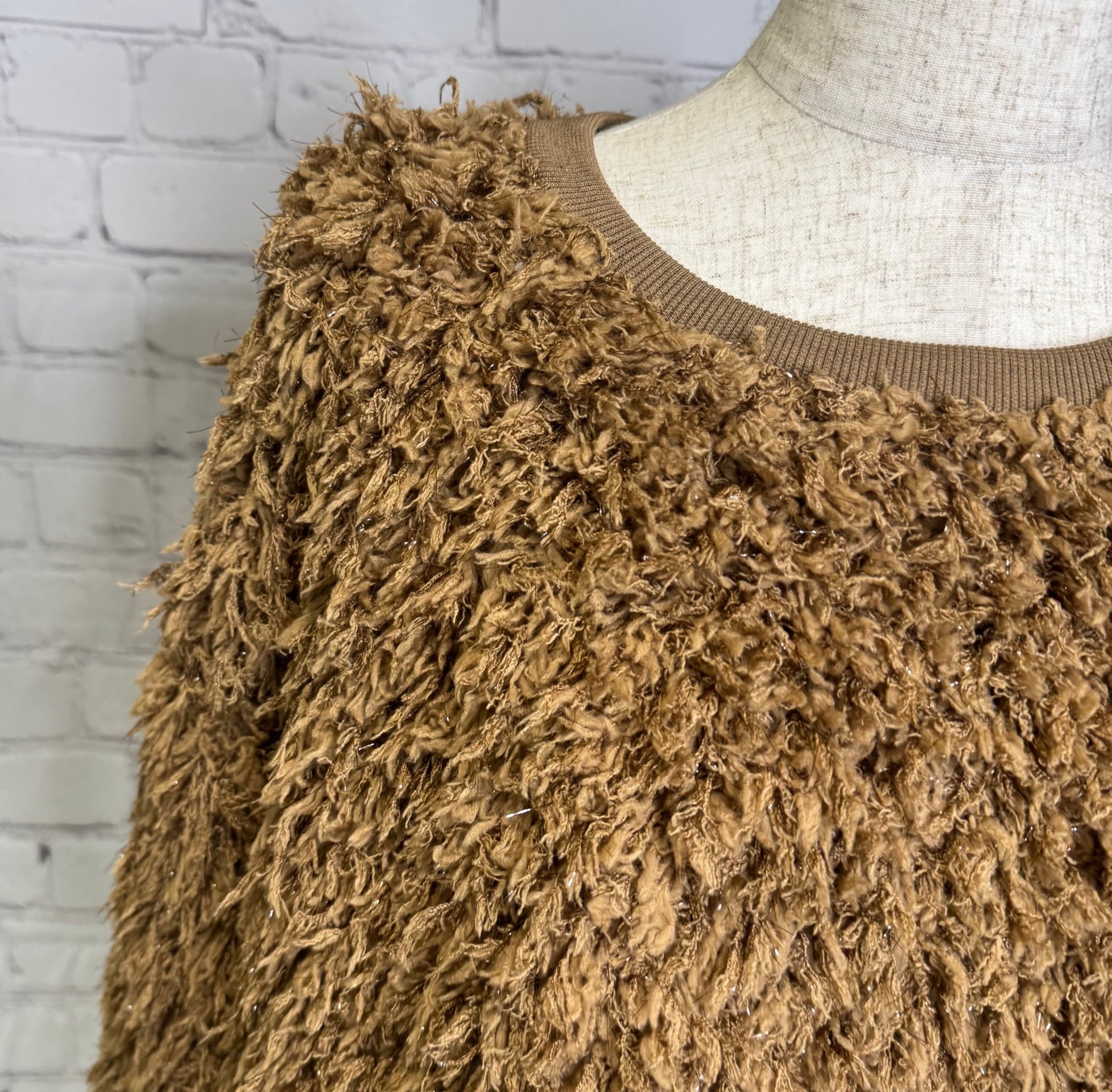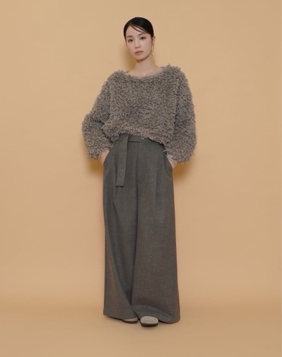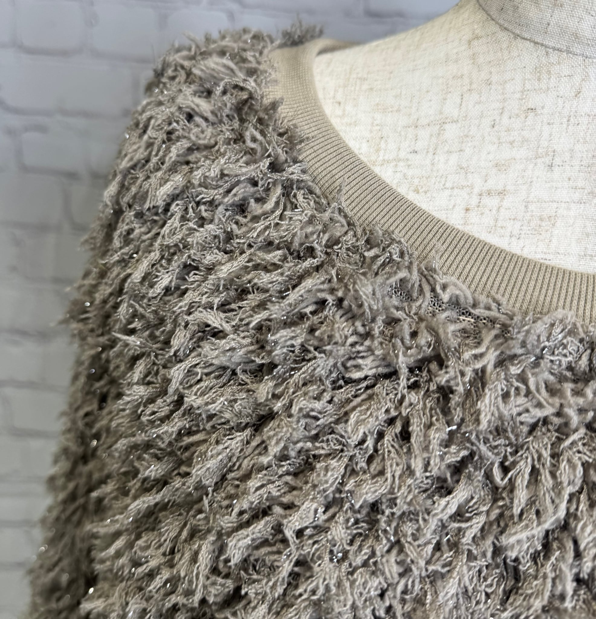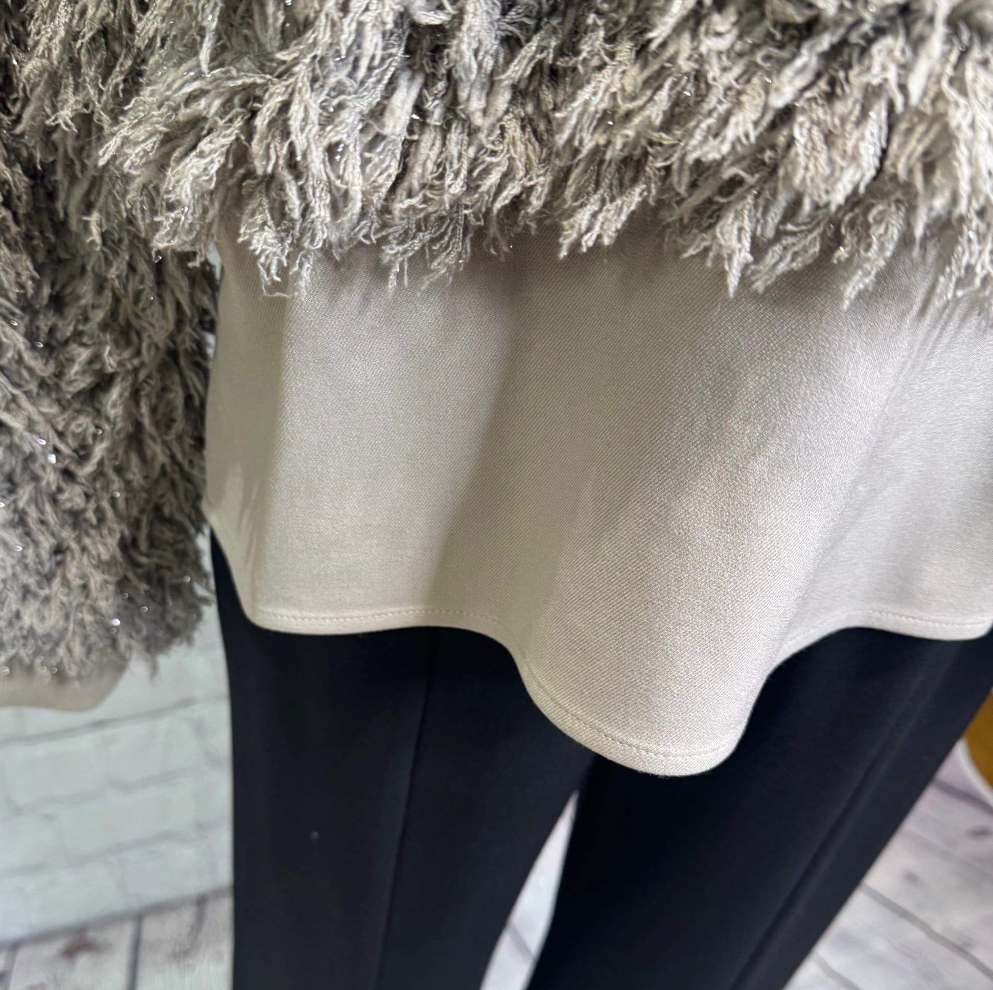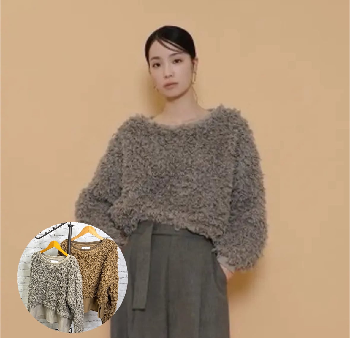 程よいラメが入ったボアシャギーブラウスです。裾の部分に別布をドッキングさせてウエストまわりをスッキリみせてくれます。袖口リブも嬉しいポイント!