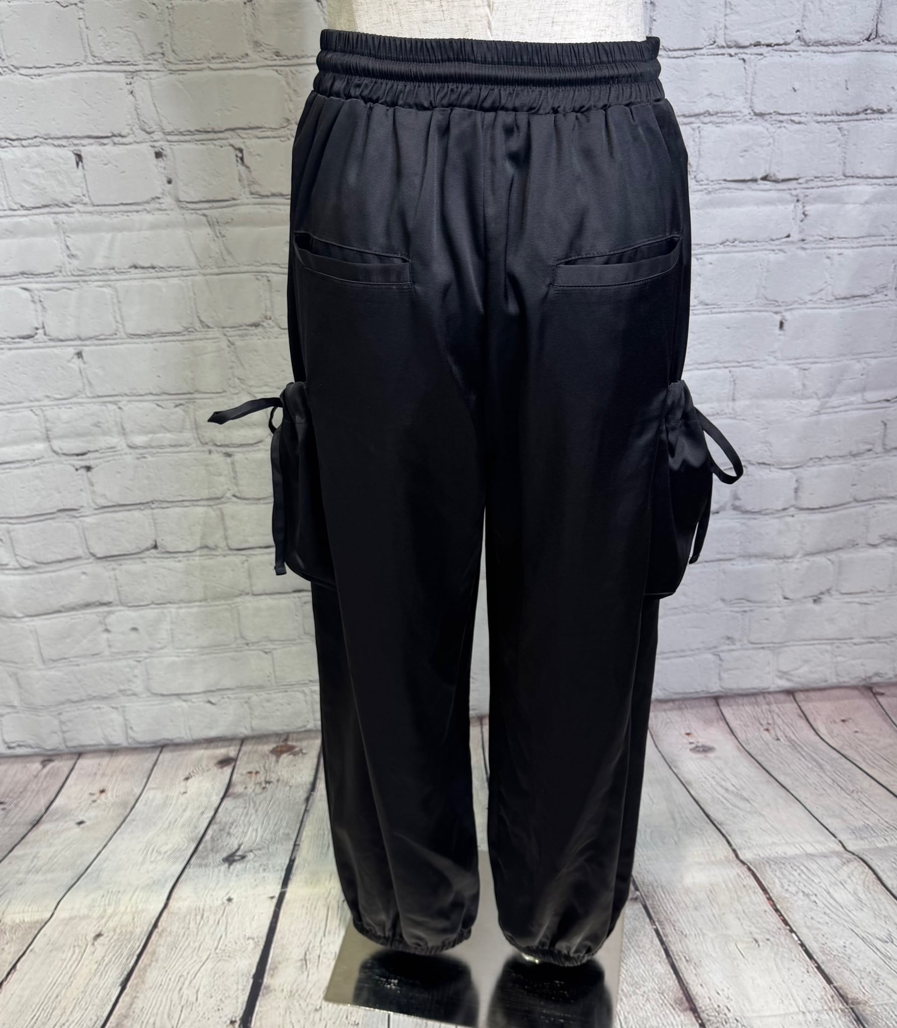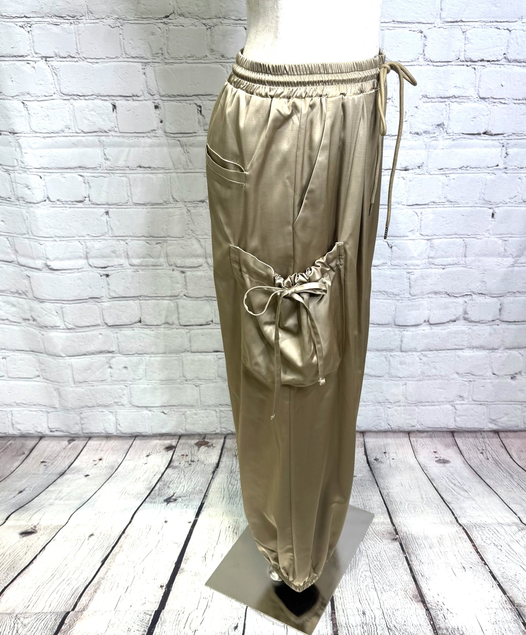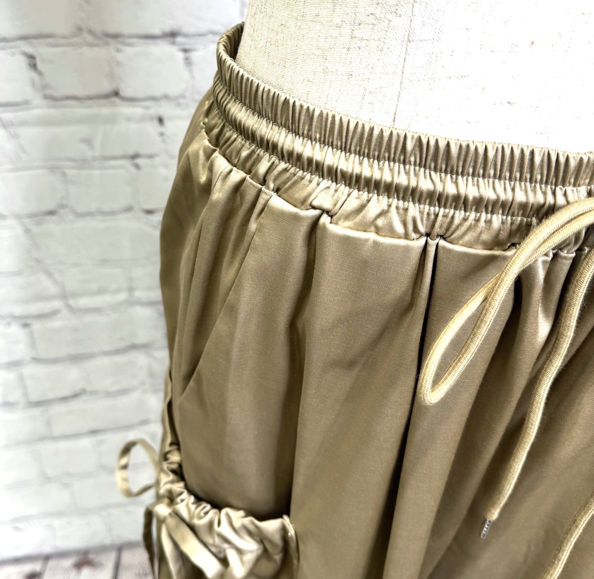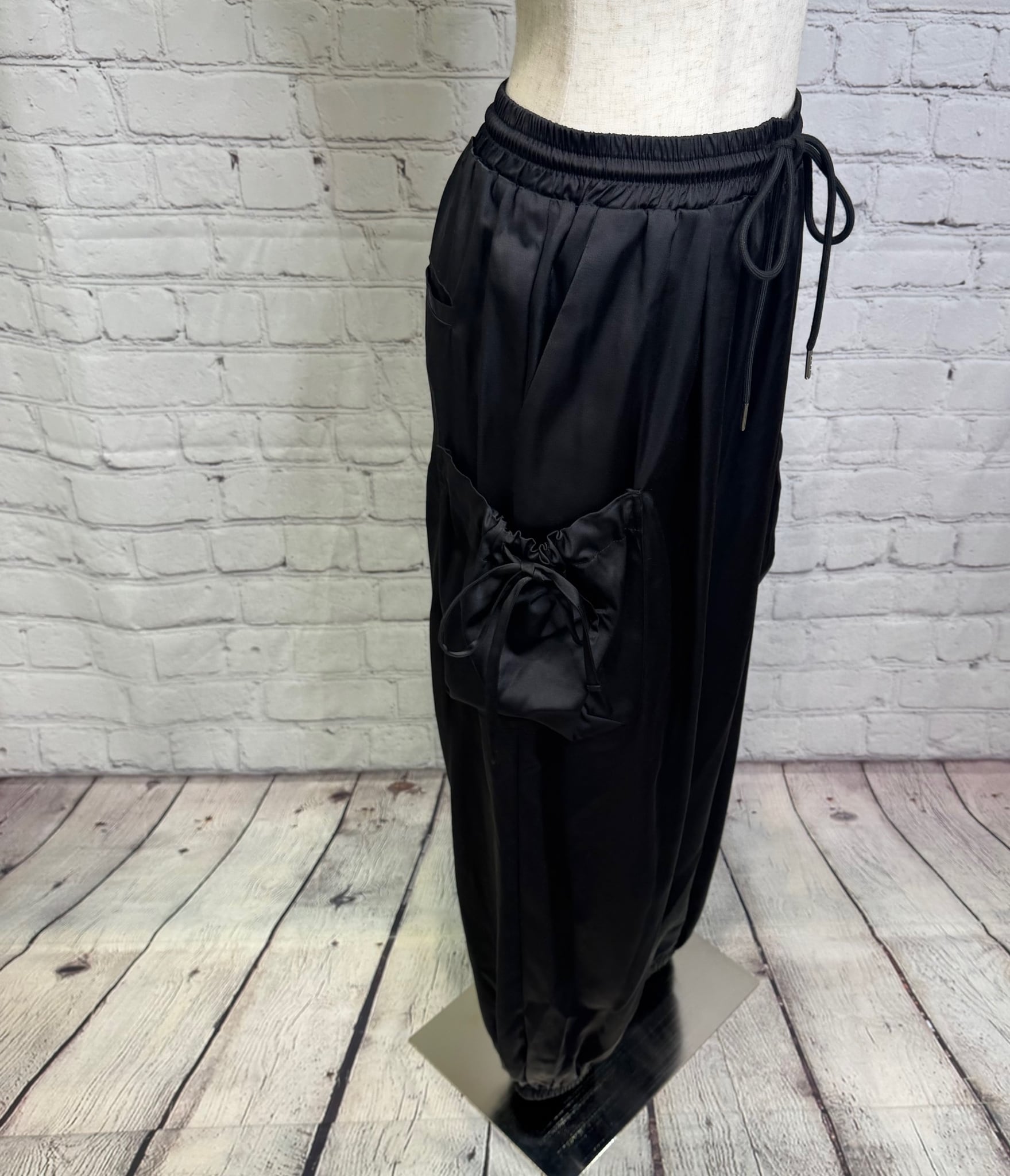 艶感があり、きれちな落ち感のジョガーパンツです。ポケットのシャーリングのリボンがポイントでスポーティ過ぎず甘さをプラスしたデザインです。ウエストゴムで楽ちん♪ 紐でサイズ調節できます。裾にゴムが入っていて足首でとまるデザインです。お家で洗えます。