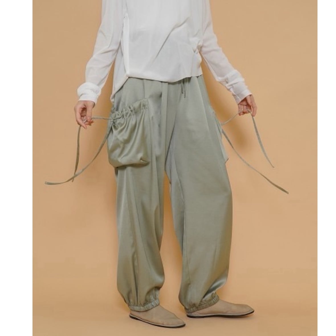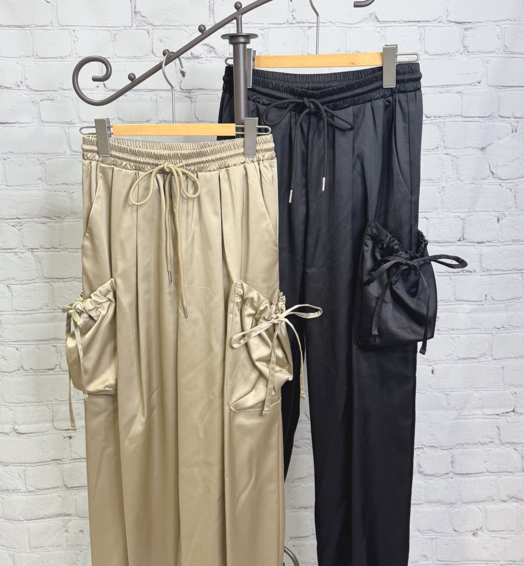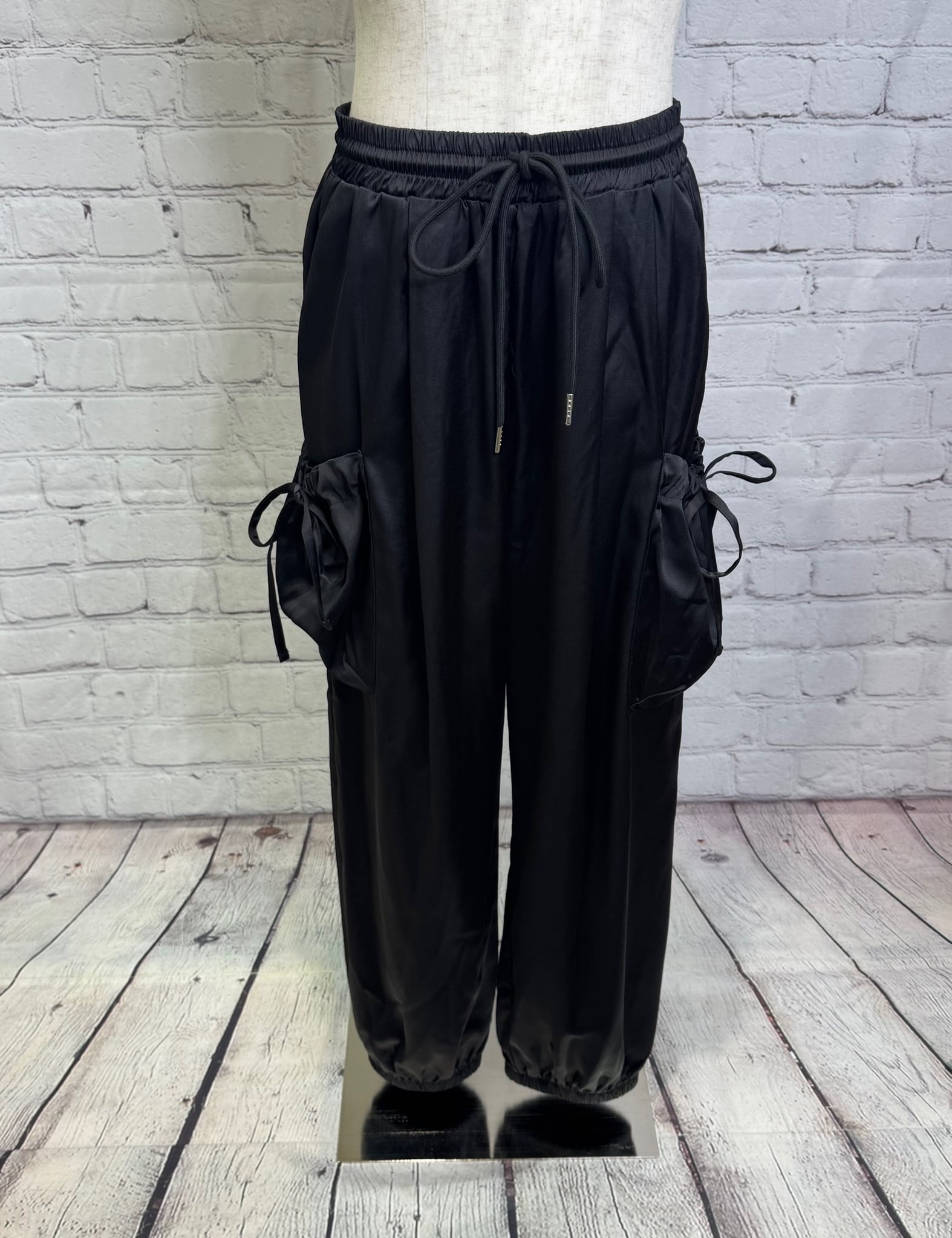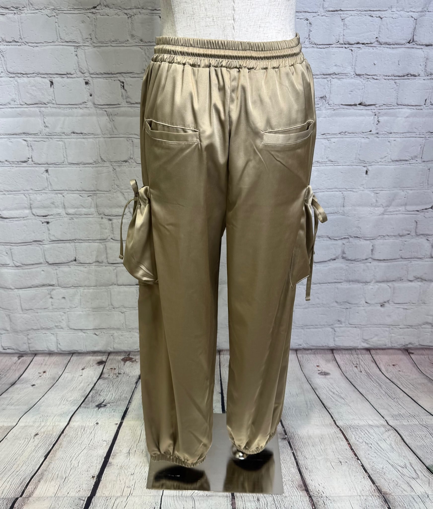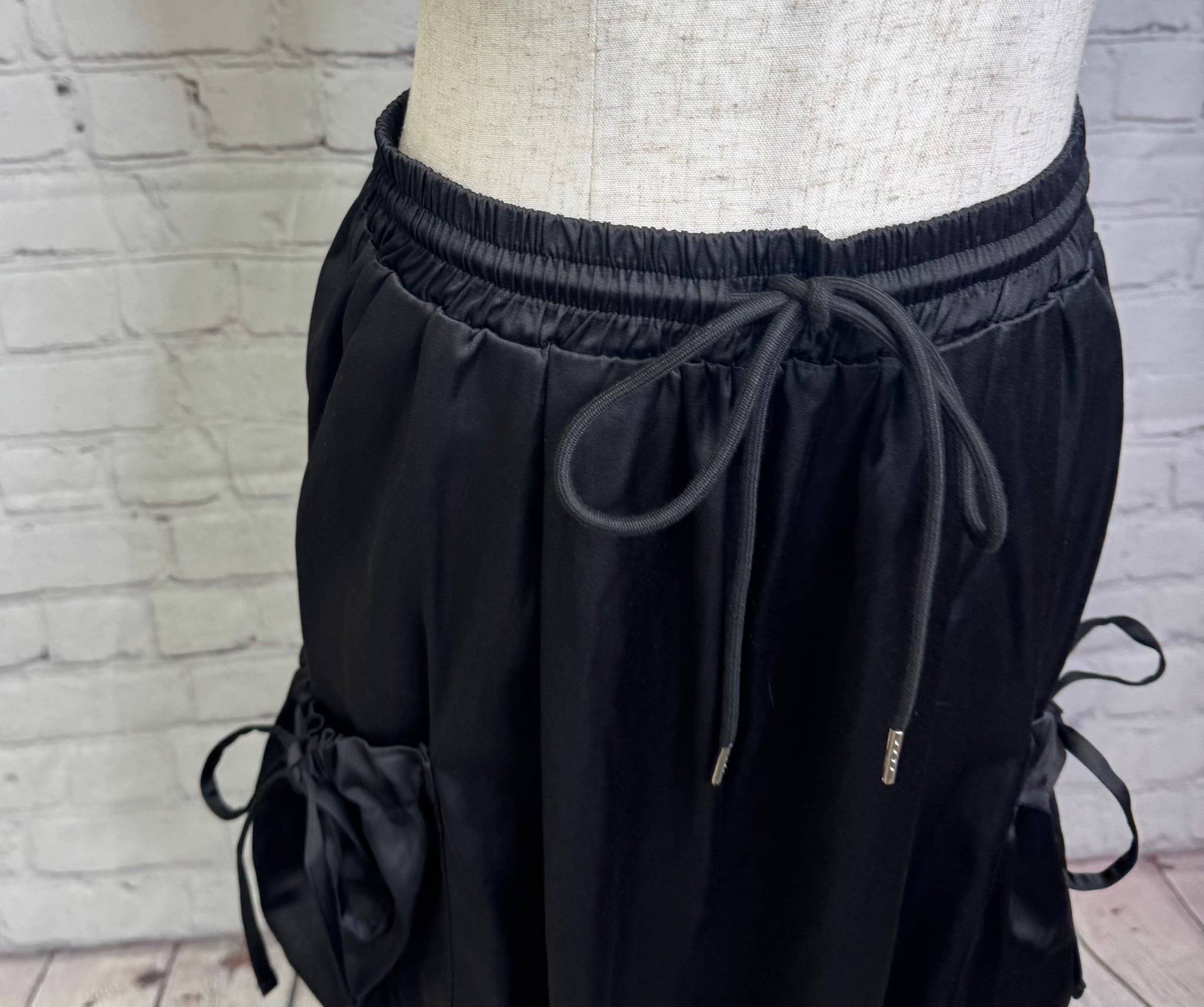 艶感があり、きれちな落ち感のジョガーパンツです。ポケットのシャーリングのリボンがポイントでスポーティ過ぎず甘さをプラスしたデザインです。ウエストゴムで楽ちん♪ 紐でサイズ調節できます。裾にゴムが入っていて足首でとまるデザインです。お家で洗えます。