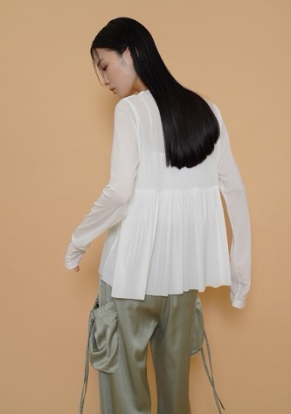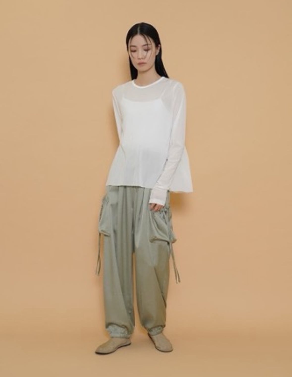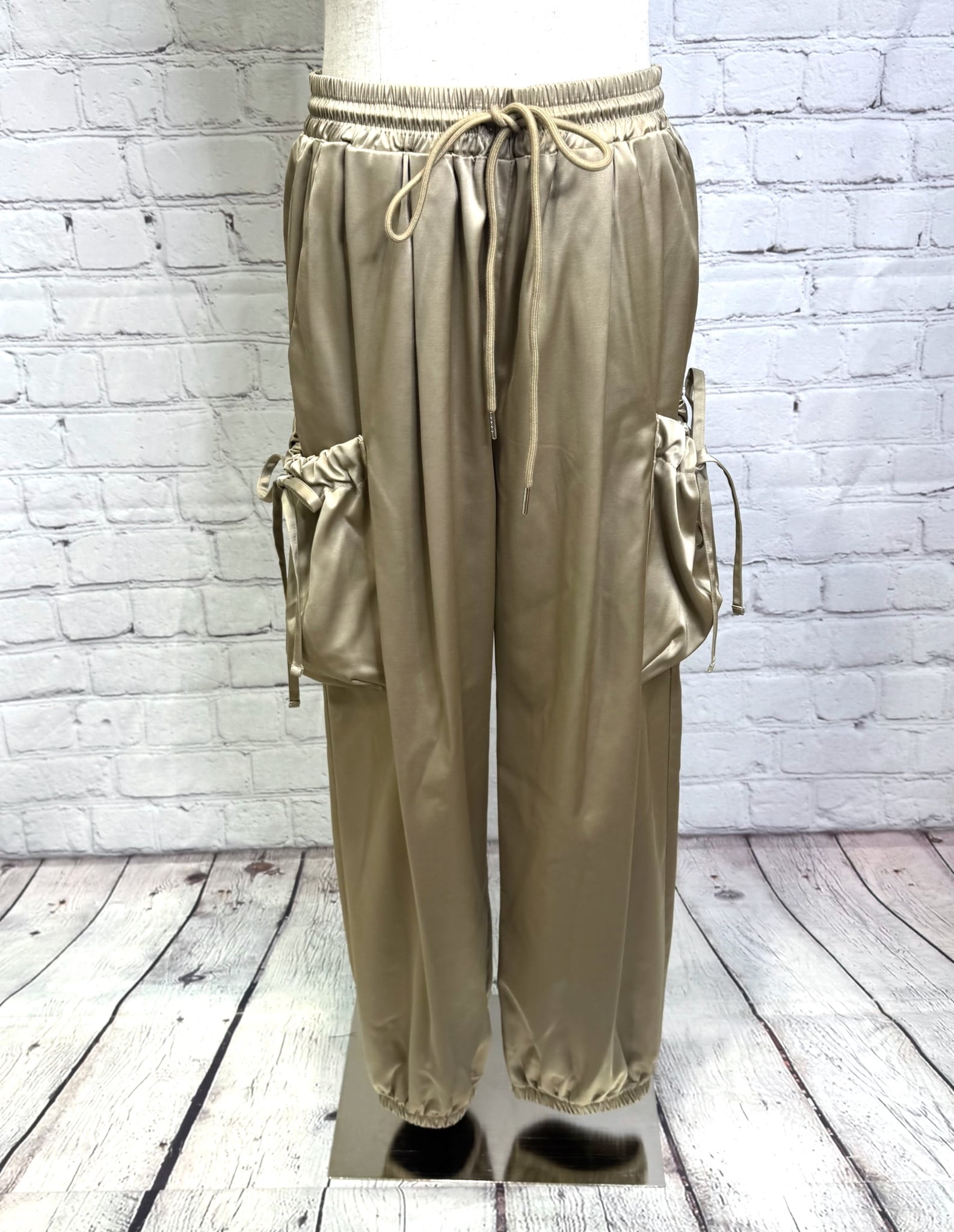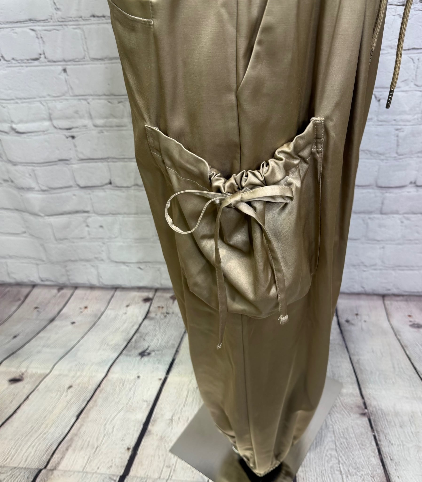 艶感があり、きれちな落ち感のジョガーパンツです。ポケットのシャーリングのリボンがポイントでスポーティ過ぎず甘さをプラスしたデザインです。ウエストゴムで楽ちん♪ 紐でサイズ調節できます。裾にゴムが入っていて足首でとまるデザインです。お家で洗えます。
