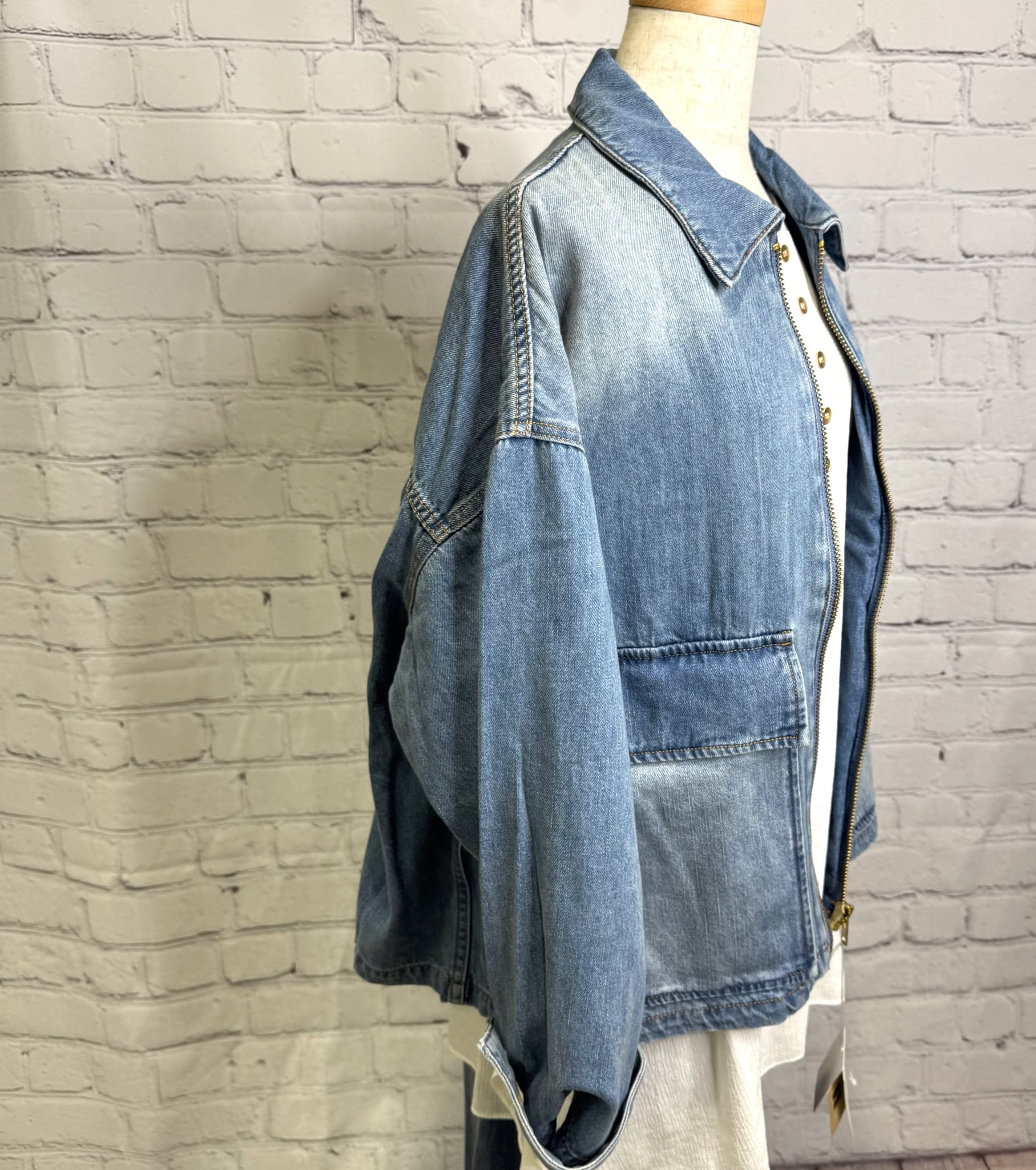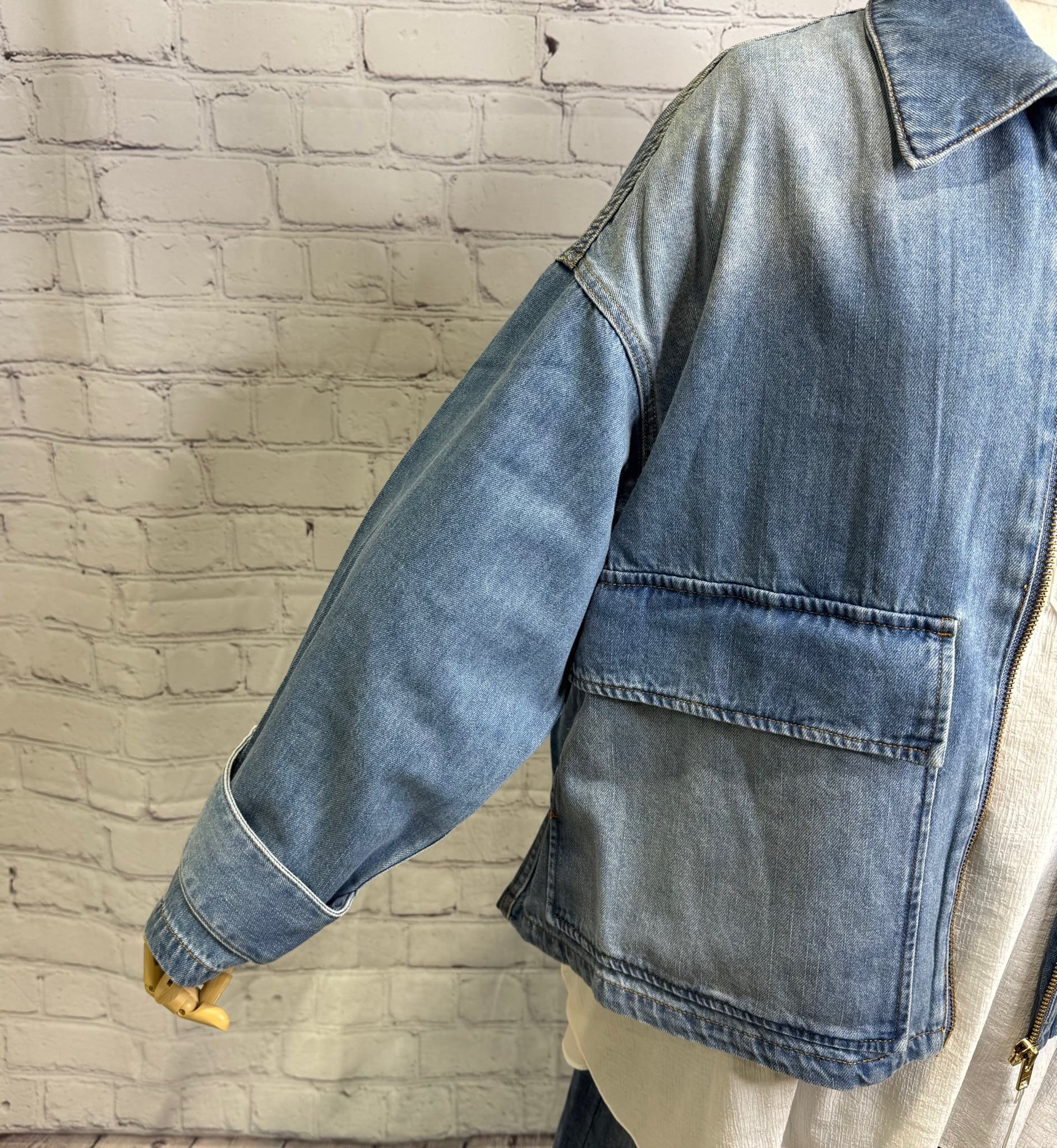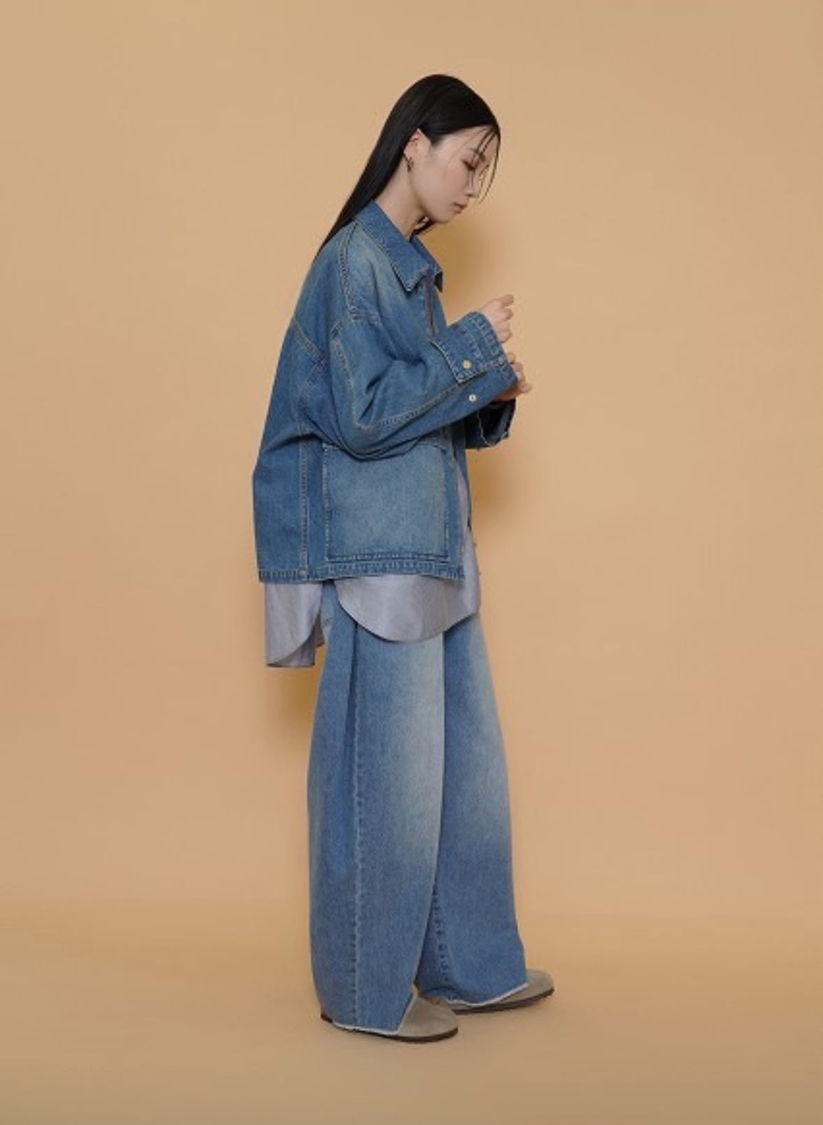 ゆったりシルエットで、BIGポケットがポイントのデニムブルゾンです。ZIP開閉で着心地も良く、さっと羽織るだけでトレンド感がでておしゃれ見えしてくれます。お家で洗えます。