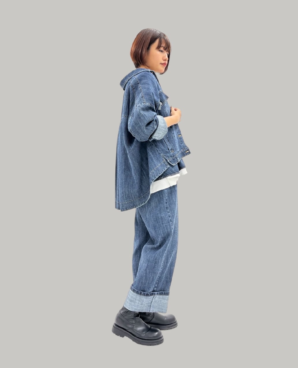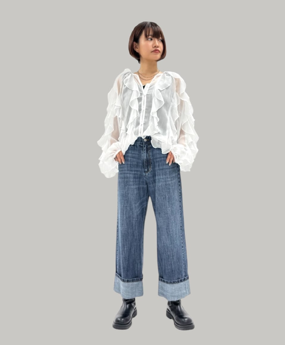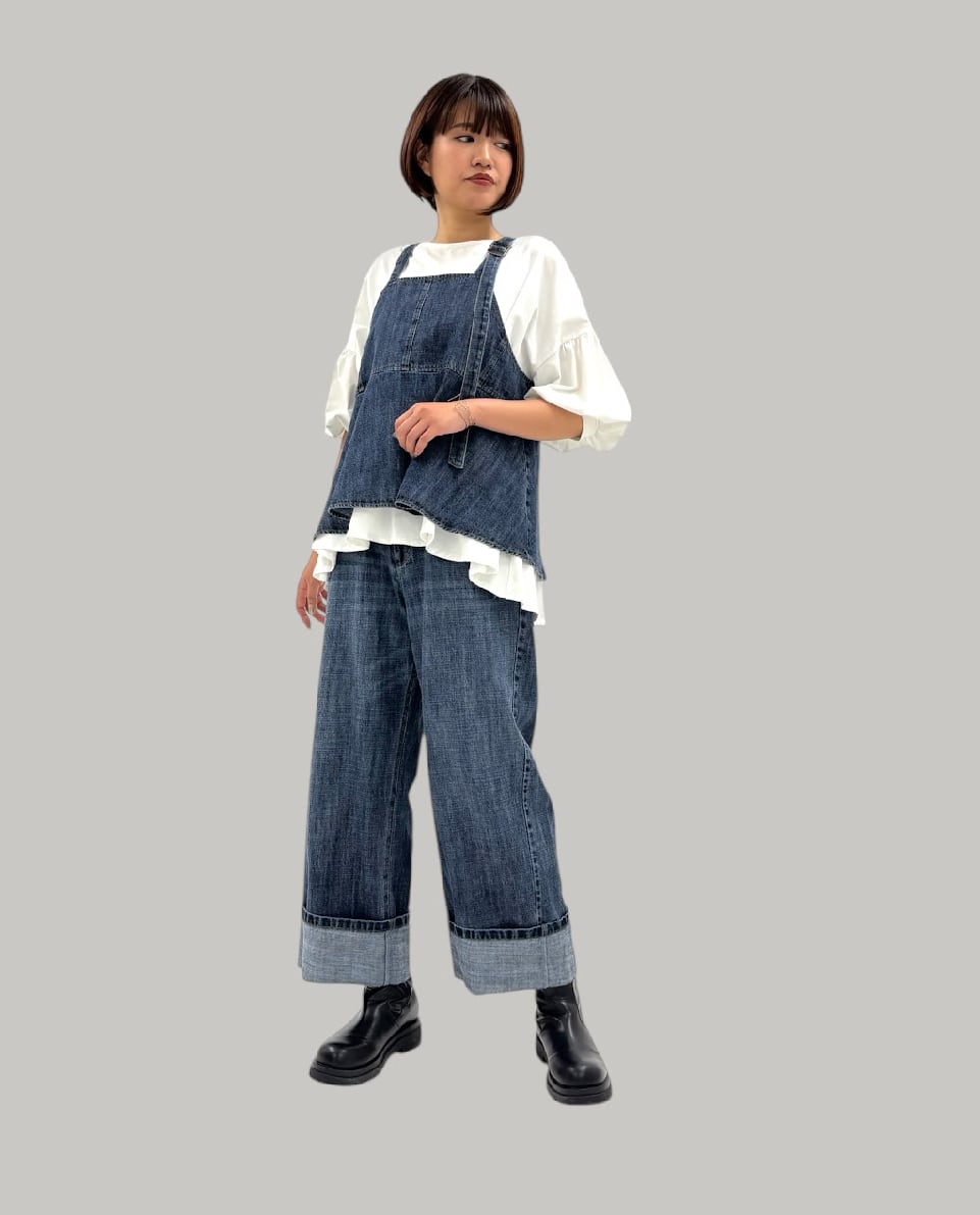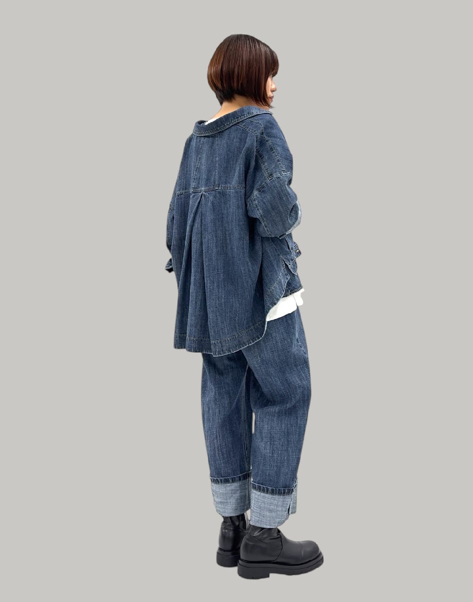 リネン混のハイクオリティなデニム素材です。軽量で柔らかく加工感が大人っぽい印象に仕上がります。裾をお好きな長さに折り返していただけます。ayane的には深めにターンバックしたままの感じでワンサイズアップしてゆるっとコーデがおすすめです。