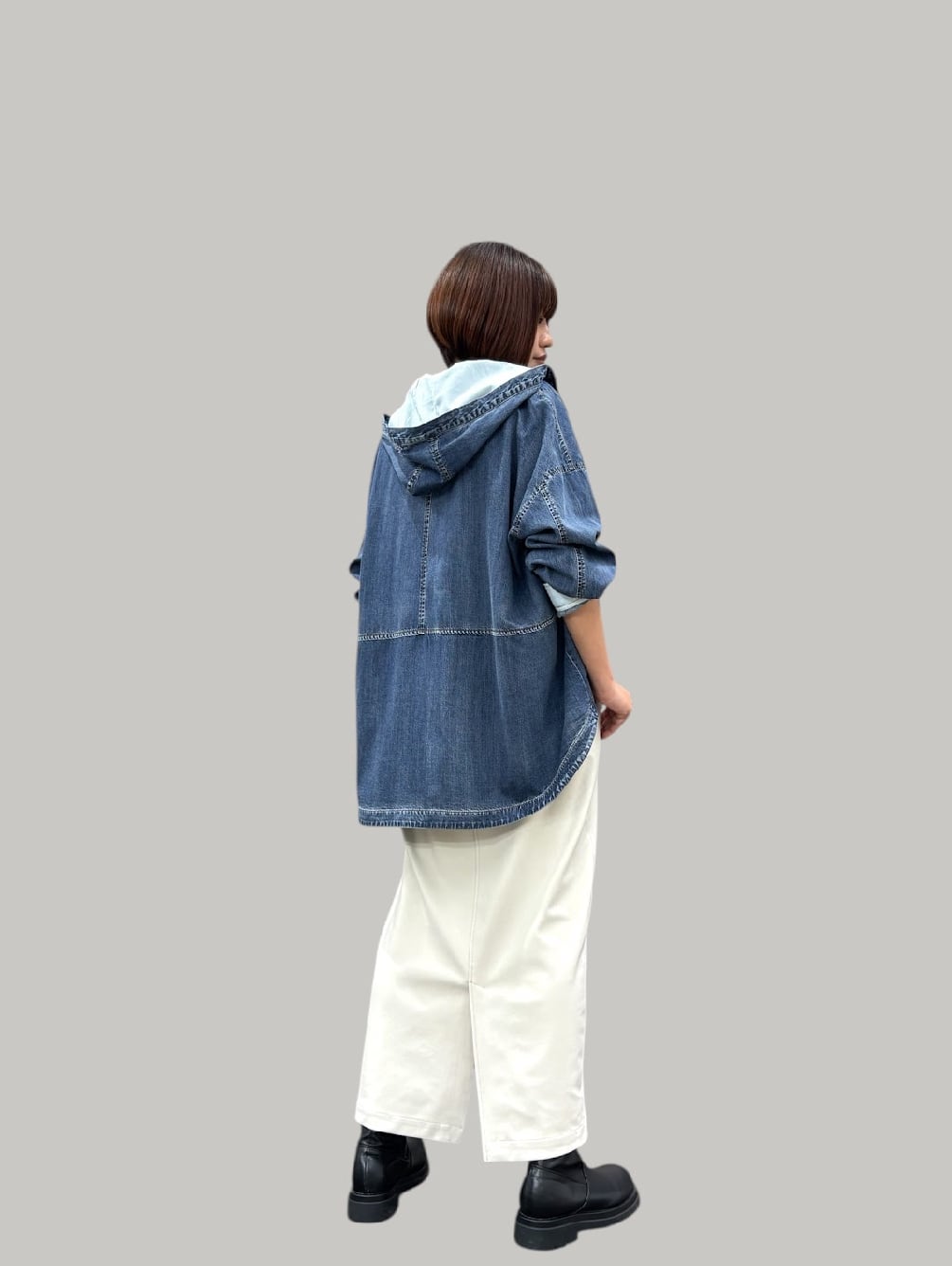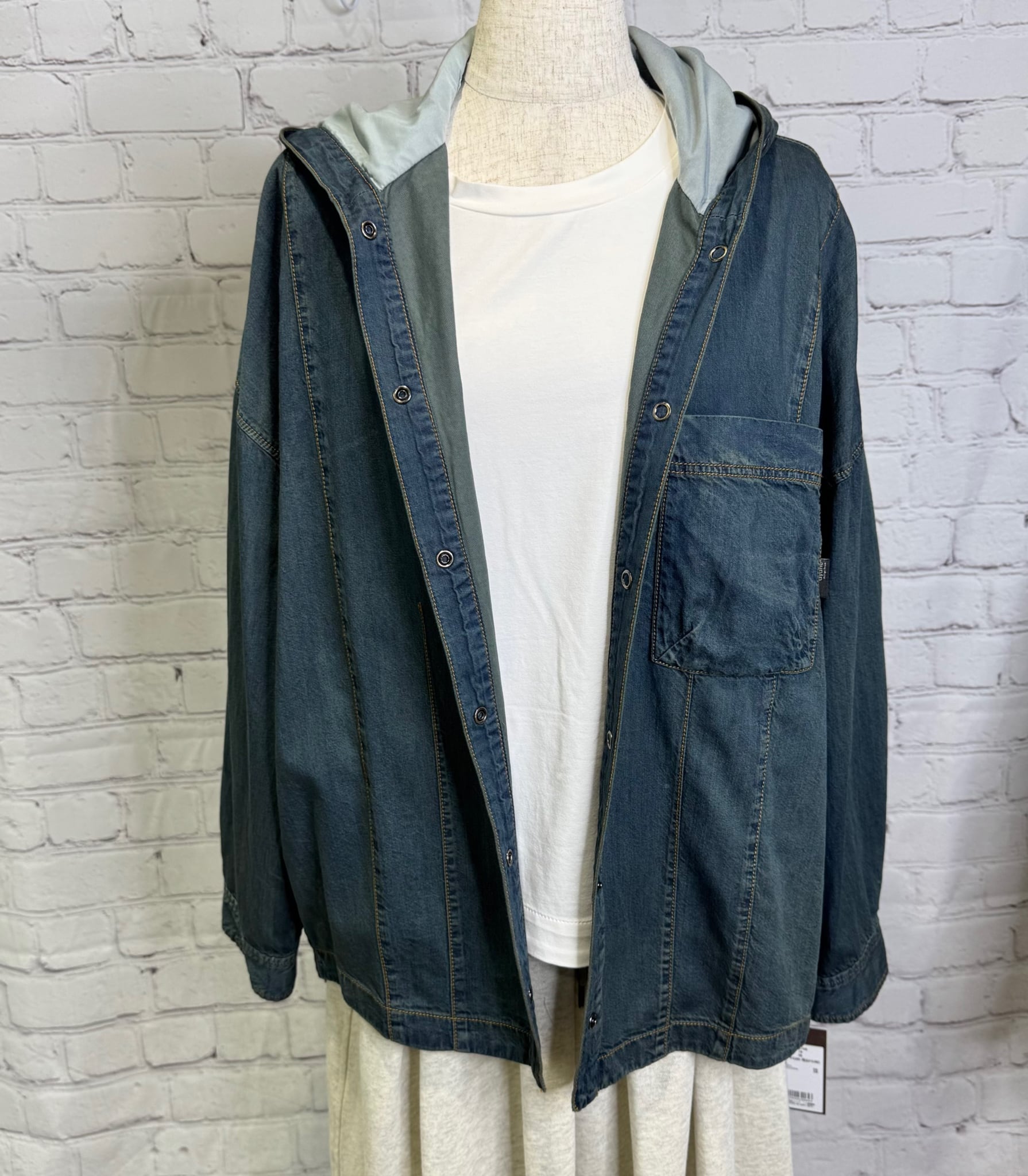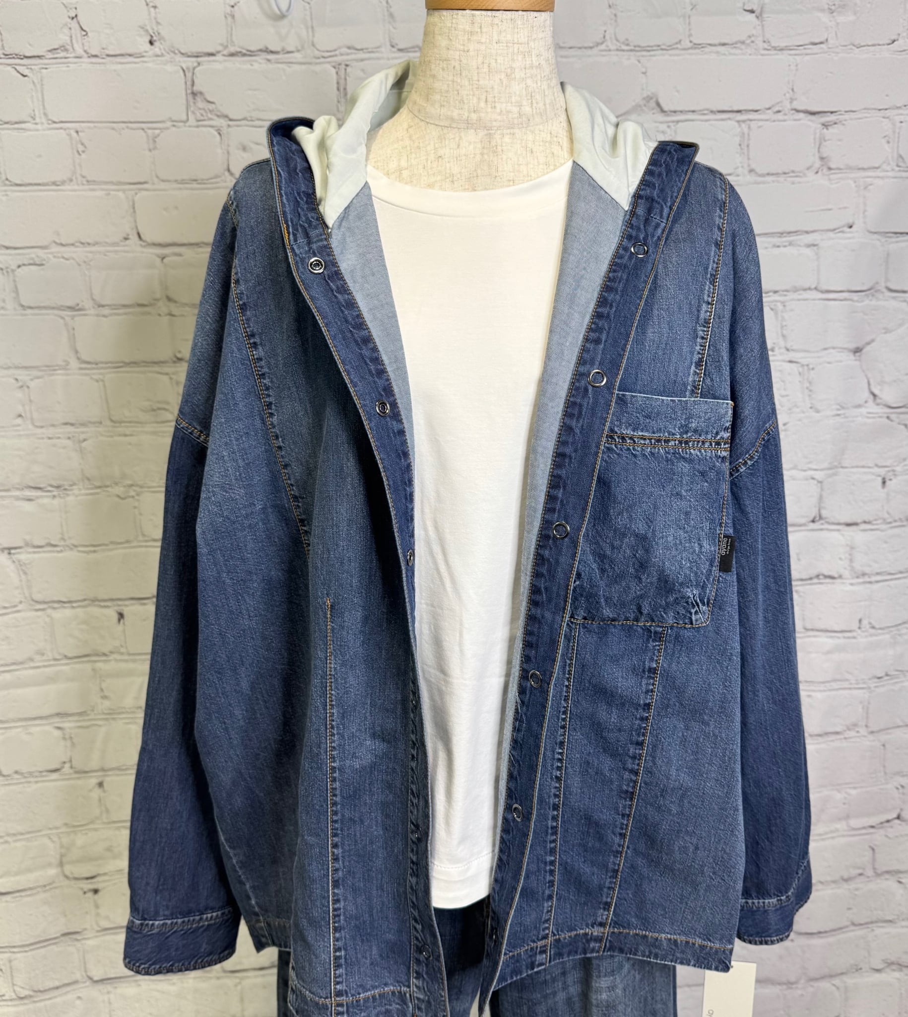 人気のダンガリーシリーズ。軽量な素材なのでストレスが無く、まだまだ暑い秋を涼しく快適に過ごせるデニムとして着用いただけます。フード付きなので、ジャケットやベストなどとのカジュアルなコーデに便利なアイテムです。お家で洗えます。