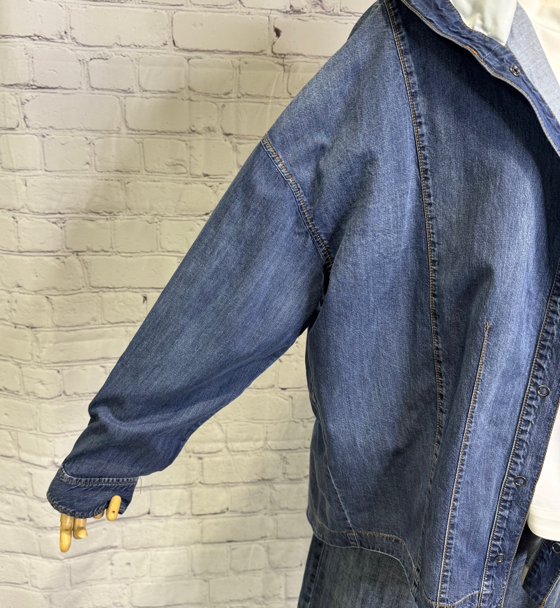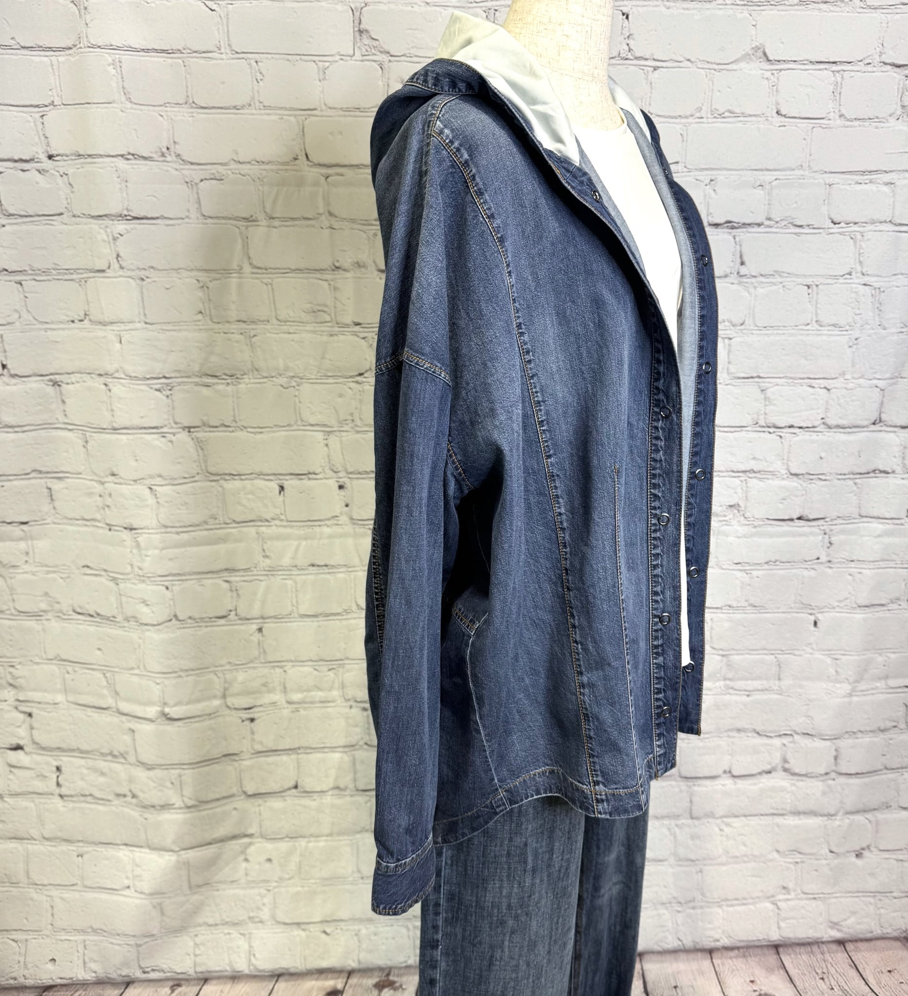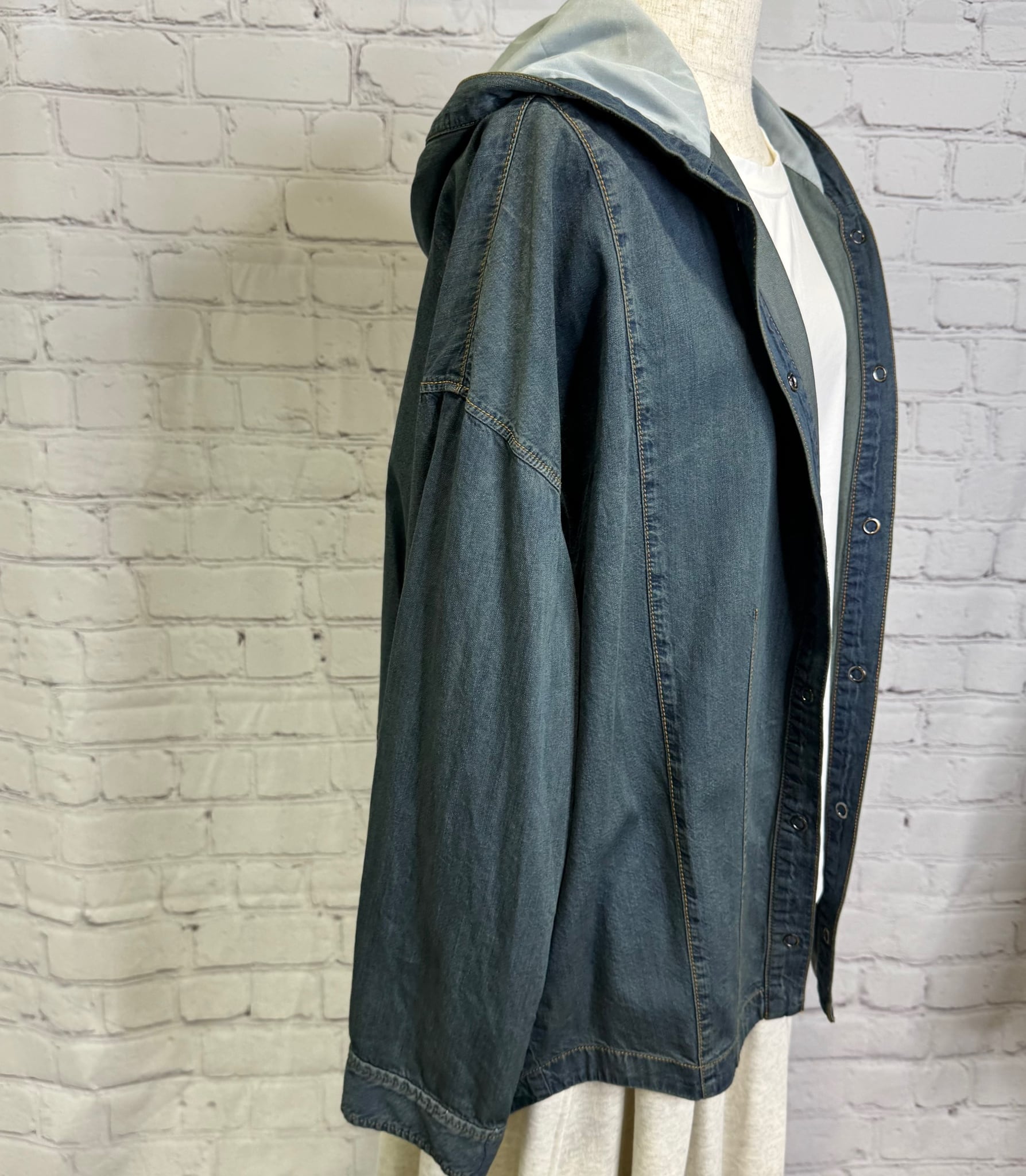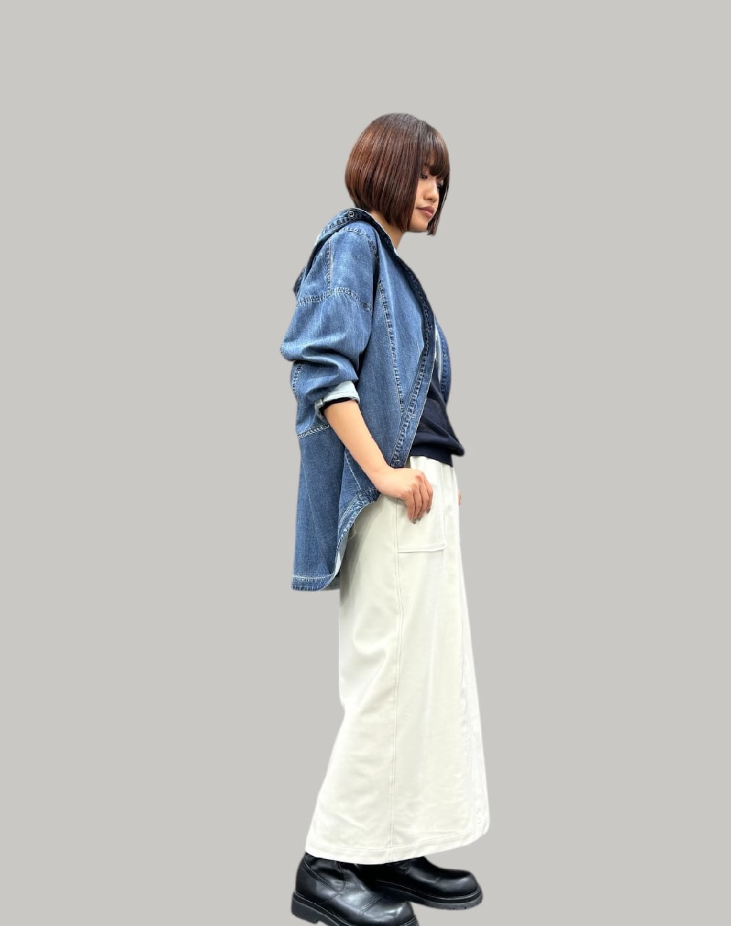 人気のダンガリーシリーズ。軽量な素材なのでストレスが無く、まだまだ暑い秋を涼しく快適に過ごせるデニムとして着用いただけます。フード付きなので、ジャケットやベストなどとのカジュアルなコーデに便利なアイテムです。お家で洗えます。