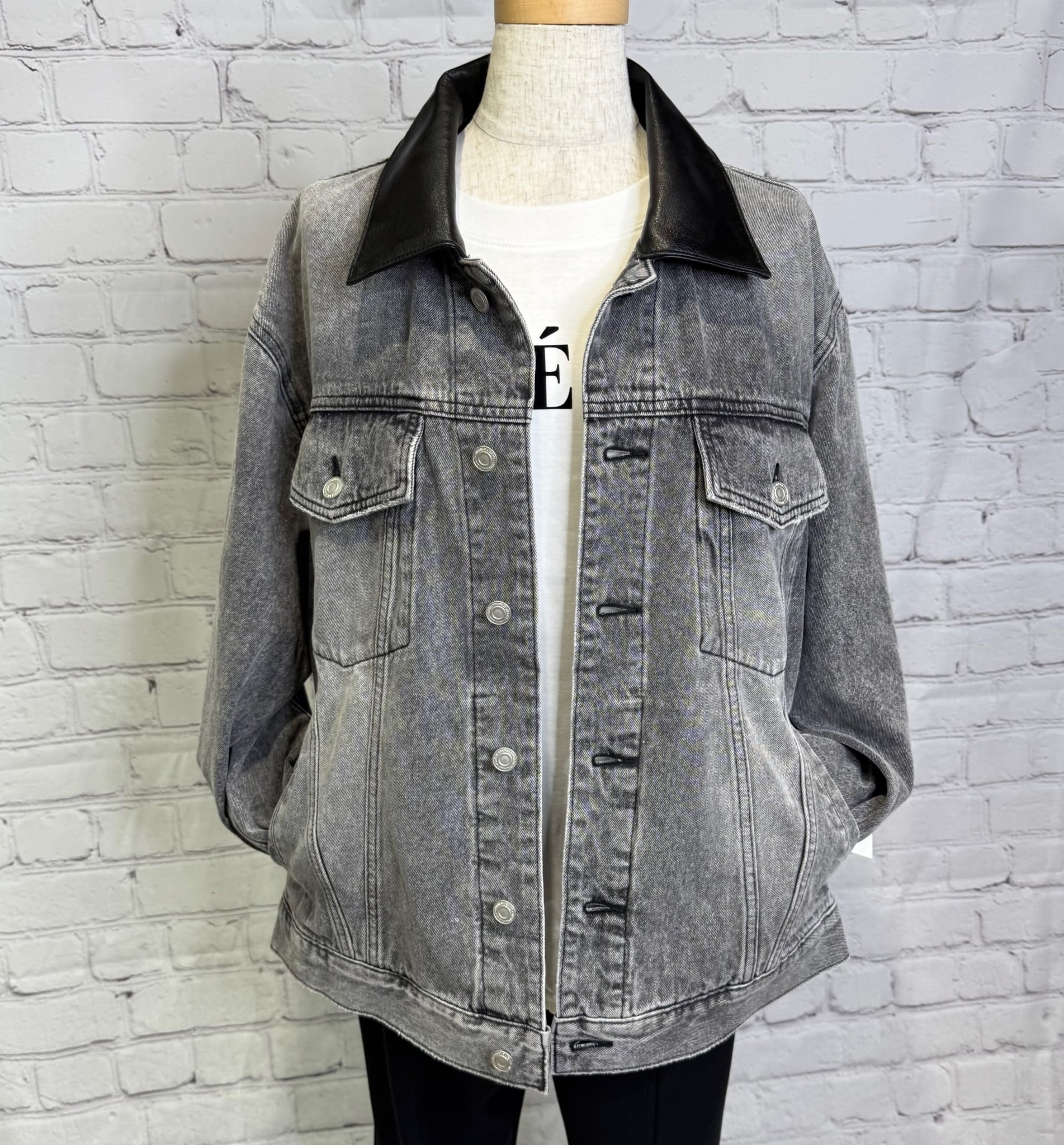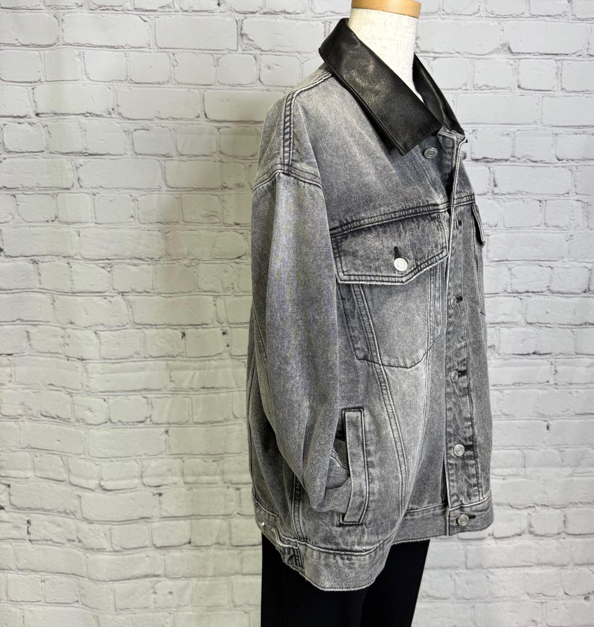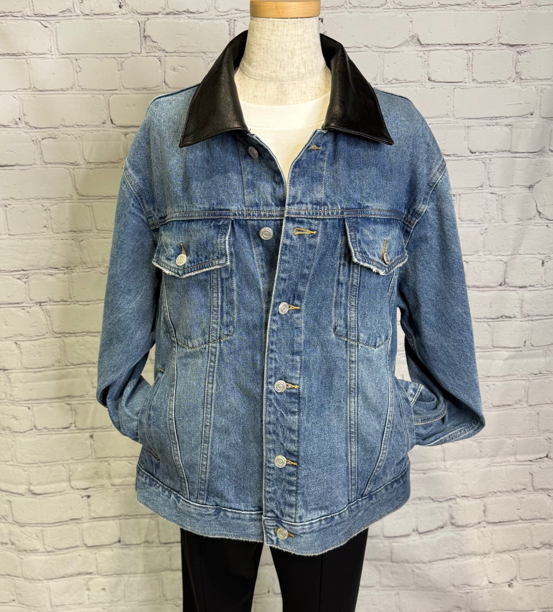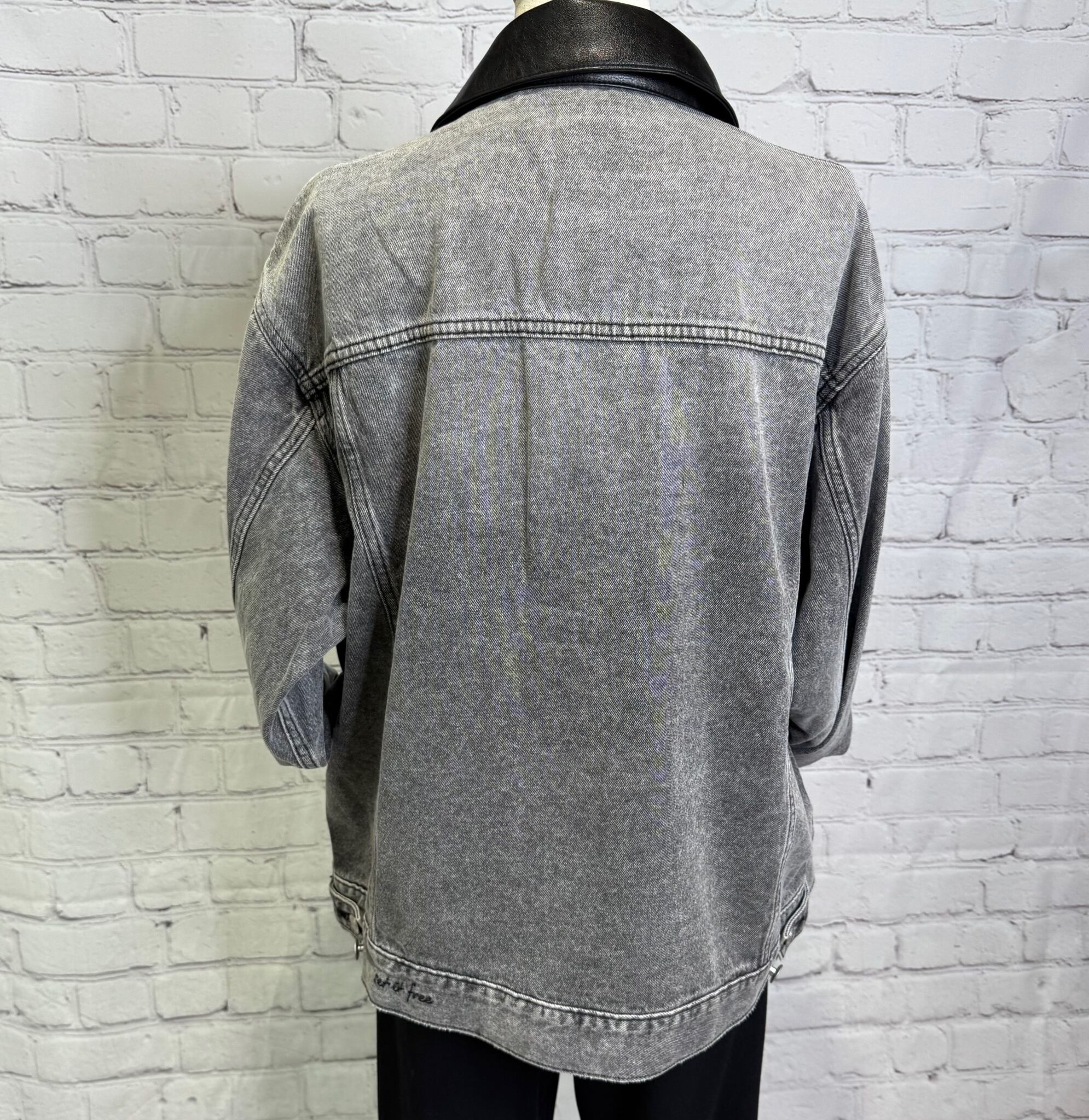 ゆったりシルエットで、程良い丈感で、ボトムを選ばずパンツでもスカートでもコーデしやすいGジャンです。合皮仕様の衿がポイントです♪ 後ろ裾のさり気ないロゴも細部にこだわったデザインです。ポケットあり。