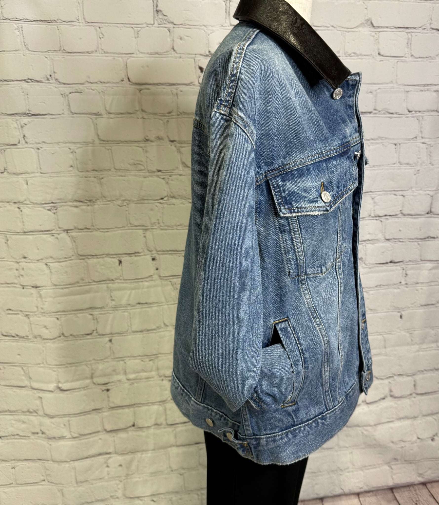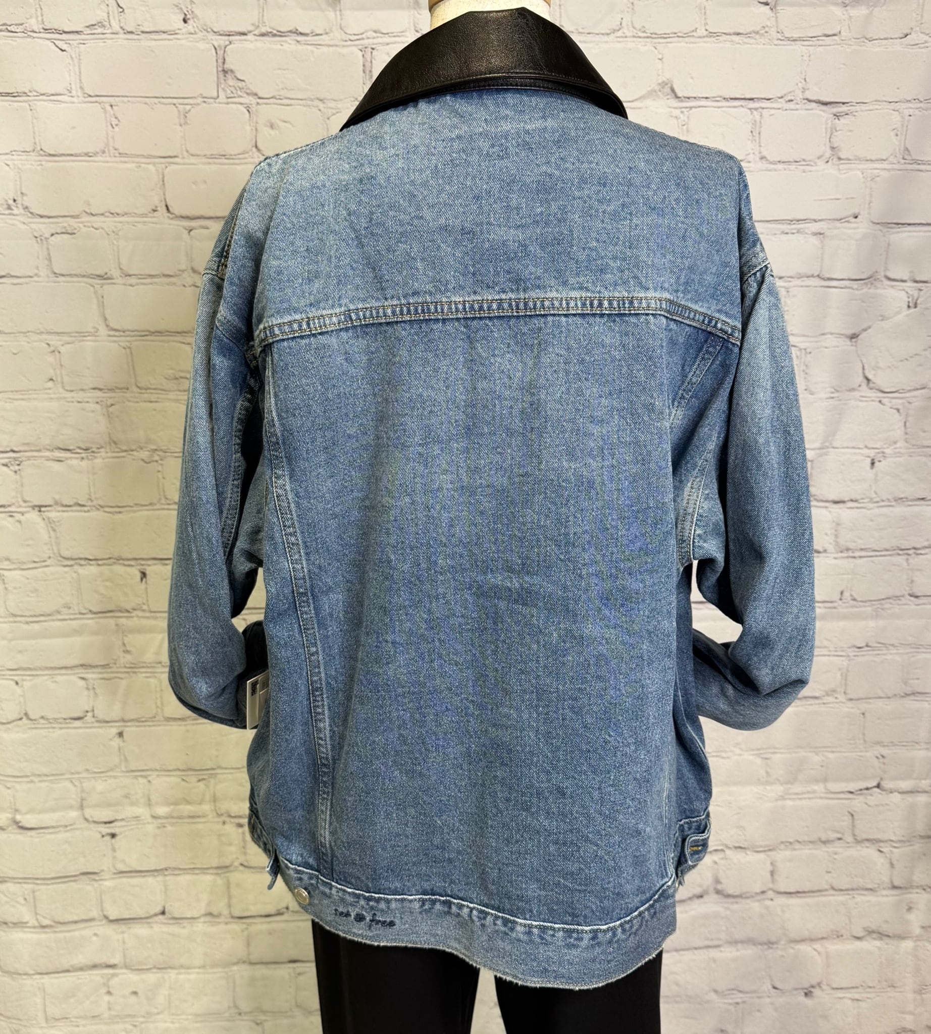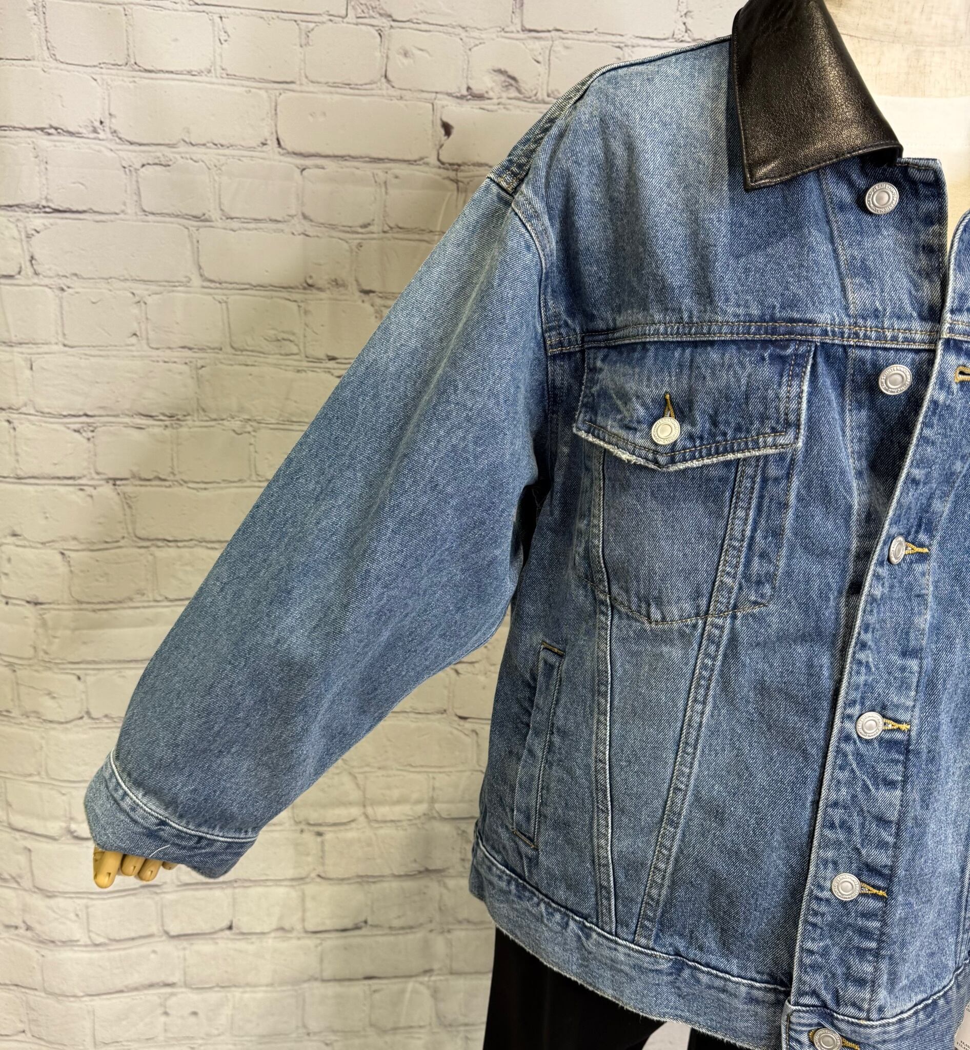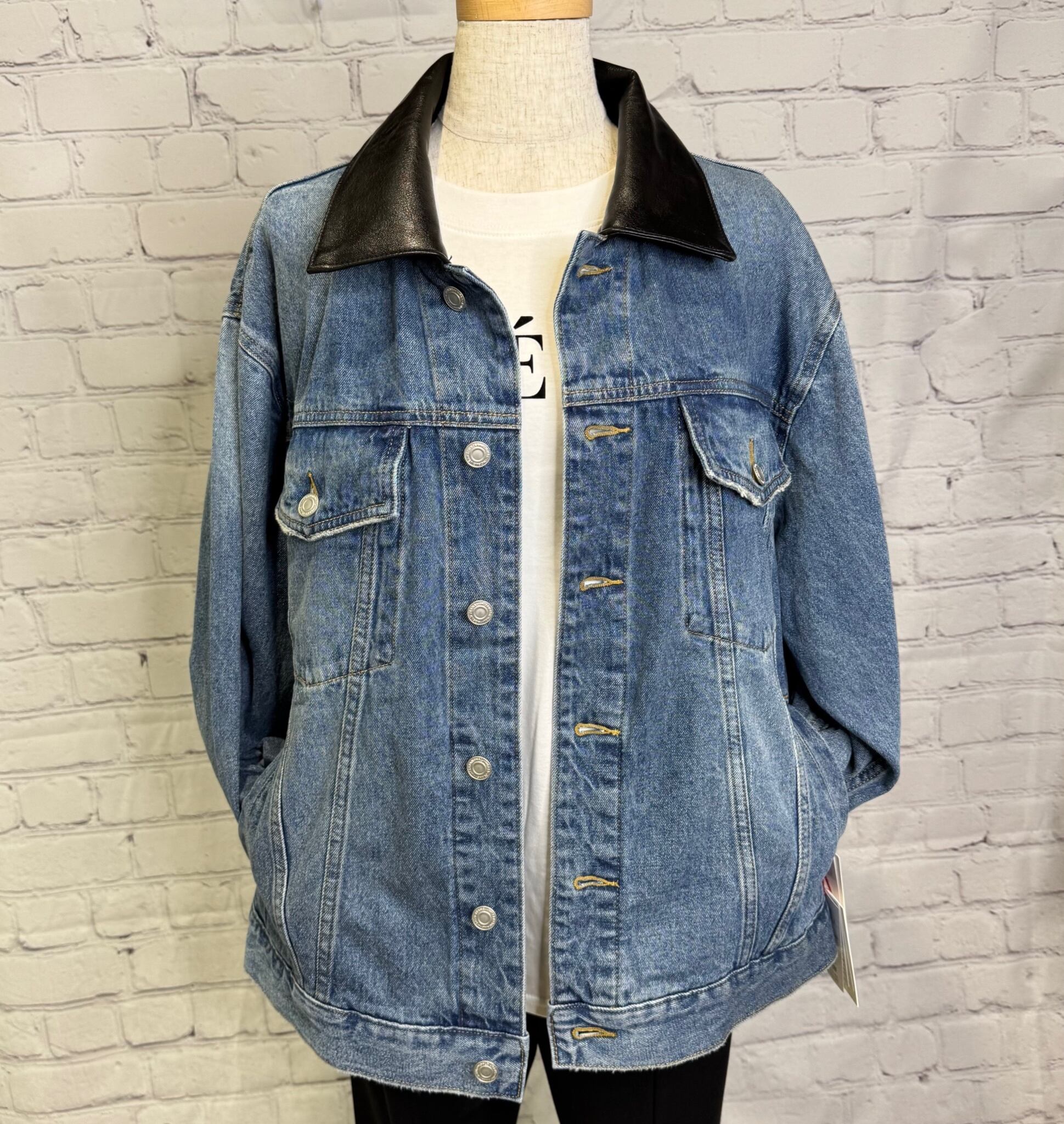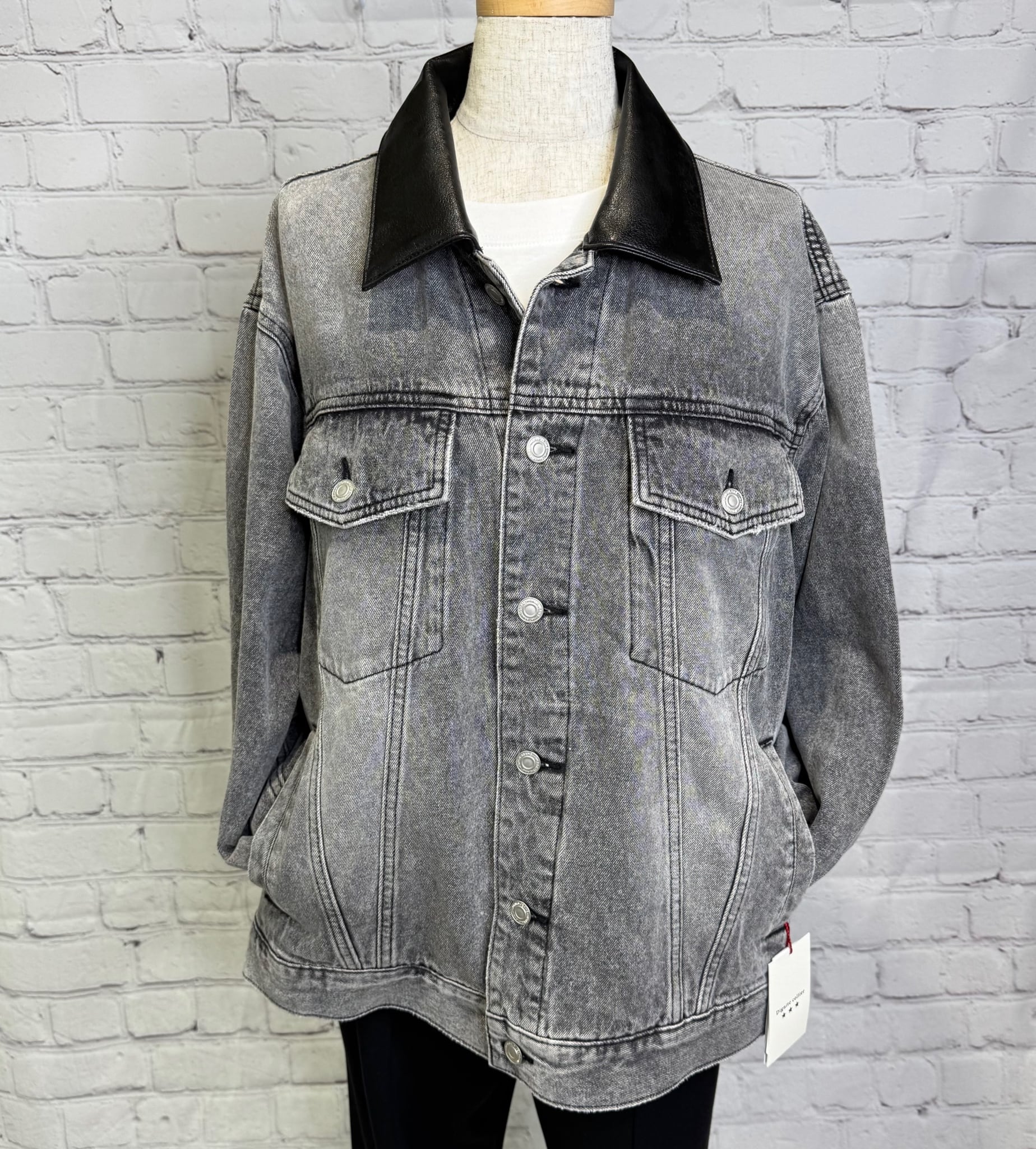 ゆったりシルエットで、程良い丈感で、ボトムを選ばずパンツでもスカートでもコーデしやすいGジャンです。合皮仕様の衿がポイントです♪ 後ろ裾のさり気ないロゴも細部にこだわったデザインです。ポケットあり。