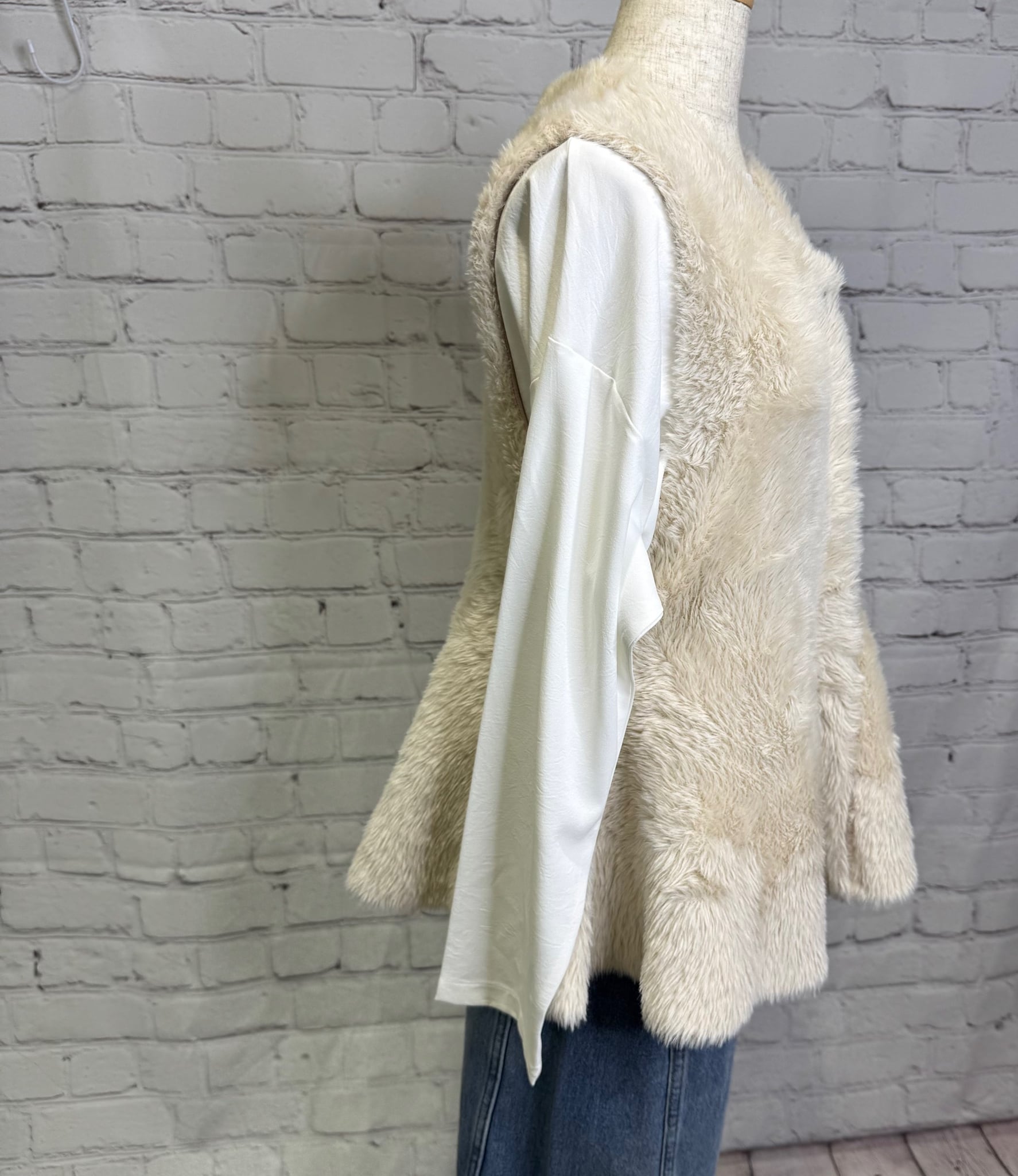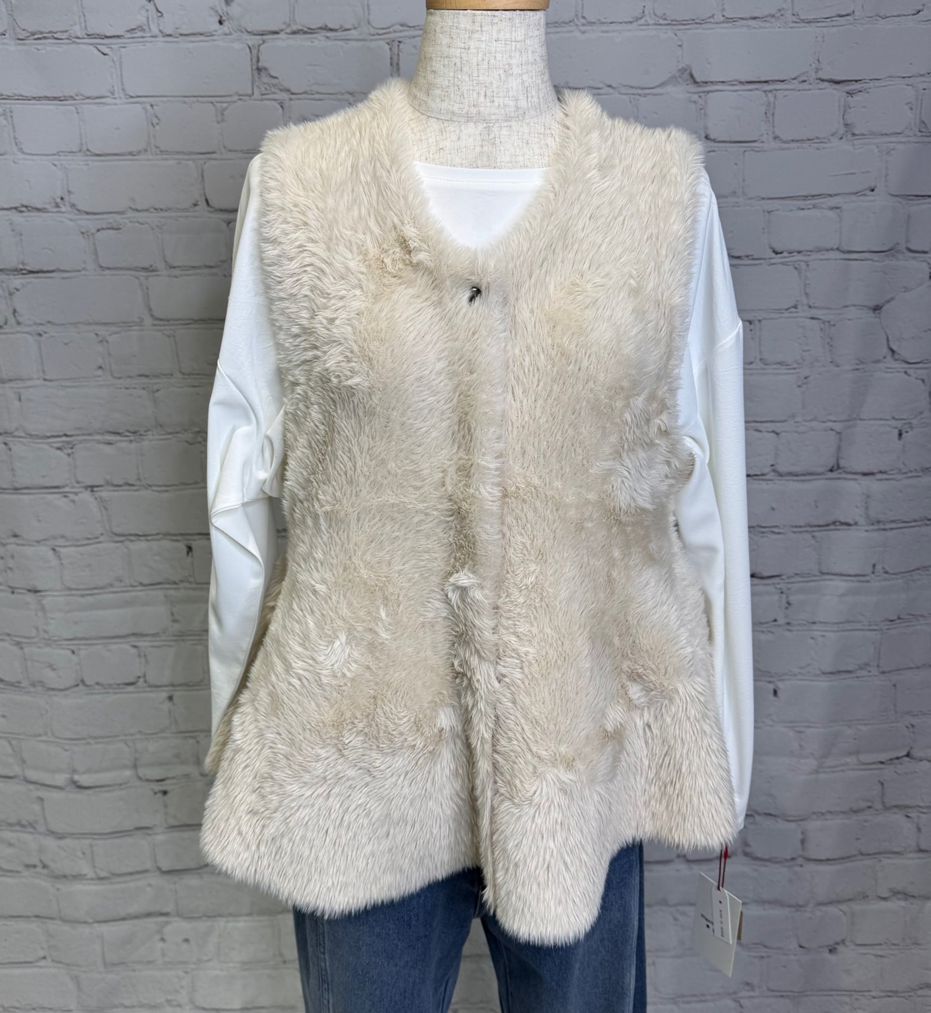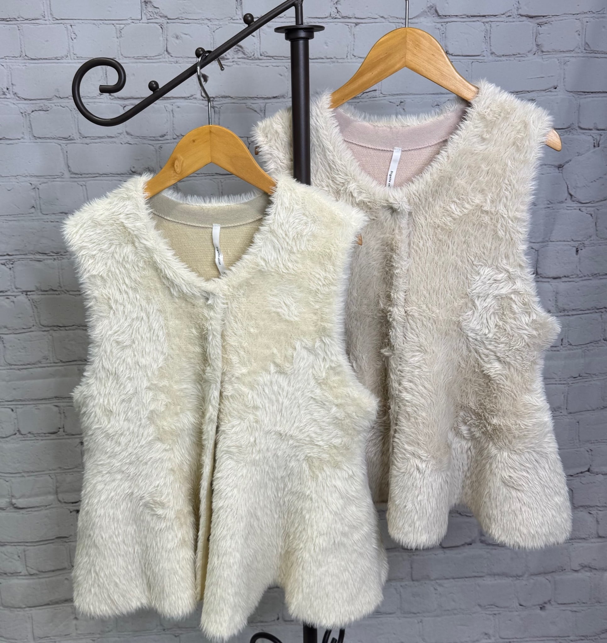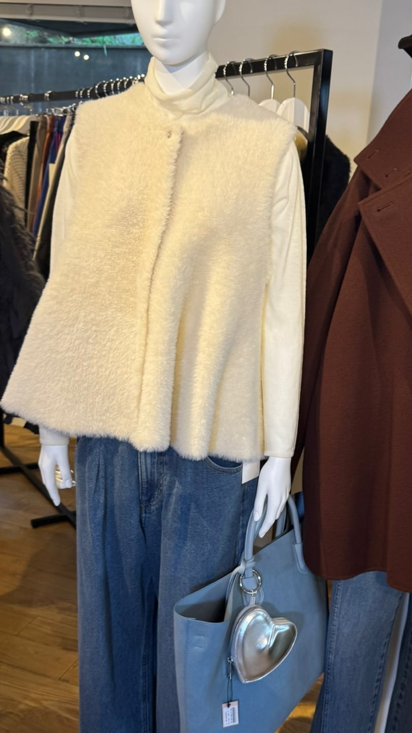 柔らかいフェザーが触り心地も良く、ペプラムデザインが女性らしいジレです。内側はニット素材になっているので軽くて着心地も良いです。フロントはスナップボタンなので、閉じてベストのように着用するのも可愛いです。いつものコーデにプラスするだけで華やかで上品見えするおすすめアイテムです。