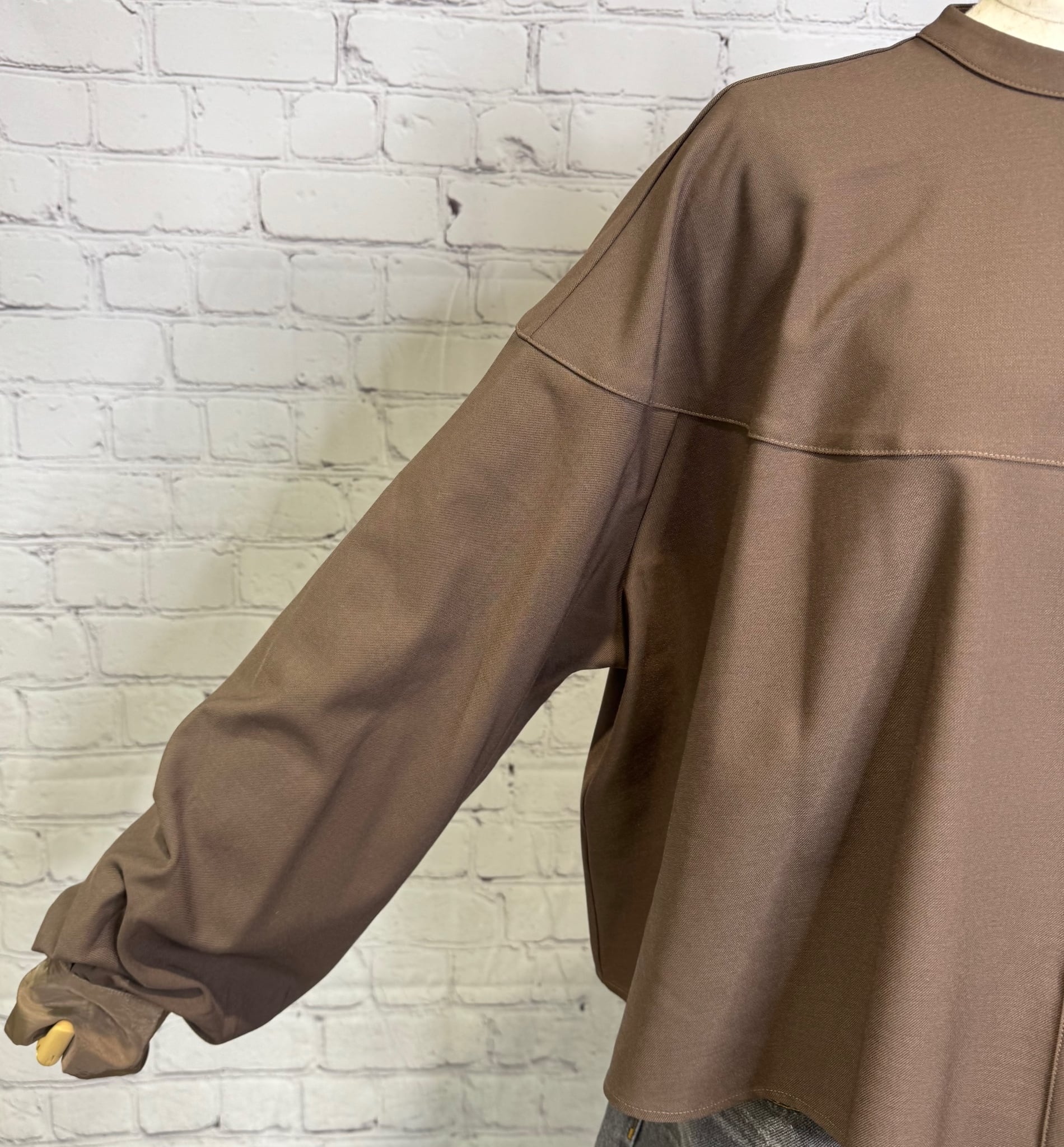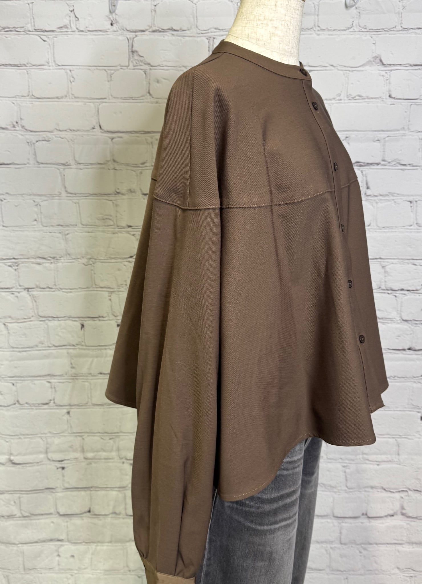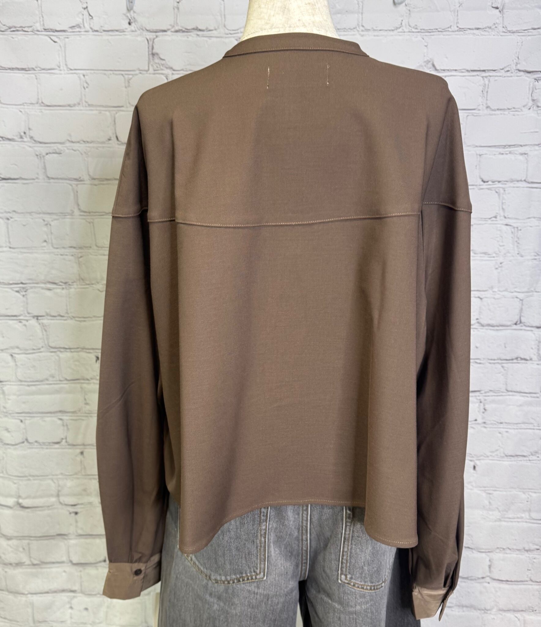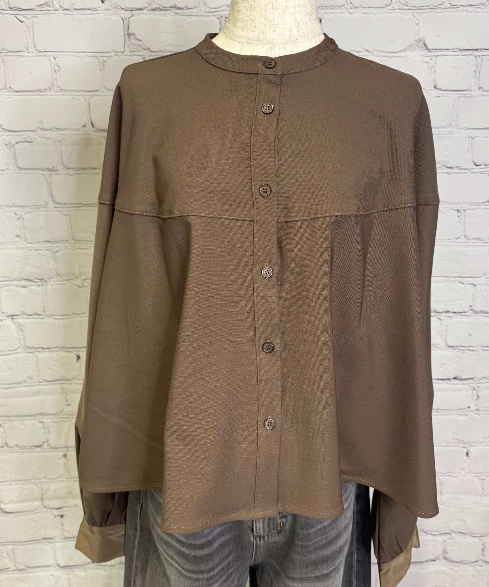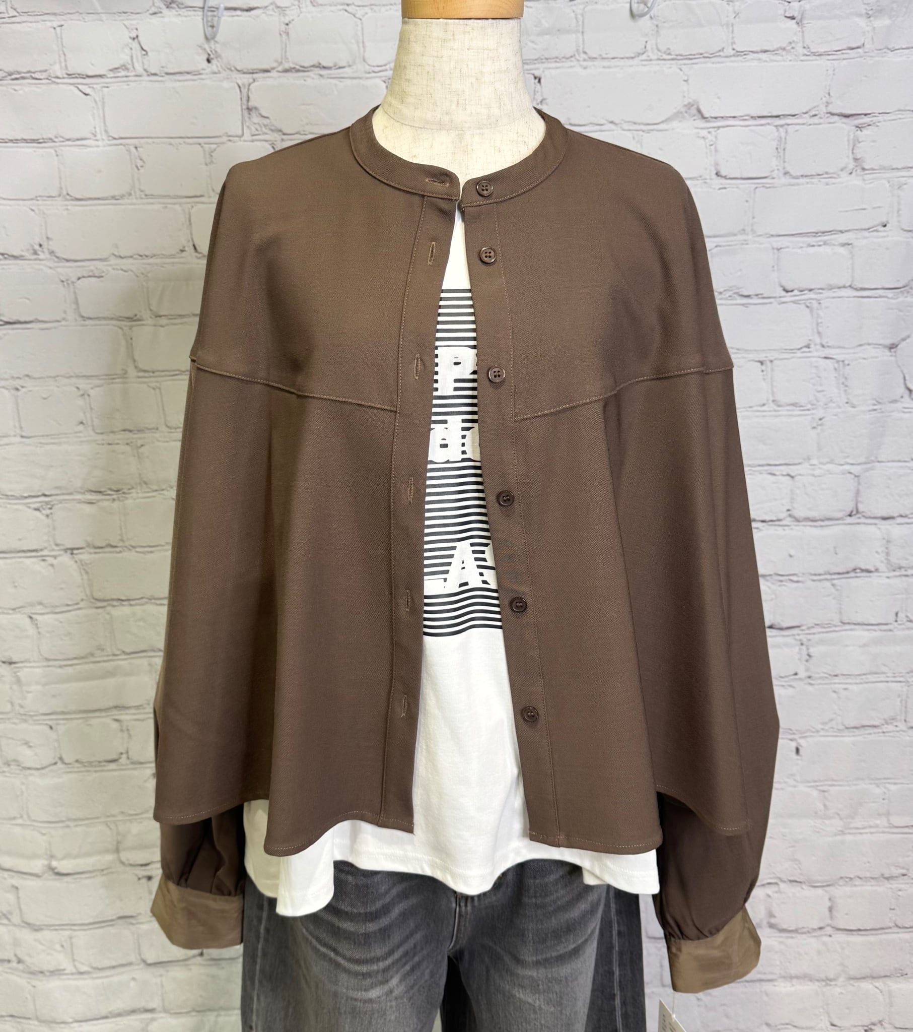 ハリのある生地でショート丈のシャツブラウスです。程よい厚さでボタンを開けて羽織りとしても着用いただけます。袖口の異素材の切替もポイント! ワイドパンツやスカートコーデとの相性◎ お家で洗えます。