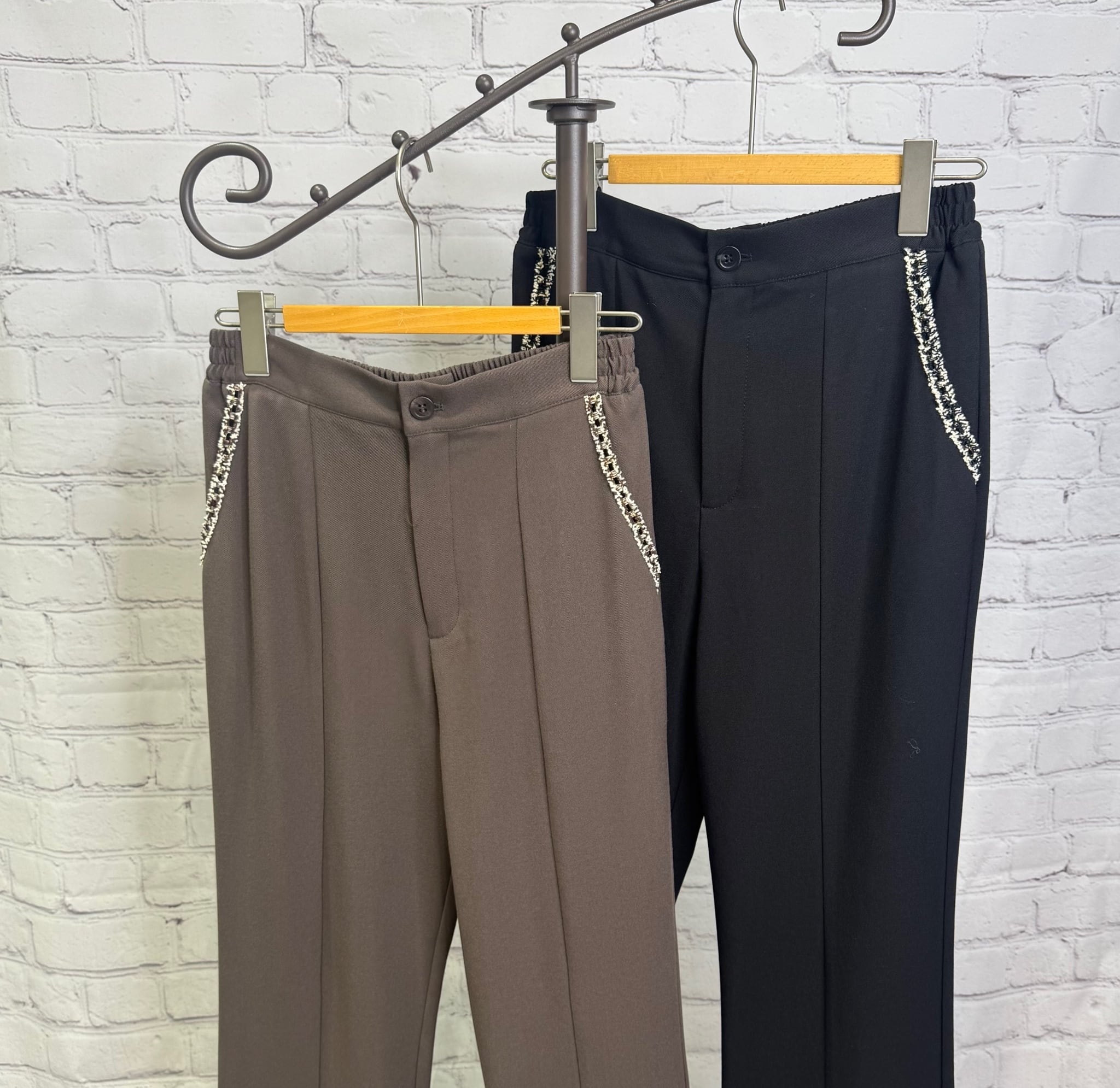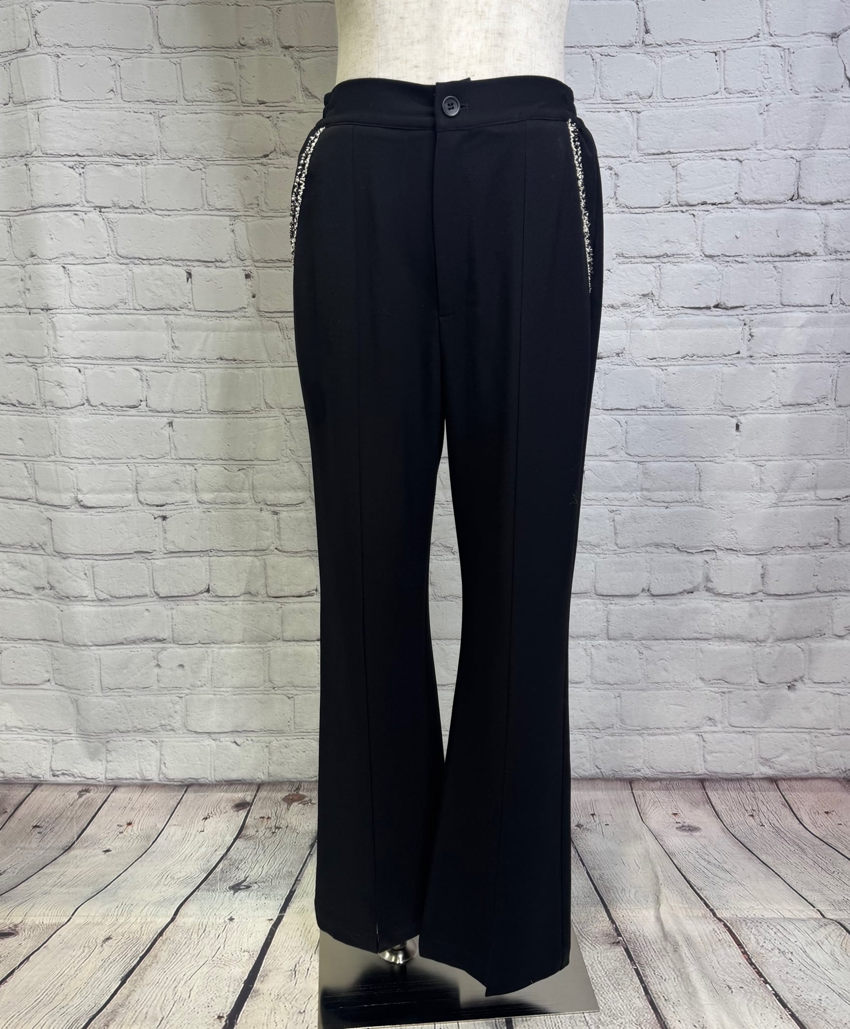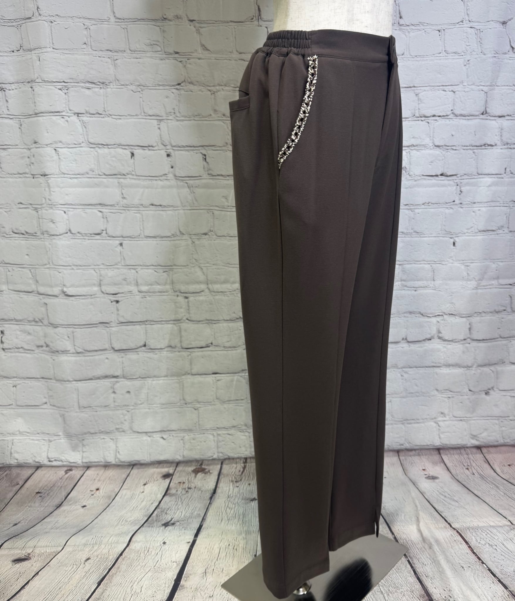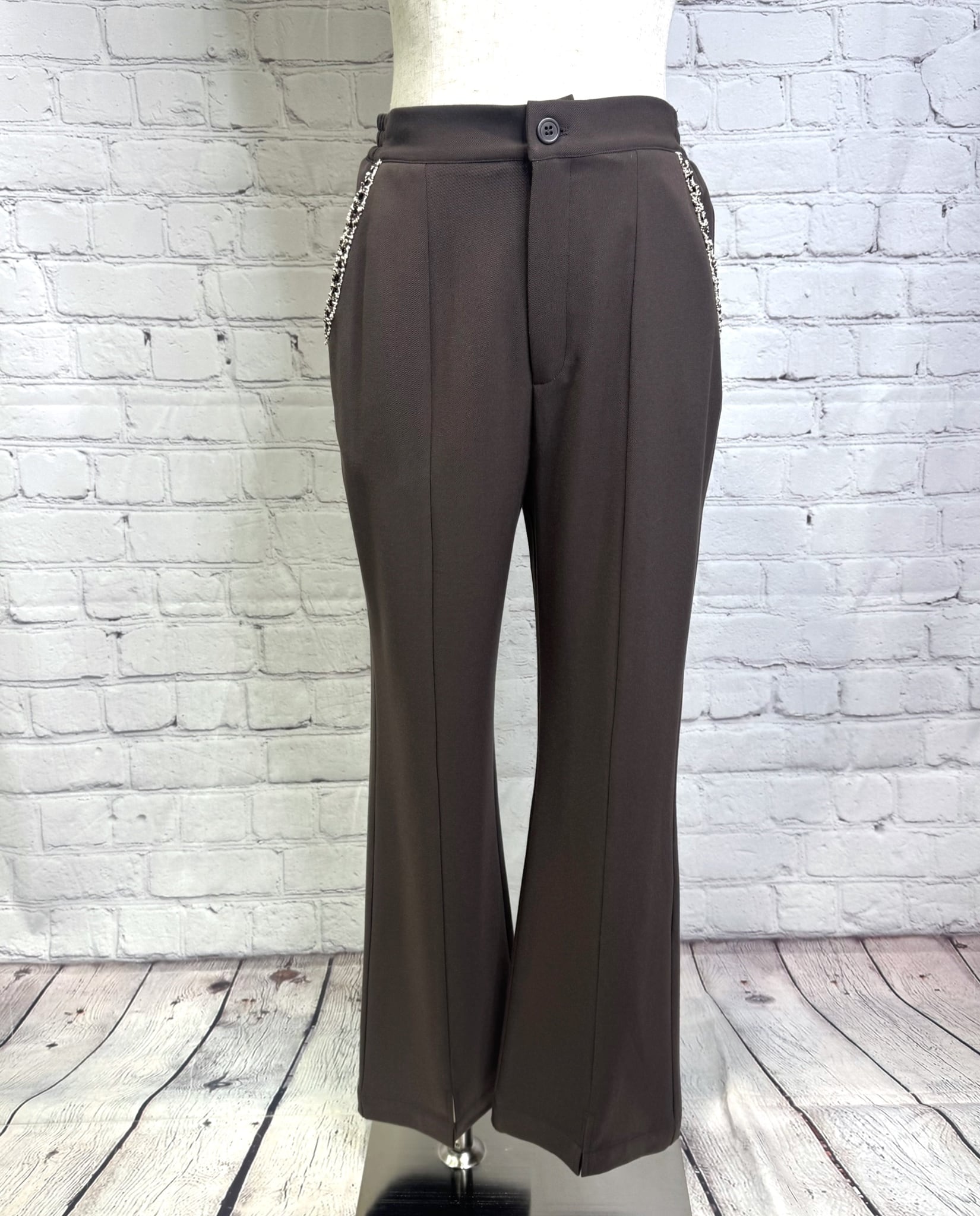 細見え効果抜群のフレアパンツです。裾フロントにスリット入りの人気のデザイン。ウール見えするきれいめ上品なパンツでオンオフ活躍してくれます。ポケットデザインポイントです♪ お家で洗えます。