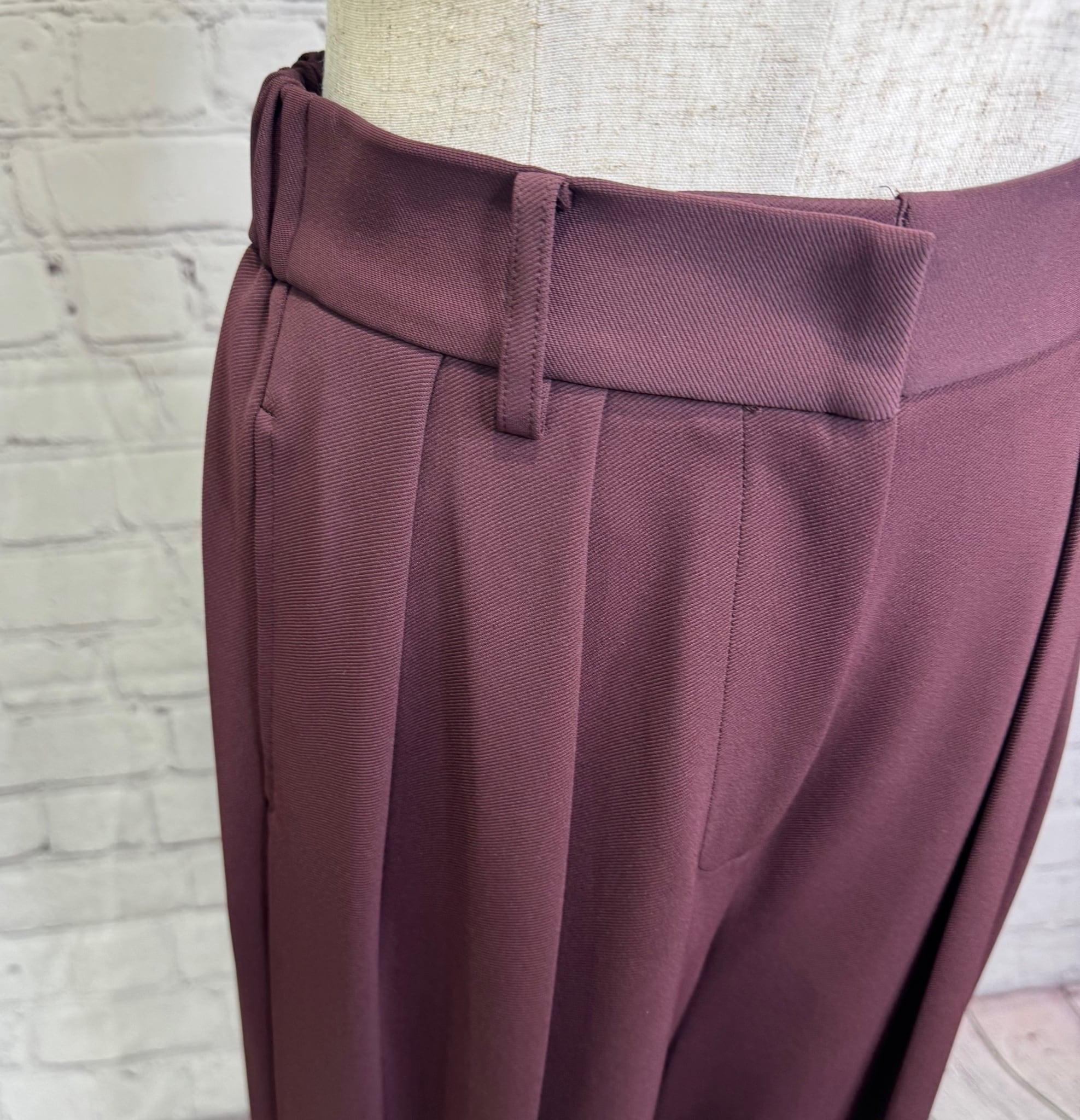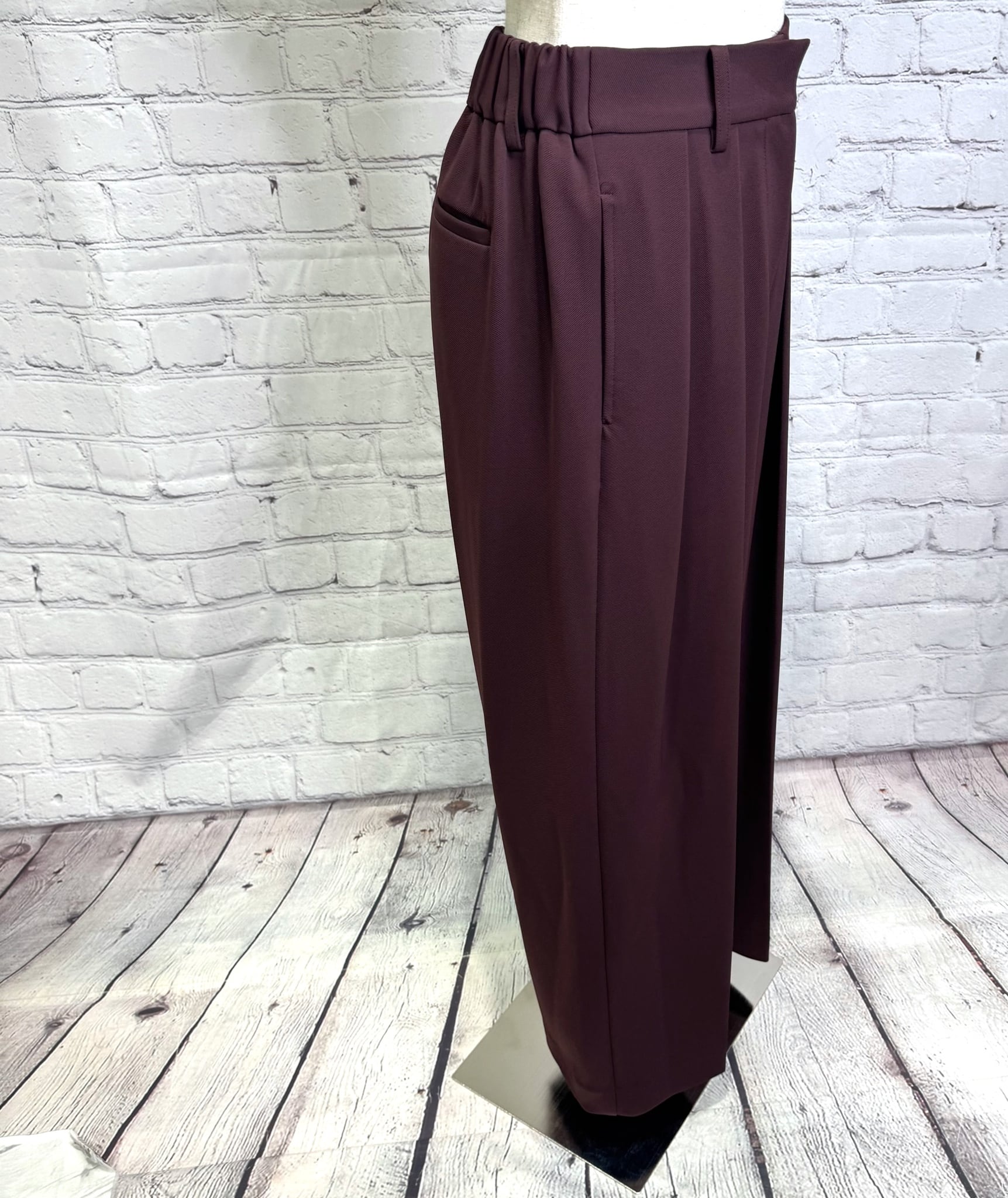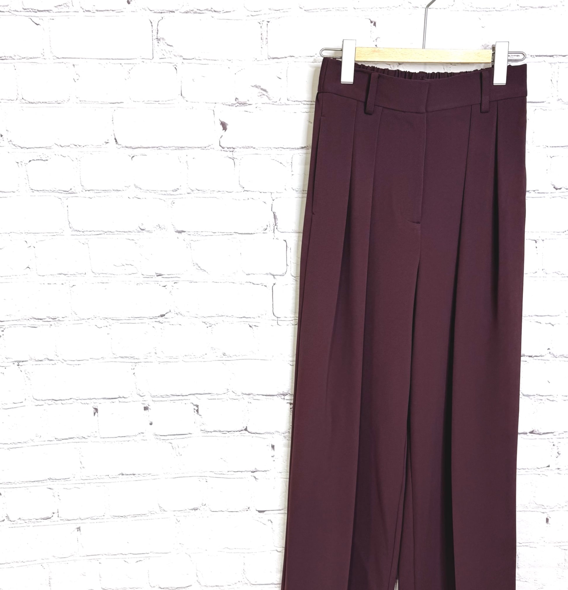 シルエットがとても綺麗なワイドパンツです。ウエスト後ろ部分がゴムで楽ちん、ウエストフロント部分はスッキリ見えする仕様になっていて、合わせるトップス次第できれいめにもカジュアルにもなり活躍してくれる優秀アイテムです。ポケットあり。お家で洗えます。