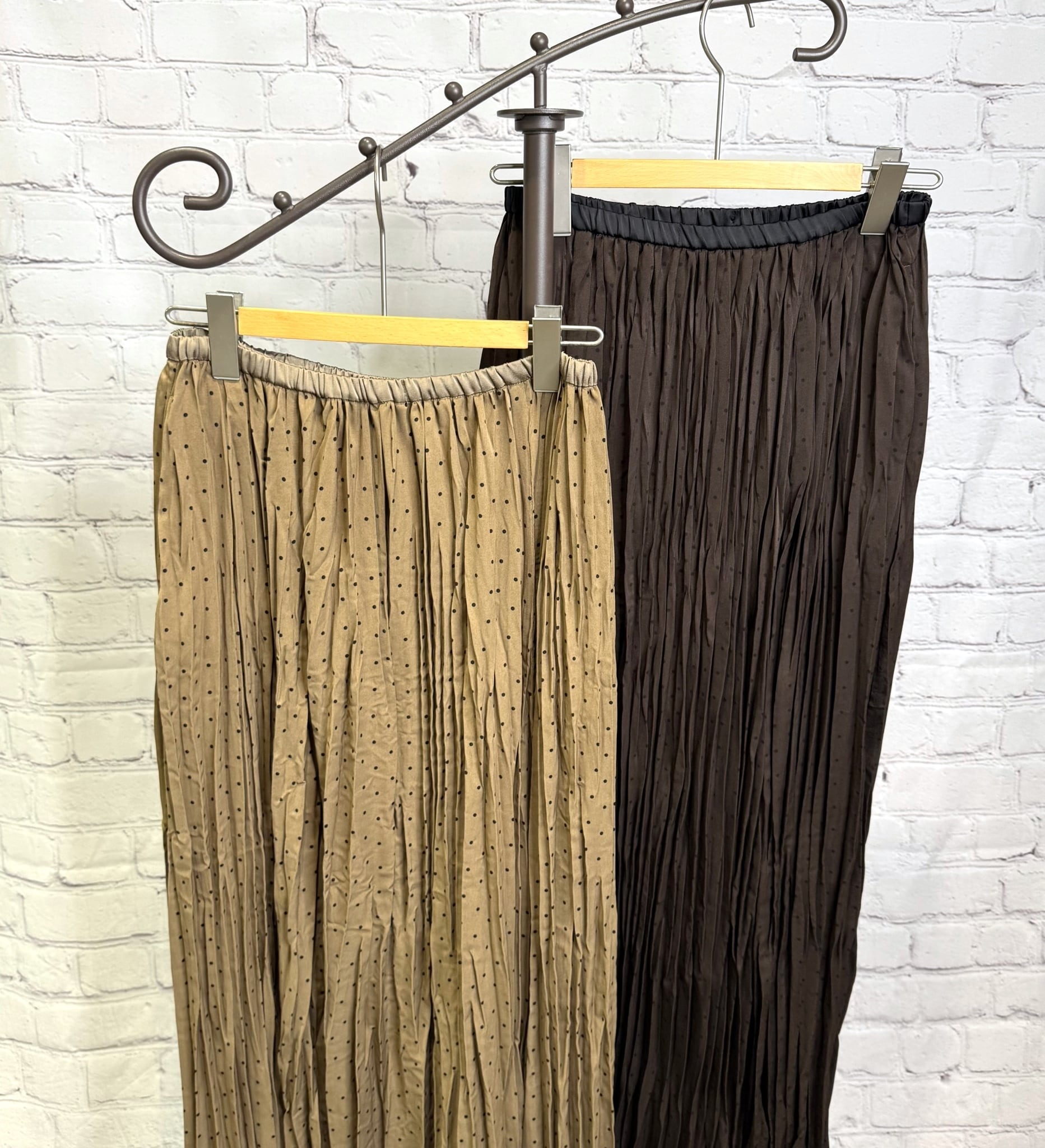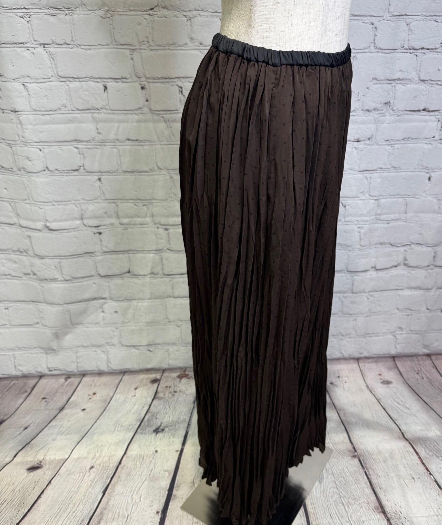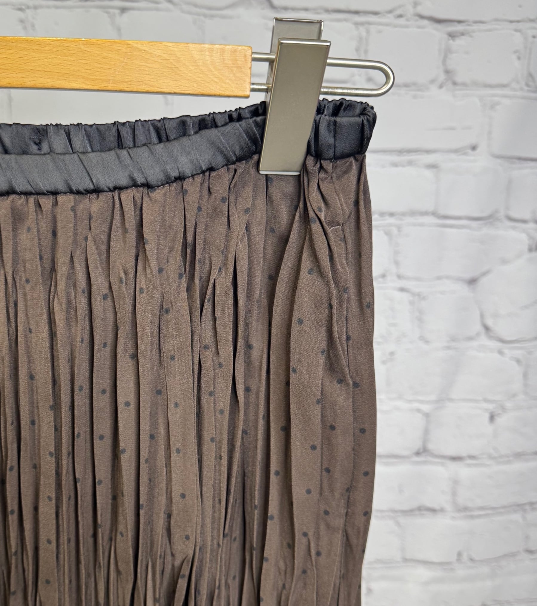 ランダムプリーツが女性らしいスカートです。小さめドット柄が上品見えしてくれて合わせるトップス次第できれいめにもカジュアルにもコーデしやすくておすすめです。ウエストゴムで楽ちん!ポケットあり。