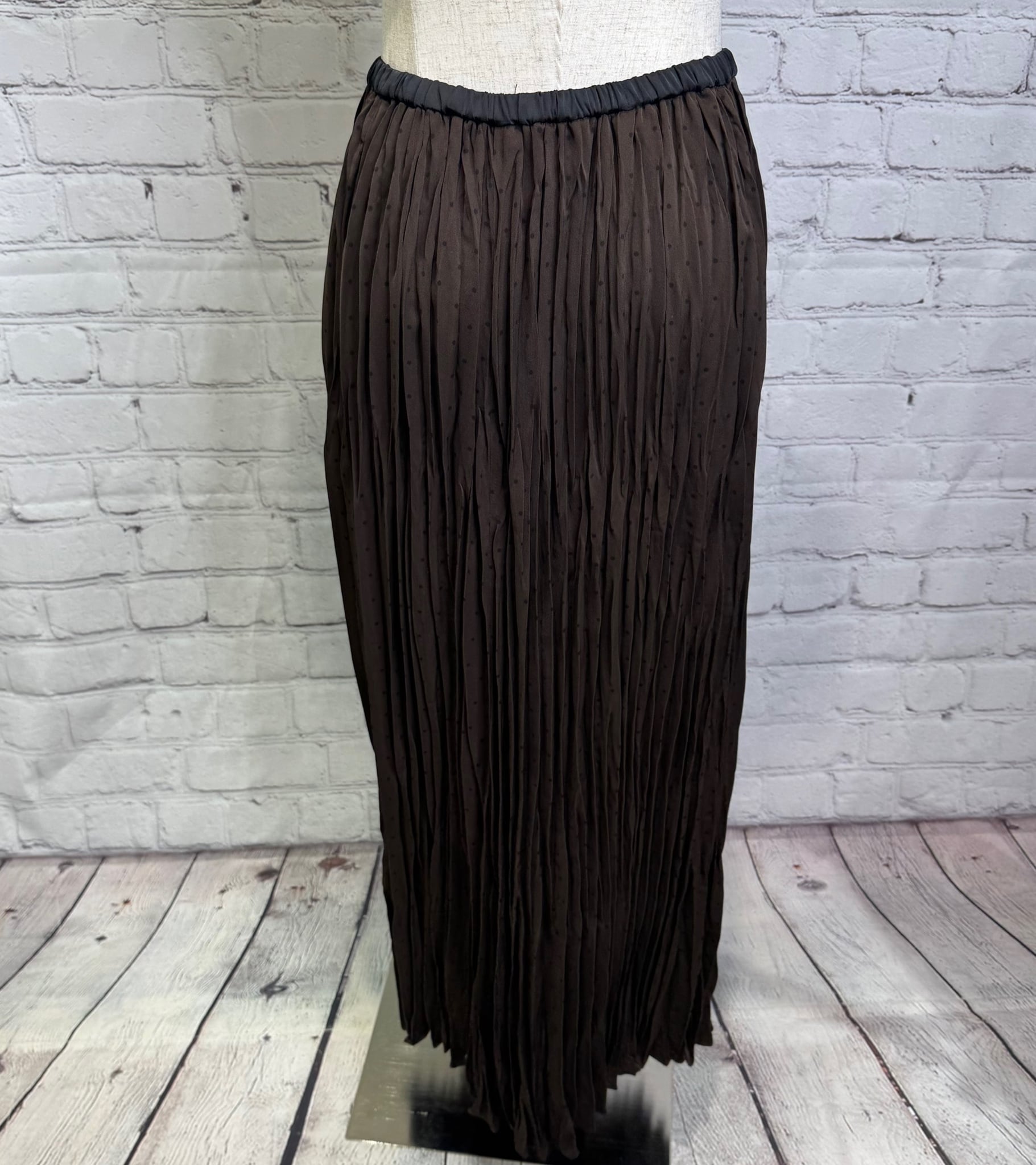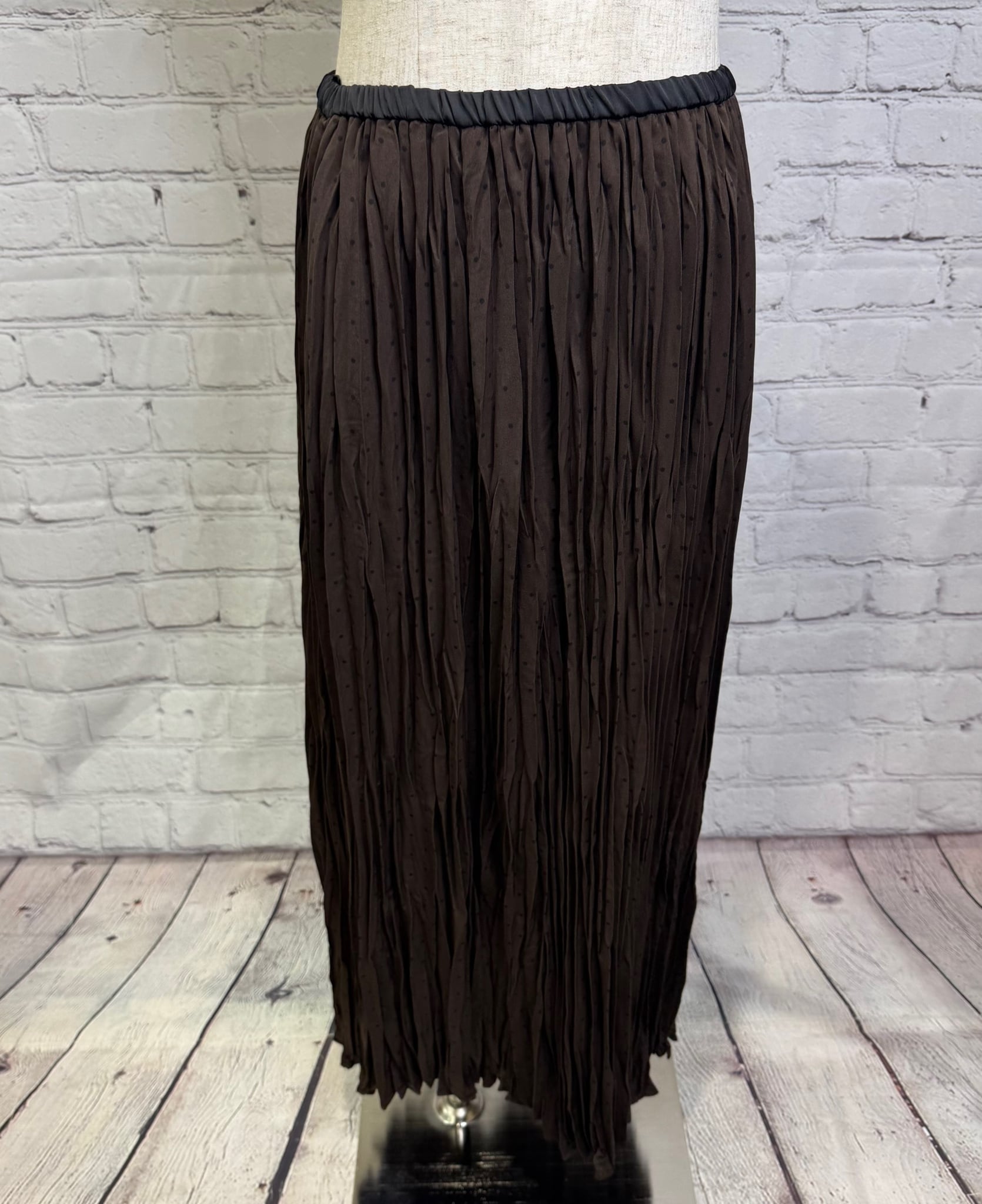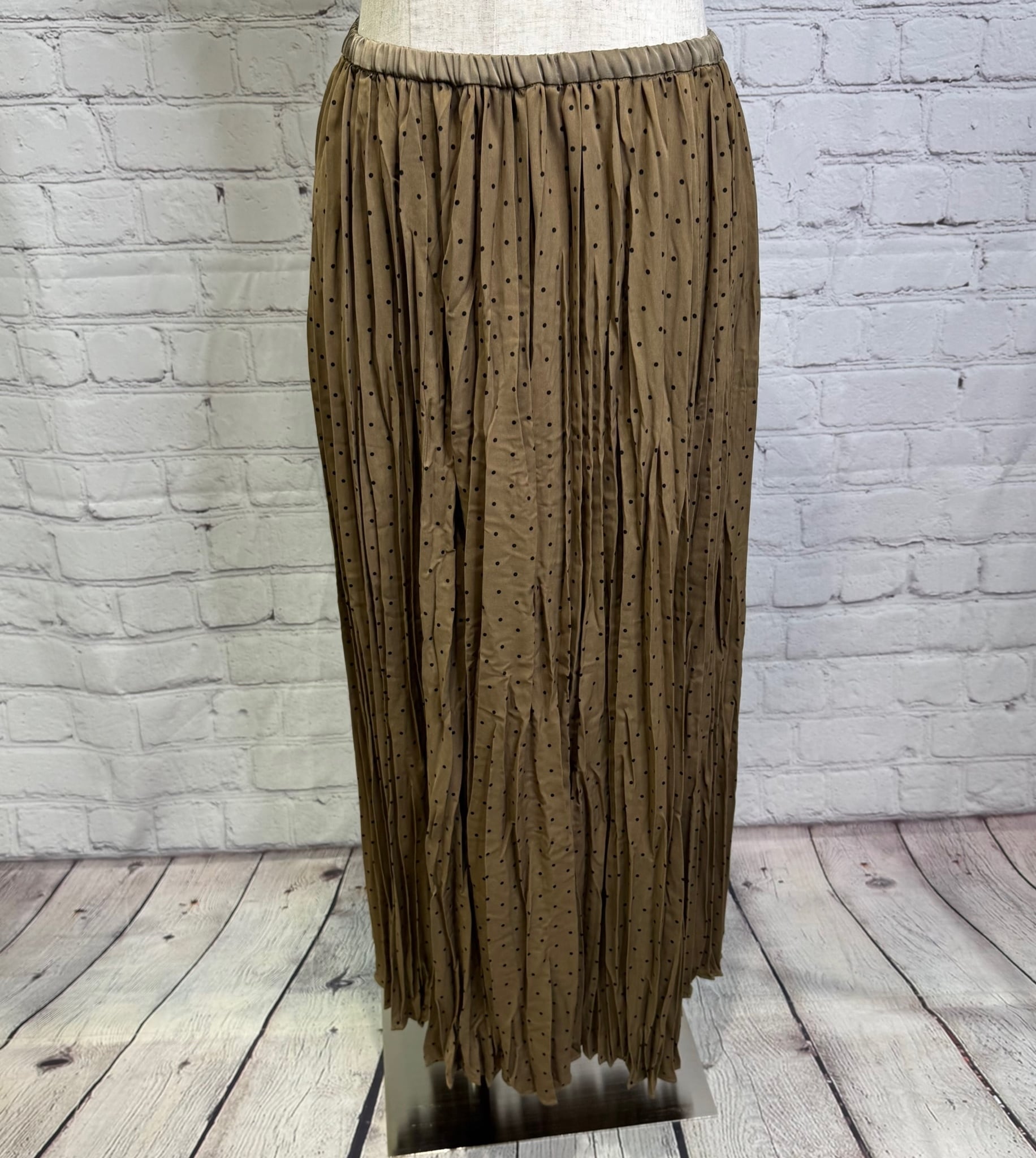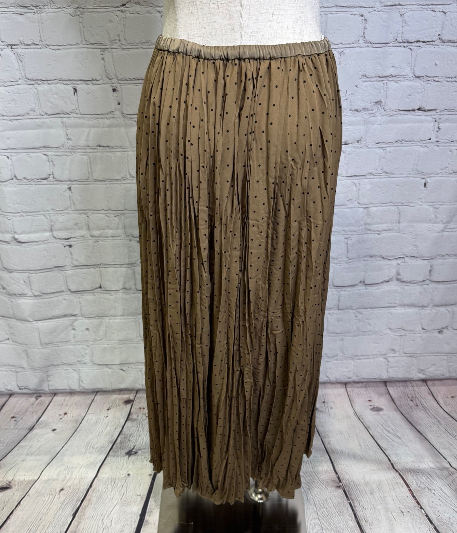 ランダムプリーツが女性らしいスカートです。小さめドット柄が上品見えしてくれて合わせるトップス次第できれいめにもカジュアルにもコーデしやすくておすすめです。ウエストゴムで楽ちん!ポケットあり。