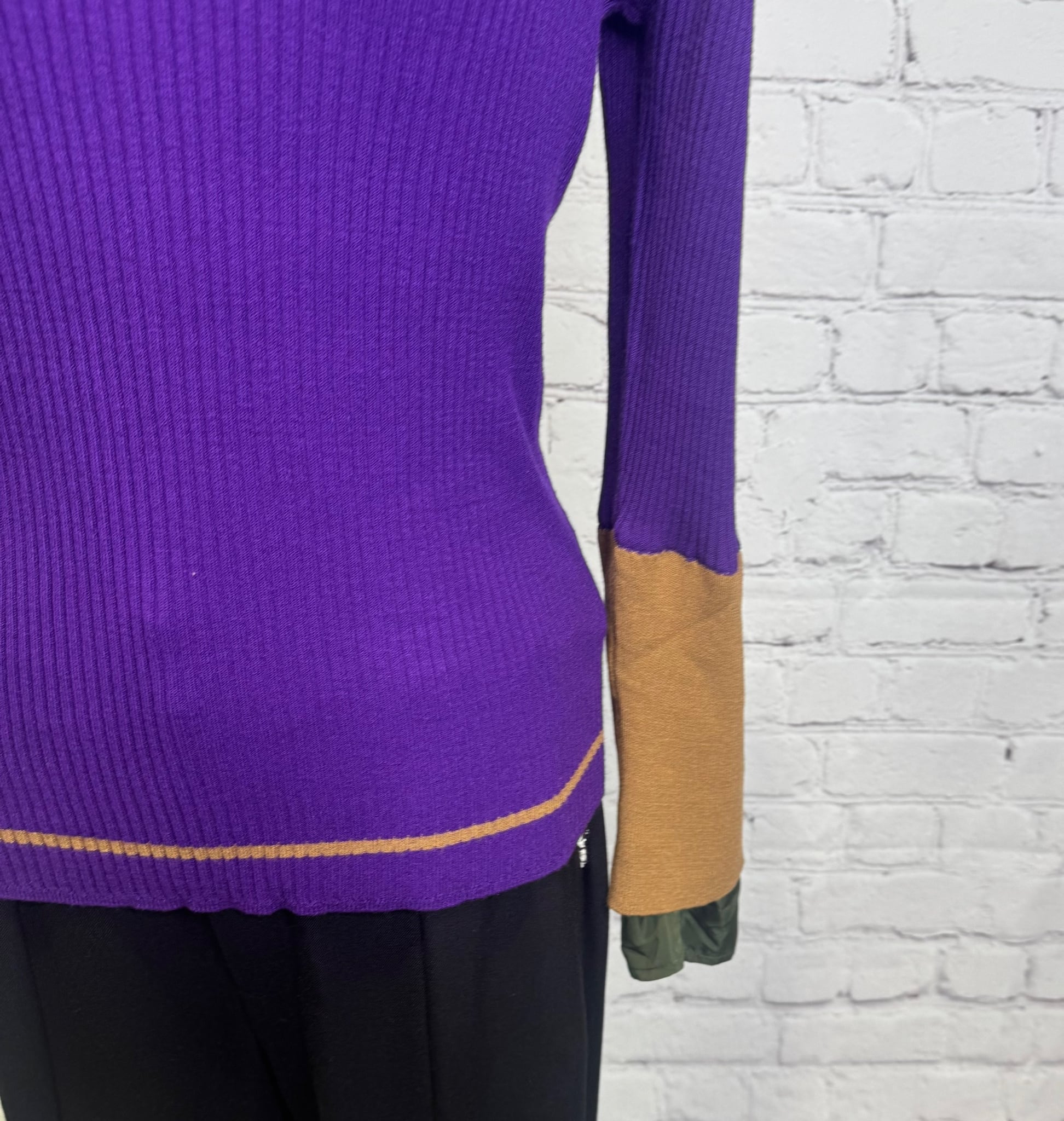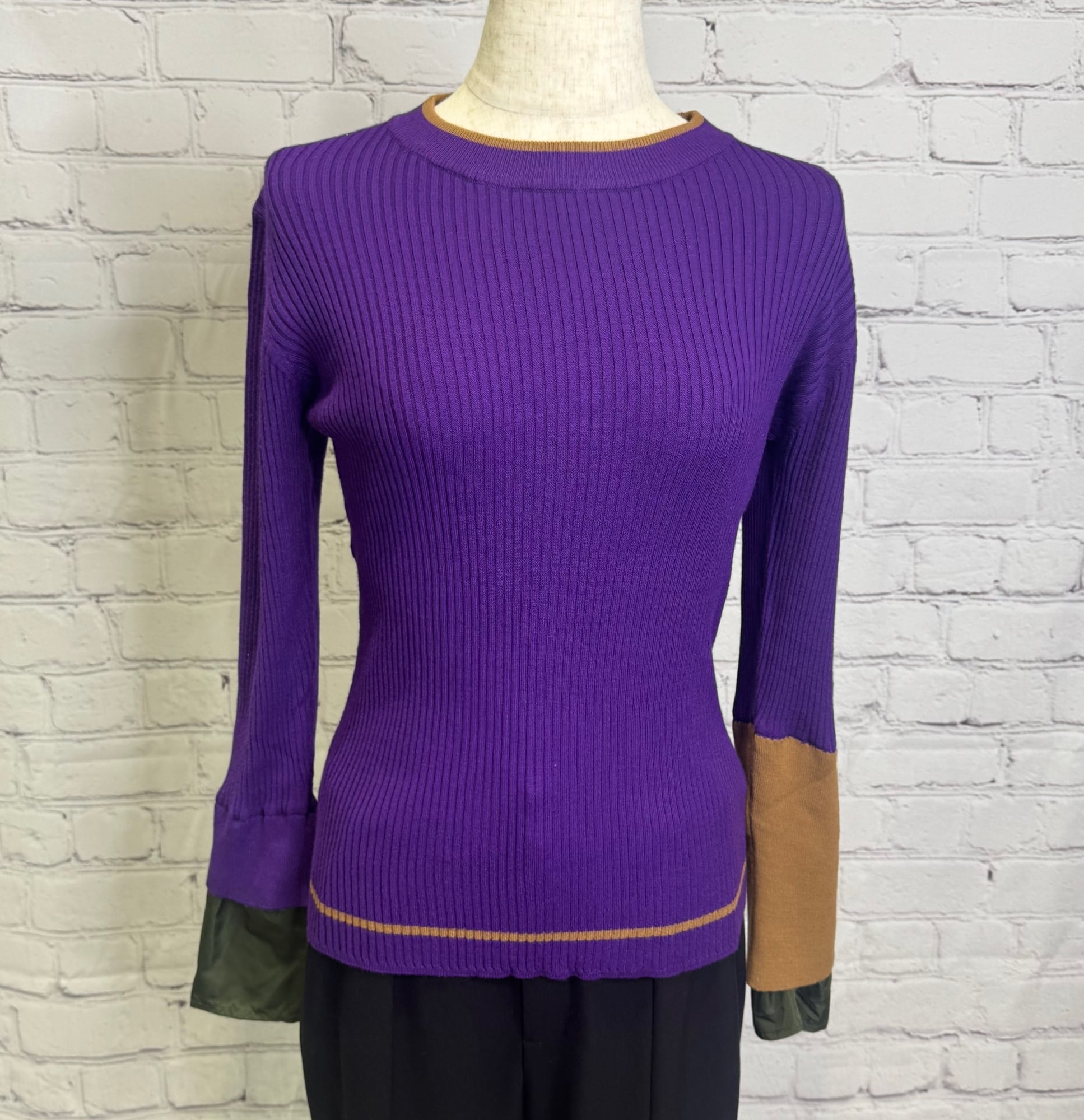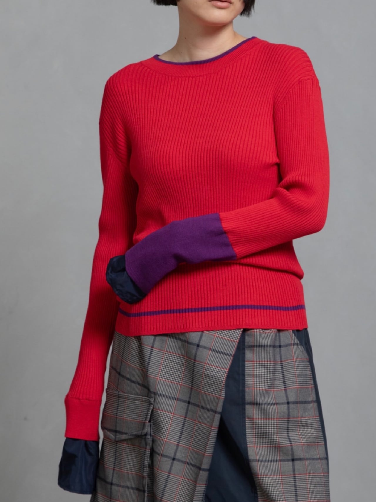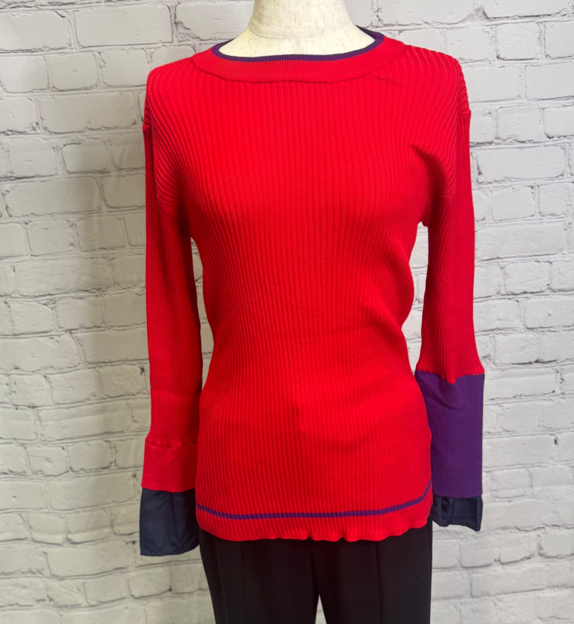 鮮やかなトレンドカラー配色が今年らしく、袖の配色がポイントのレイヤードデザインニットです。衿ぐり、裾は左袖の配色と同様の配色のライン入り。長めの袖丈で布帛でレイヤードにした袖口。リブニットですが、ストレッチが効いていて伸び感がよく、身体のラインを拾わず縦長シルエット。肌触りも良く、程良いフィット感でインナーにも使いやすいおすすめアイテムです。お家で洗えます。