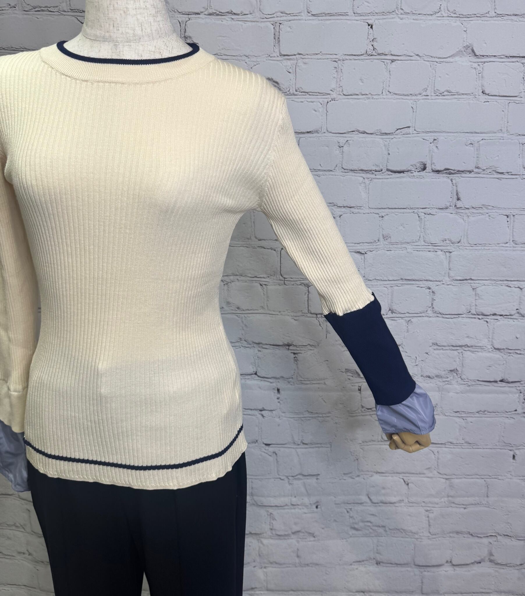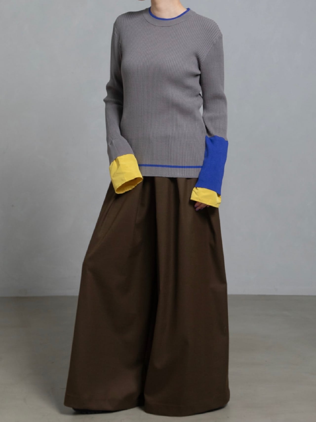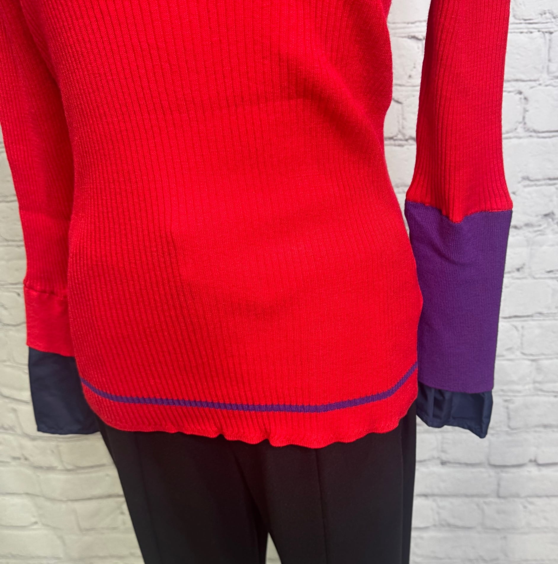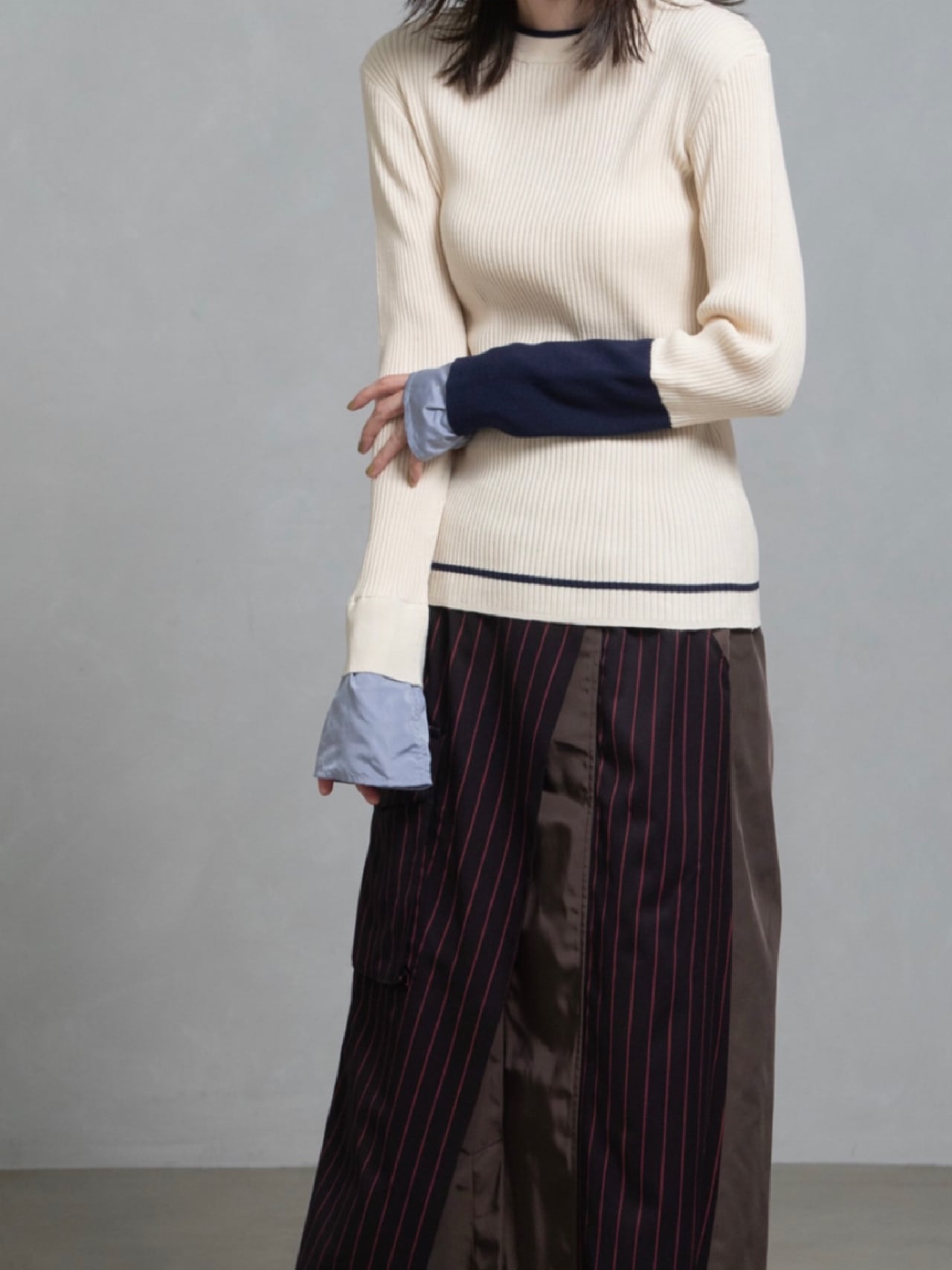 鮮やかなトレンドカラー配色が今年らしく、袖の配色がポイントのレイヤードデザインニットです。衿ぐり、裾は左袖の配色と同様の配色のライン入り。長めの袖丈で布帛でレイヤードにした袖口。リブニットですが、ストレッチが効いていて伸び感がよく、身体のラインを拾わず縦長シルエット。肌触りも良く、程良いフィット感でインナーにも使いやすいおすすめアイテムです。お家で洗えます。