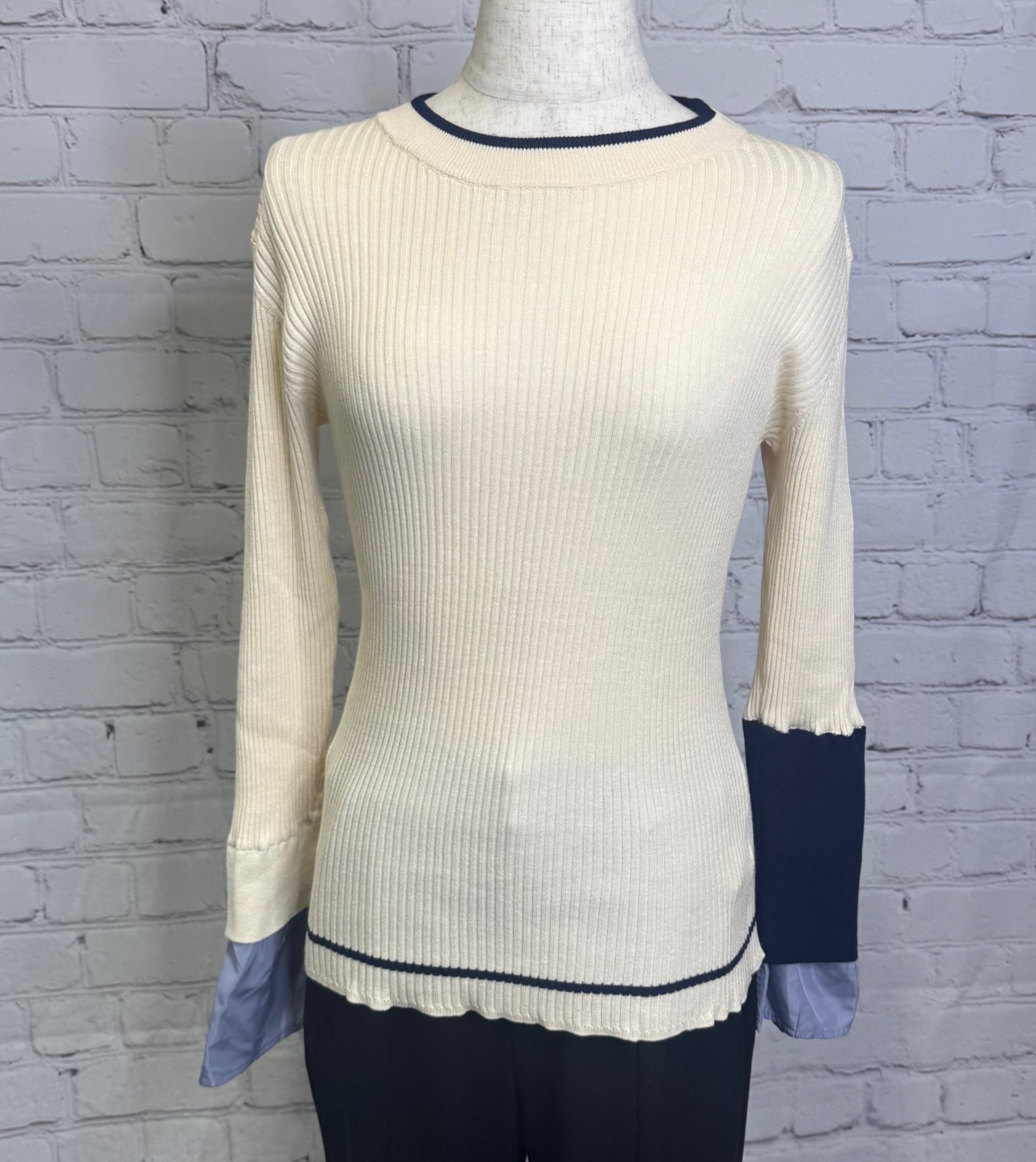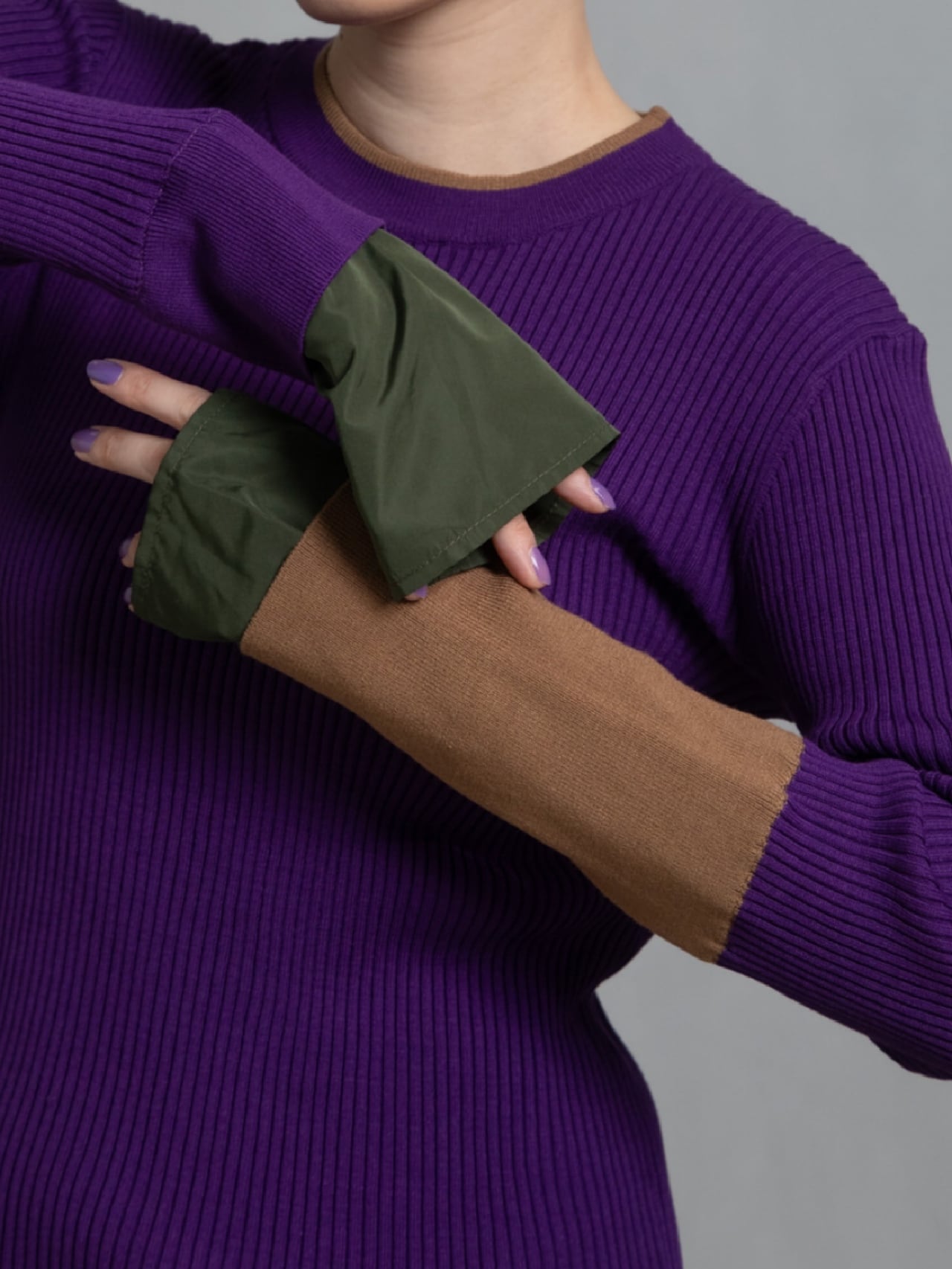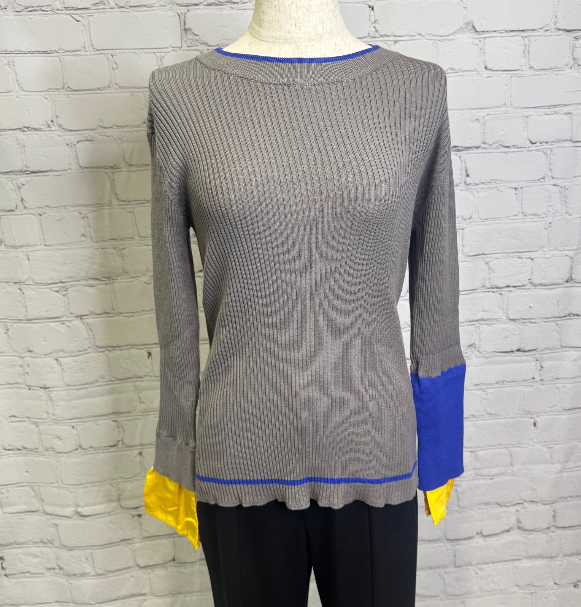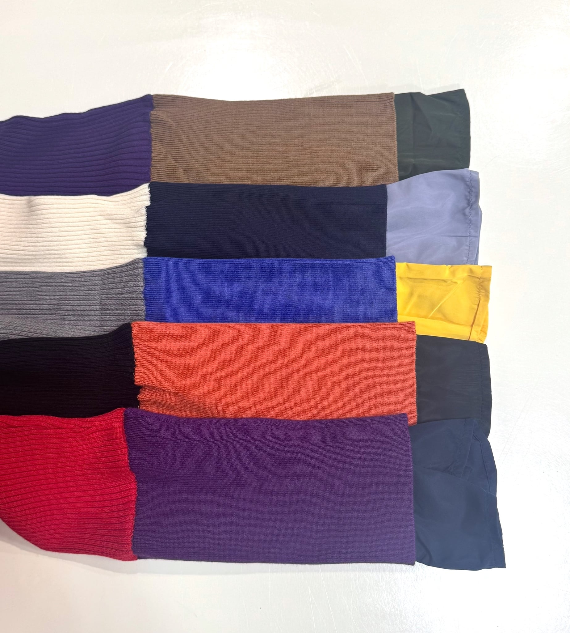 鮮やかなトレンドカラー配色が今年らしく、袖の配色がポイントのレイヤードデザインニットです。衿ぐり、裾は左袖の配色と同様の配色のライン入り。長めの袖丈で布帛でレイヤードにした袖口。リブニットですが、ストレッチが効いていて伸び感がよく、身体のラインを拾わず縦長シルエット。肌触りも良く、程良いフィット感でインナーにも使いやすいおすすめアイテムです。お家で洗えます。
