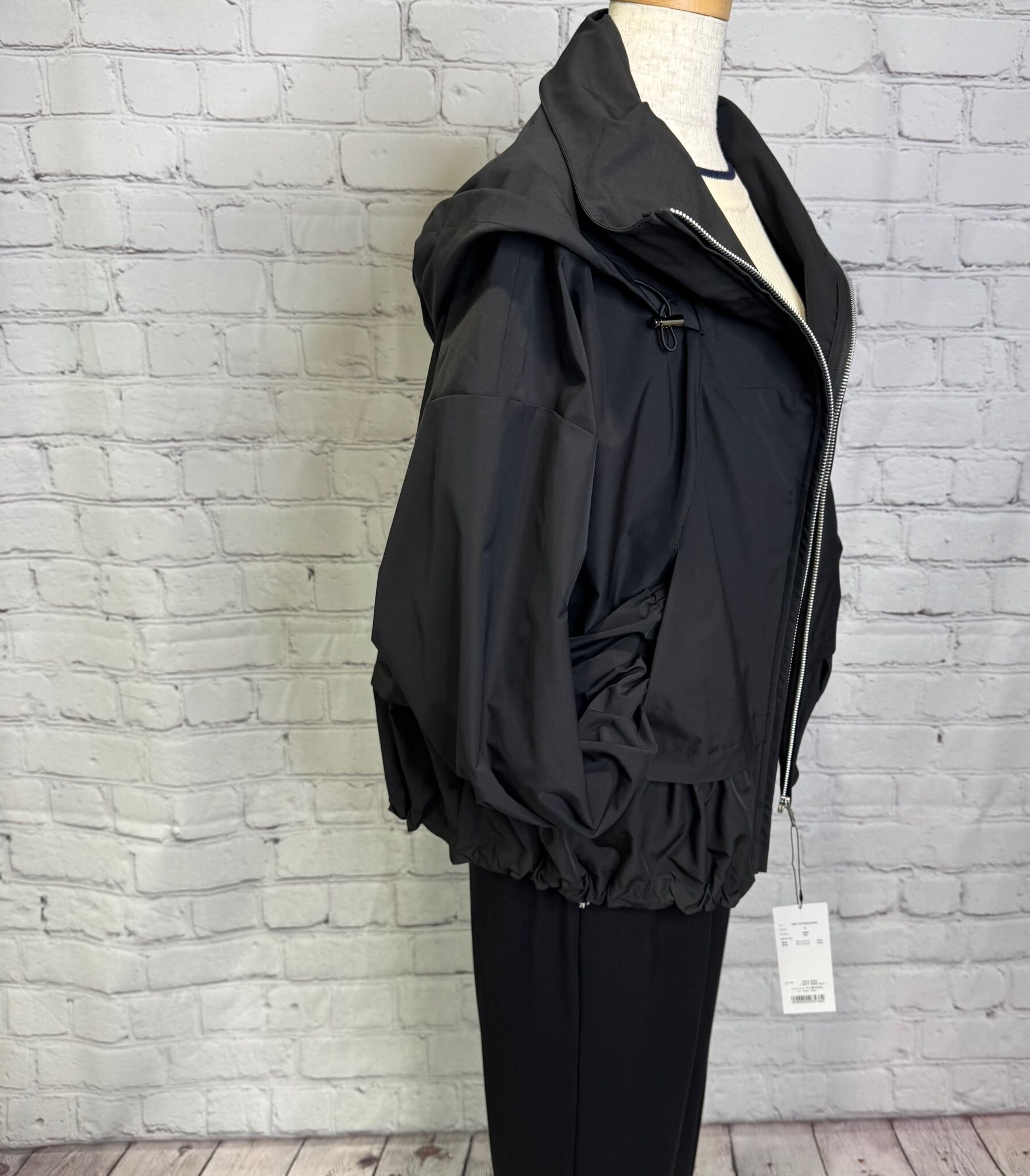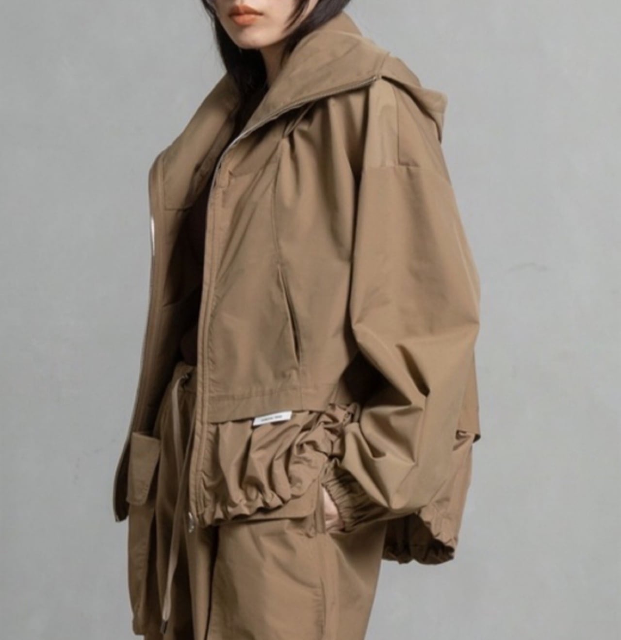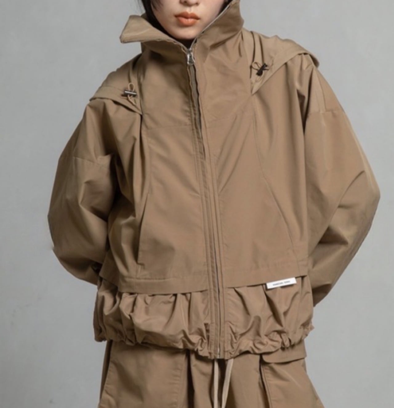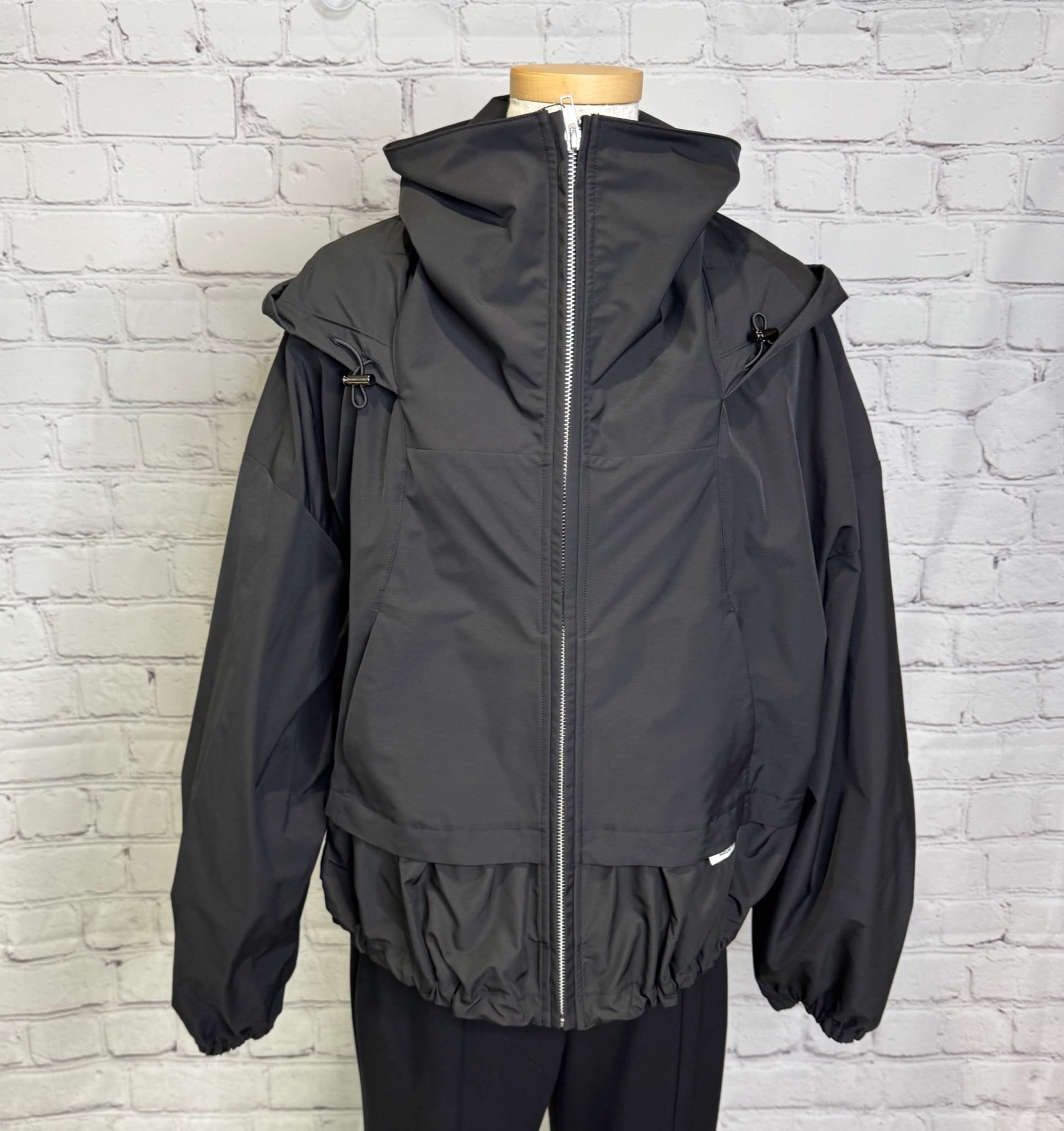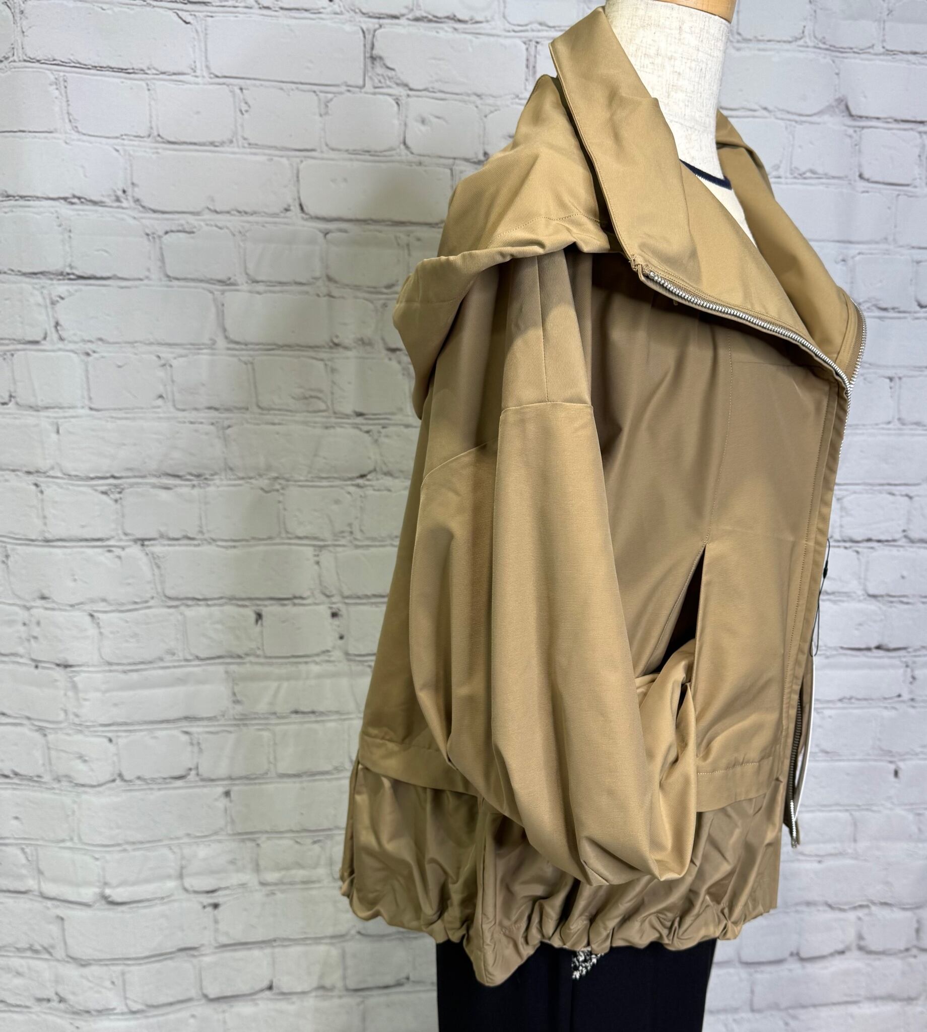 高めのスタンドカラー部分に収納可能なフードがデザインされていて2wayでご利用頂けるブルゾンです。袖にはダーツを入れ、ボリューム感のある立体的なシルエットです。ドロストでシルエットを変えられる裾は後ろ下がりでヒップが隠れる丈感になります。