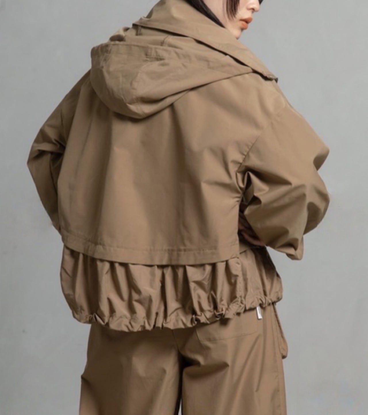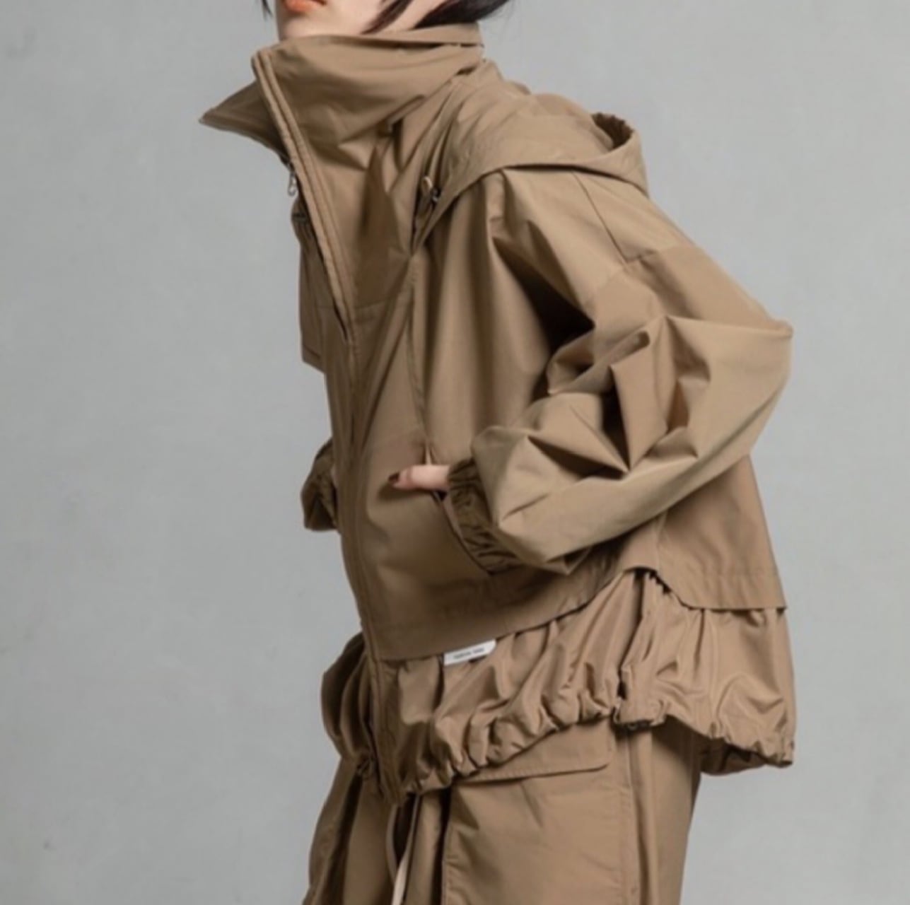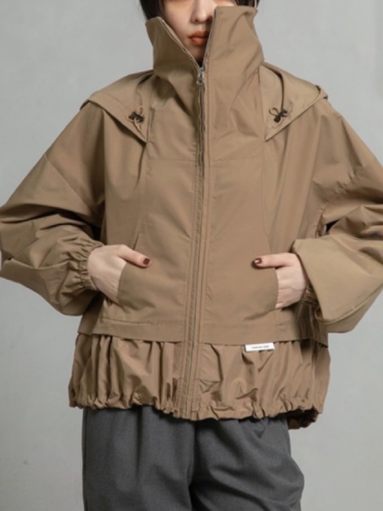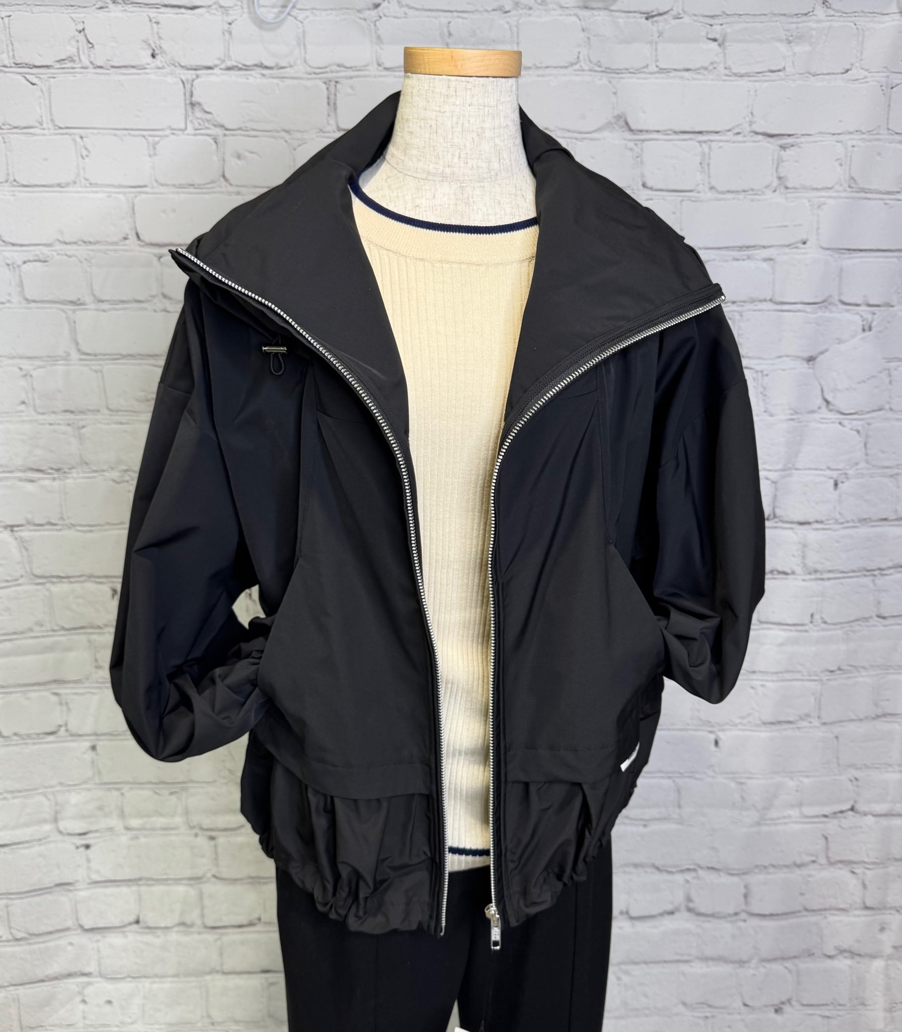 高めのスタンドカラー部分に収納可能なフードがデザインされていて2wayでご利用頂けるブルゾンです。袖にはダーツを入れ、ボリューム感のある立体的なシルエットです。ドロストでシルエットを変えられる裾は後ろ下がりでヒップが隠れる丈感になります。