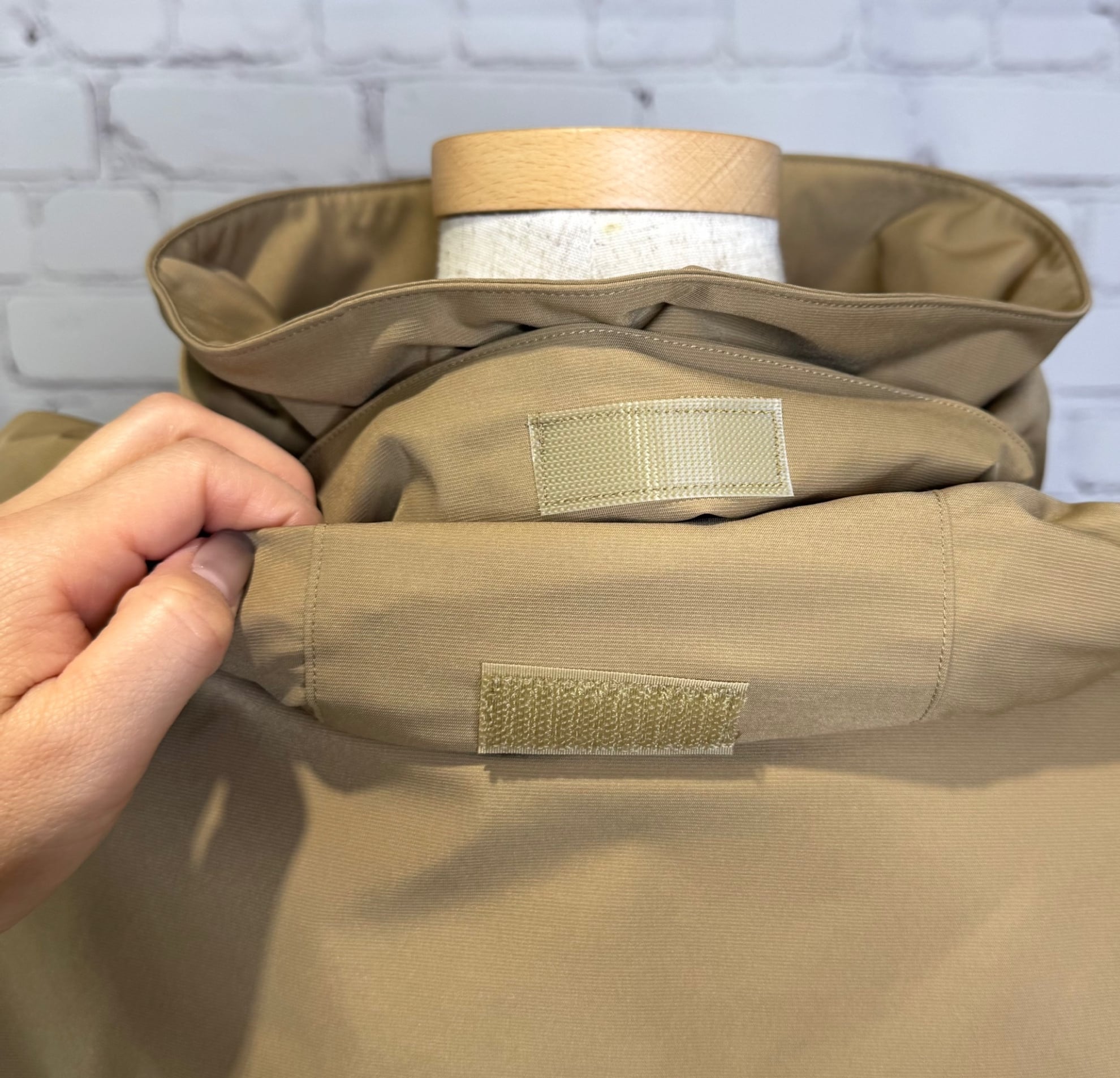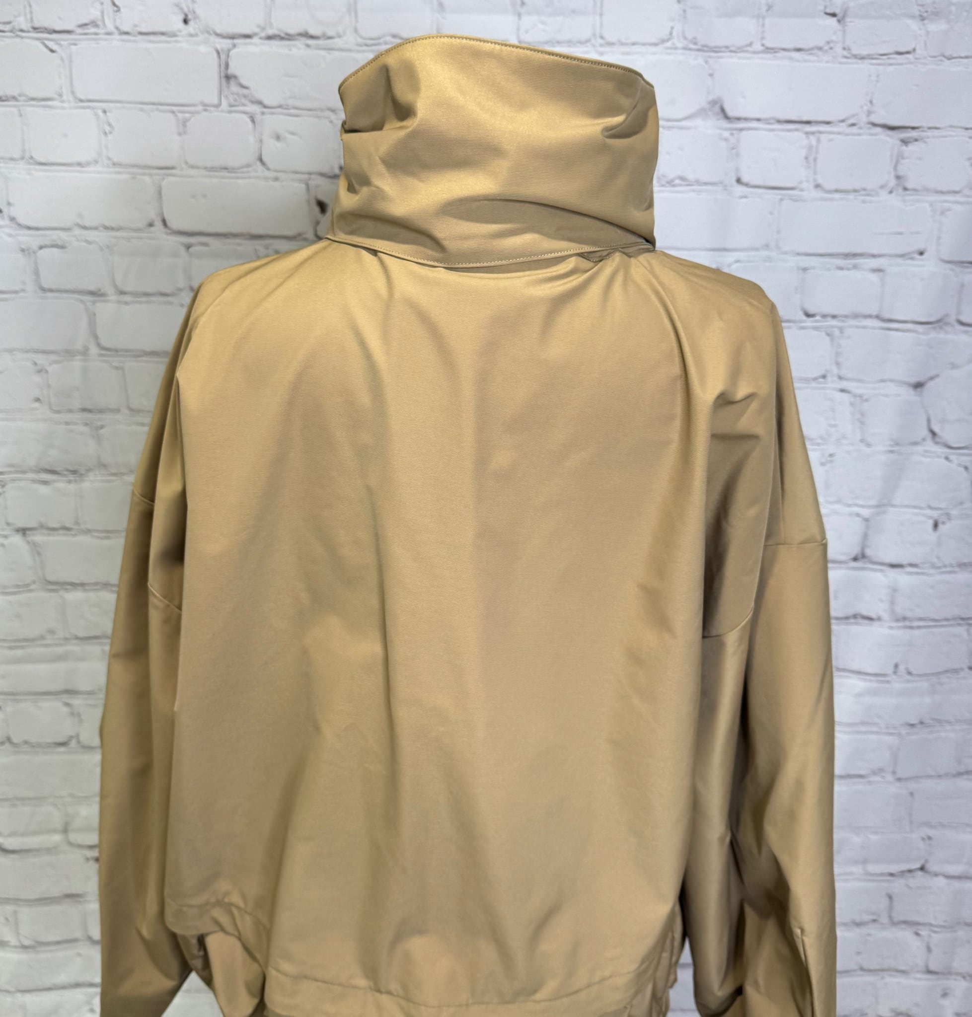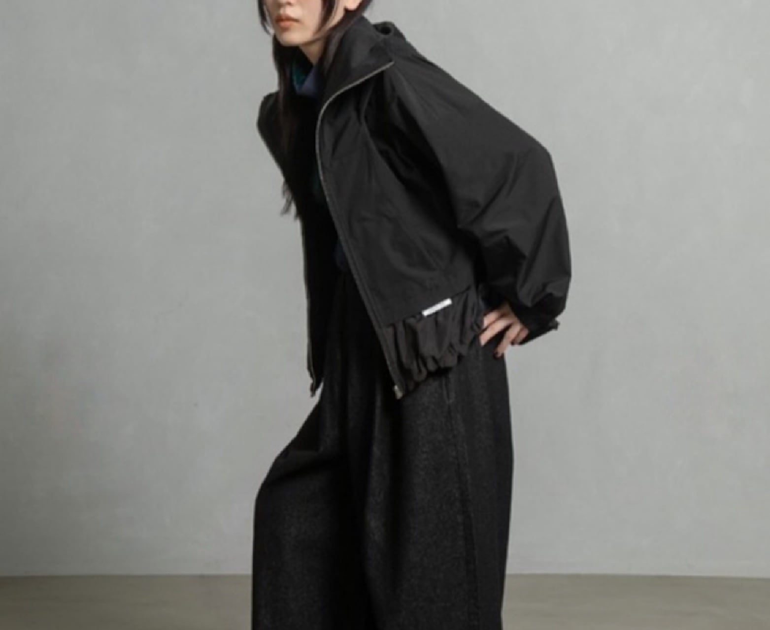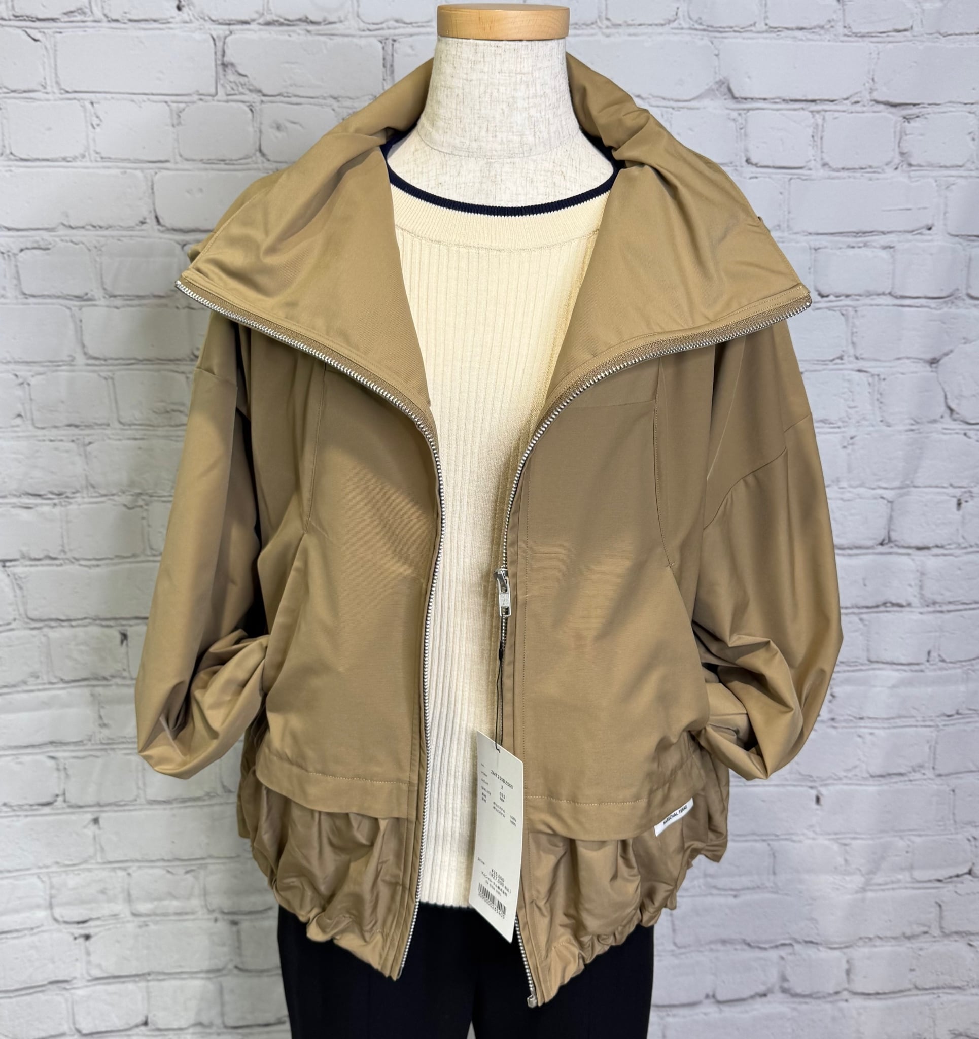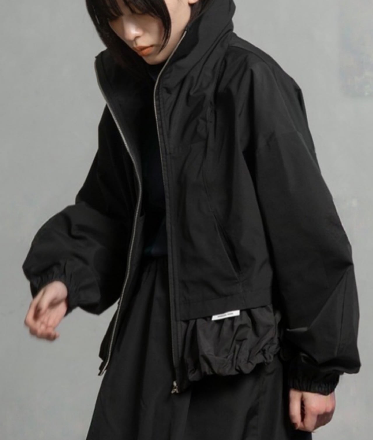 高めのスタンドカラー部分に収納可能なフードがデザインされていて2wayでご利用頂けるブルゾンです。袖にはダーツを入れ、ボリューム感のある立体的なシルエットです。ドロストでシルエットを変えられる裾は後ろ下がりでヒップが隠れる丈感になります。