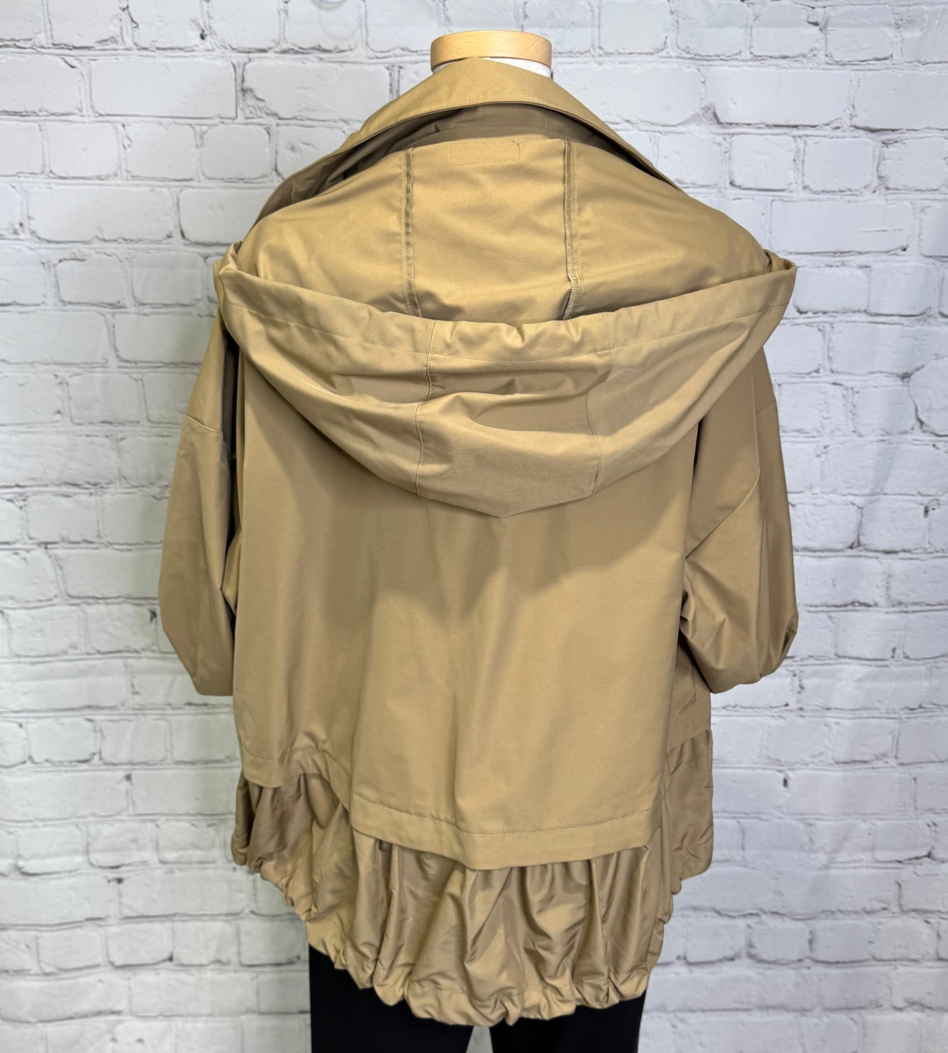 裾を薄手の別地で切替、ギャザーの入ったディテールがフェミニンな雰囲気をプラスしたボトムを選ばないデザインです。フードはくるくる、マジックテープで収納できます。ポケットあり。
