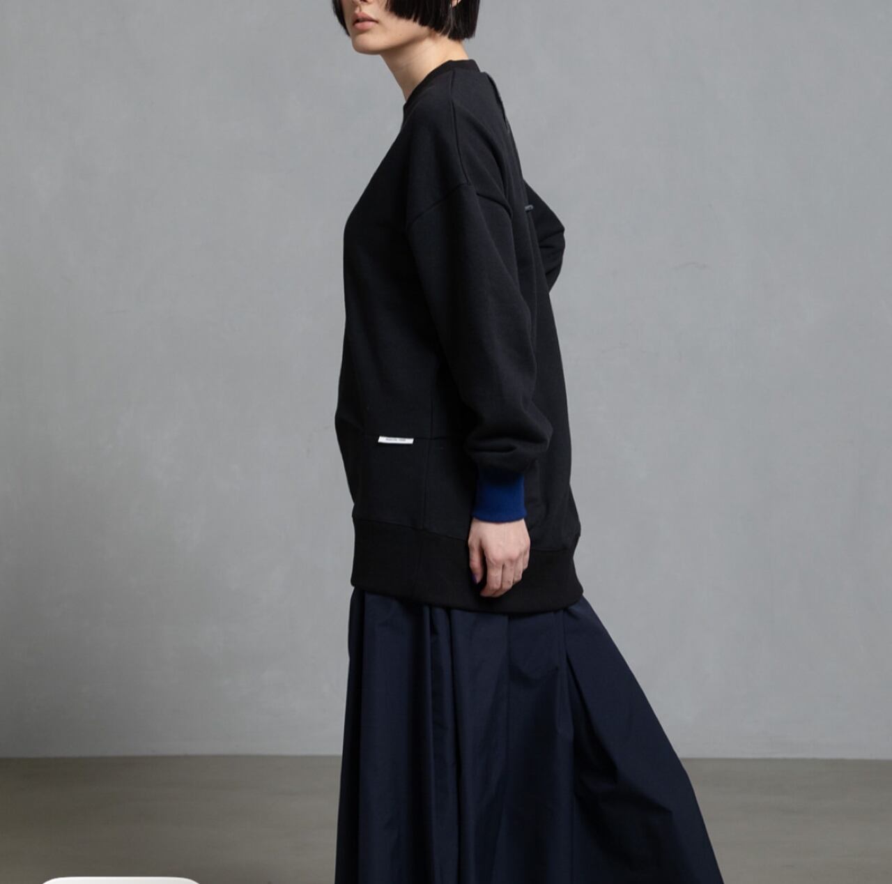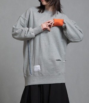 一見シンプルながら、前後で異なるディテールが光スウェットです。左袖口を配色リブ、フロント右見頃は斜めに切替え、左脇の前側らダーツ、後側はタックを寄せ、左裾あがりのアシンメトリーデザイン。バックには配色糸のロックを施し、360度どこから見てもデザイン性のある一枚です。ゆったりとしたシルエットで着心地も抜群。お家で洗えます。日本製。