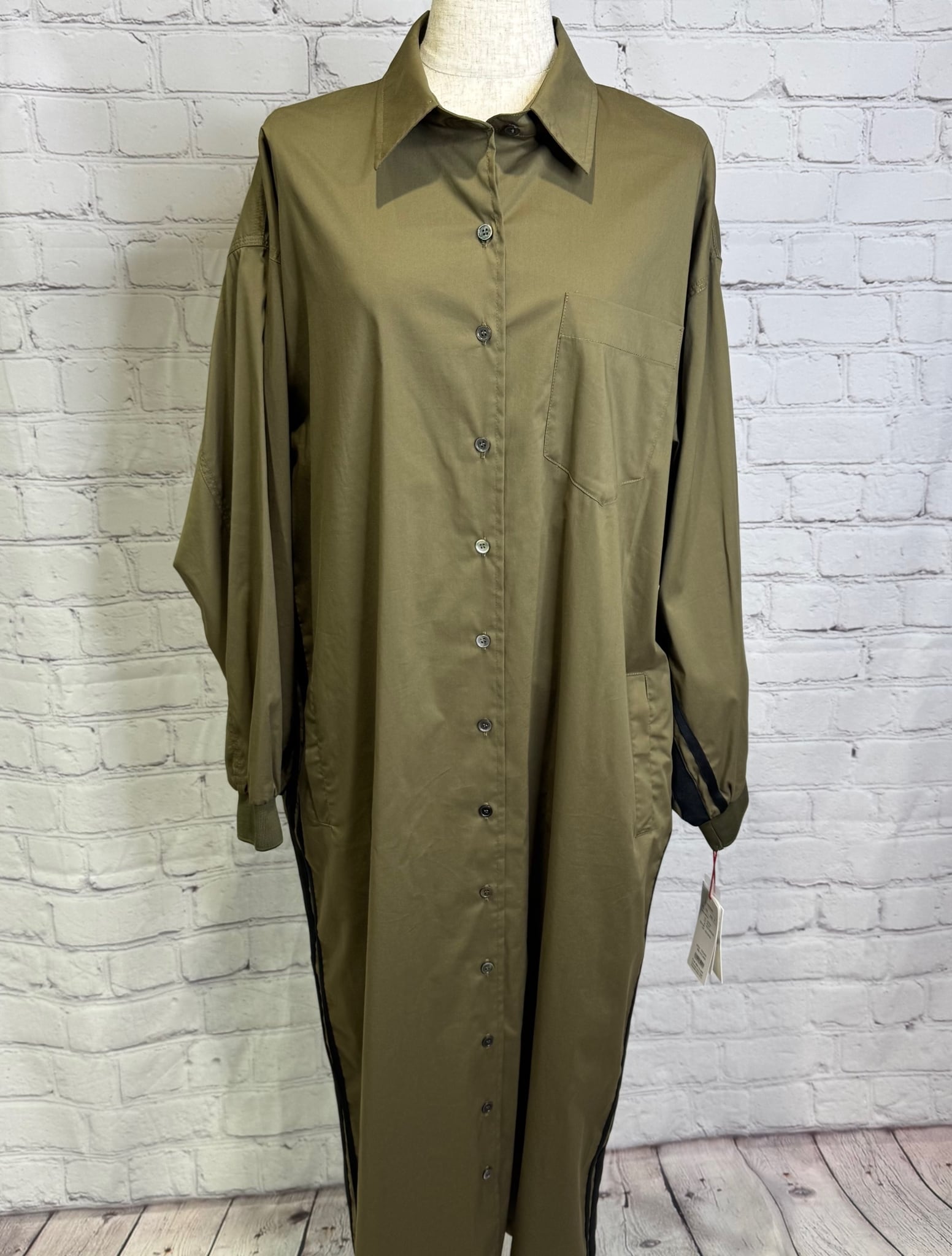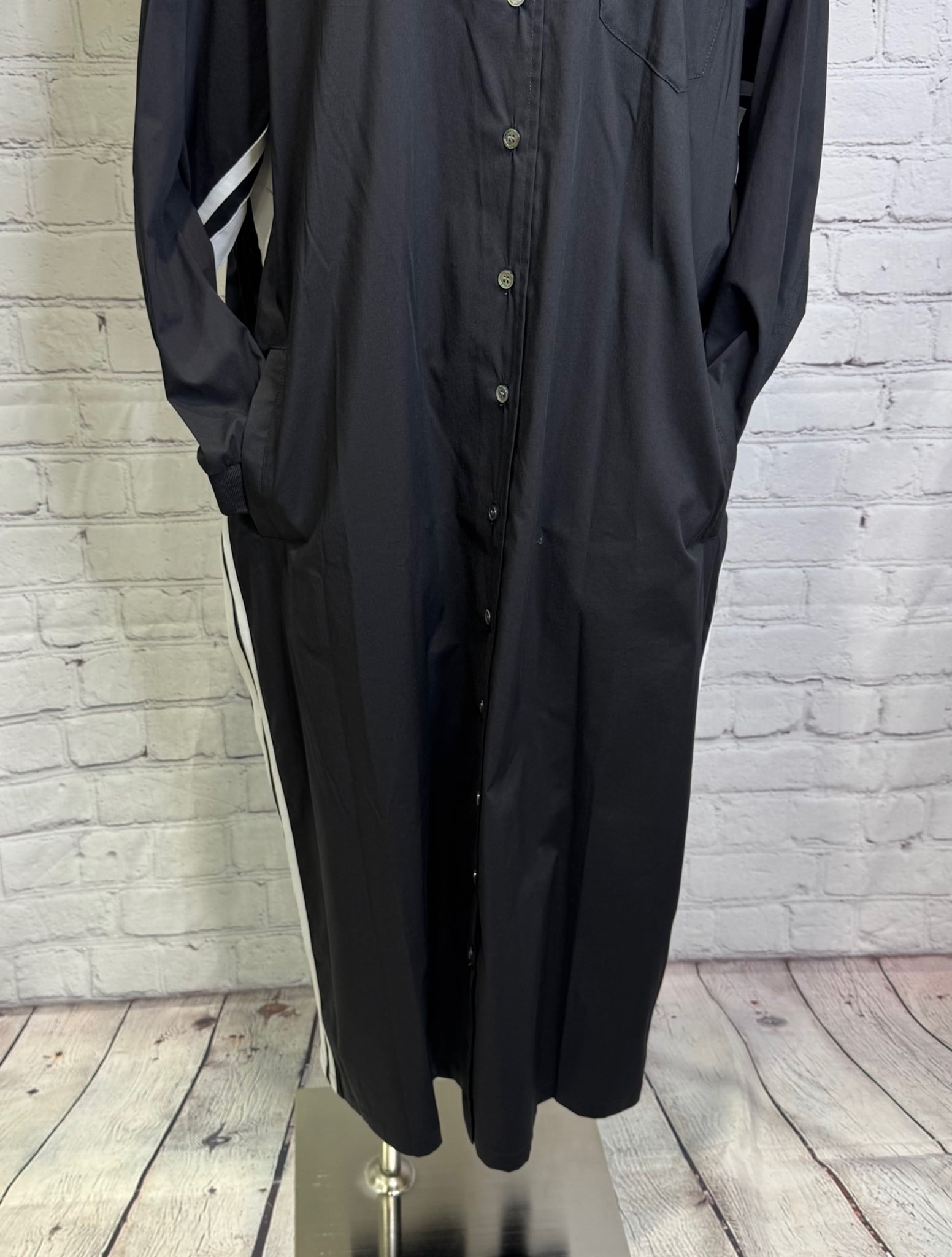 サイドラインがスポーティなシャツワンピースです!後ろのドロストでシルエットを変えられます。ボタンを閉じてワンピースできたり、開けて羽織としても活躍してくれるおすすめアイテムです。袖口リブも嬉しい! ポケットあり。お家で洗えます。