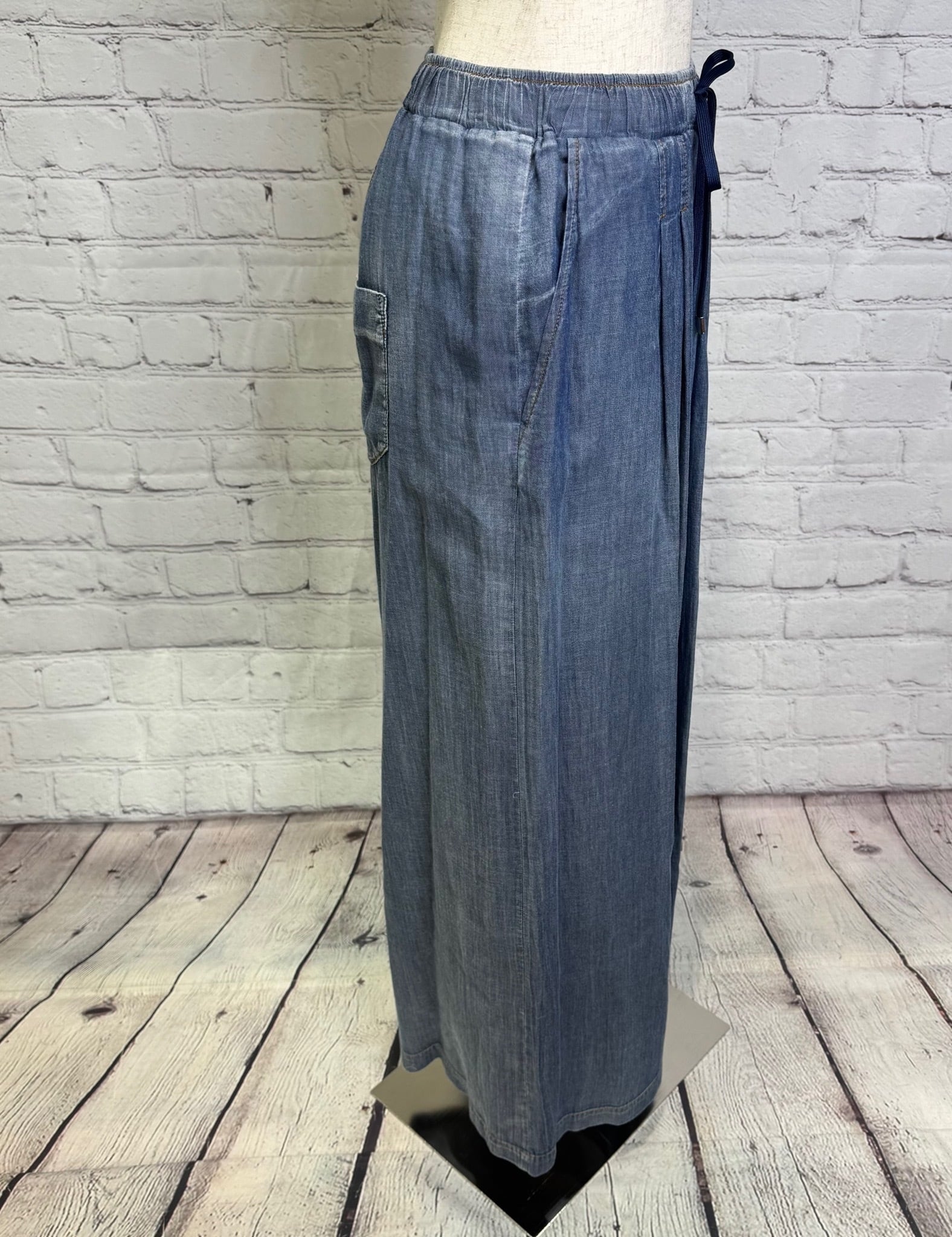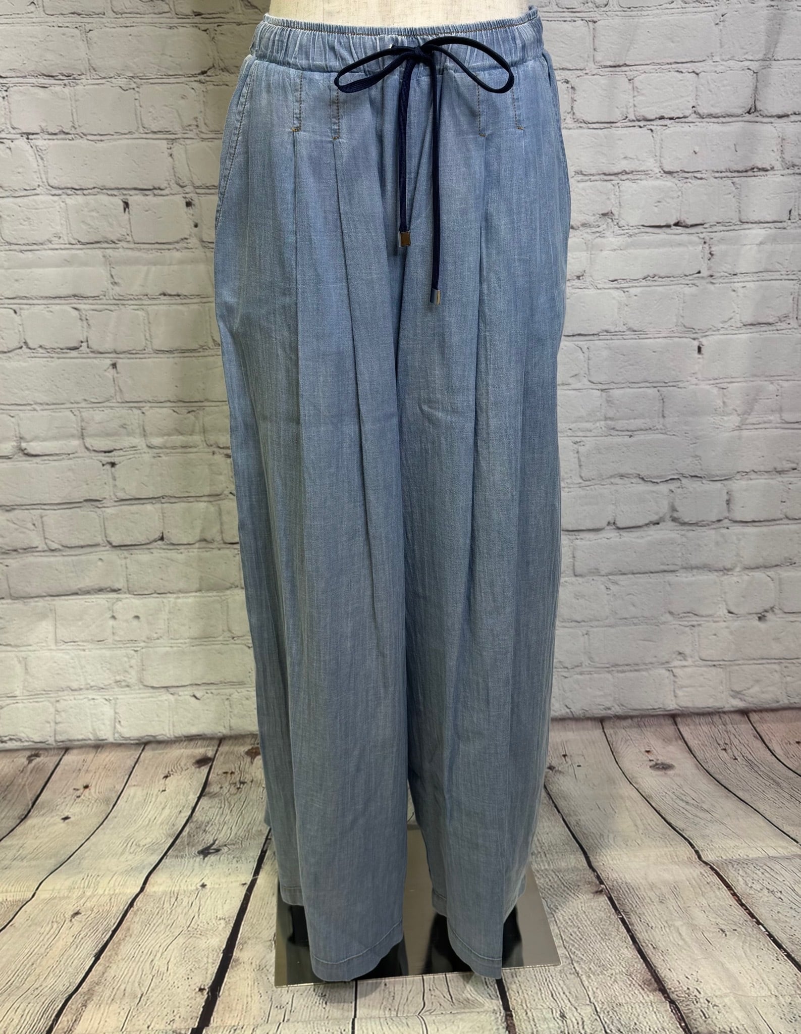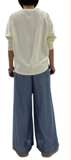 ayaneが別注で作ったコットンシアーデニム生地。ソフトで軽やかな涼しく過ごせる夏の優秀な素材です。軽量なのでたっぷり用尺のかかるワイドパンツもノンストレスで涼しく着用できます。ウエストゴムでストレスフリー。紐でサイズ調節できます。裏地付き。お家で洗えます。