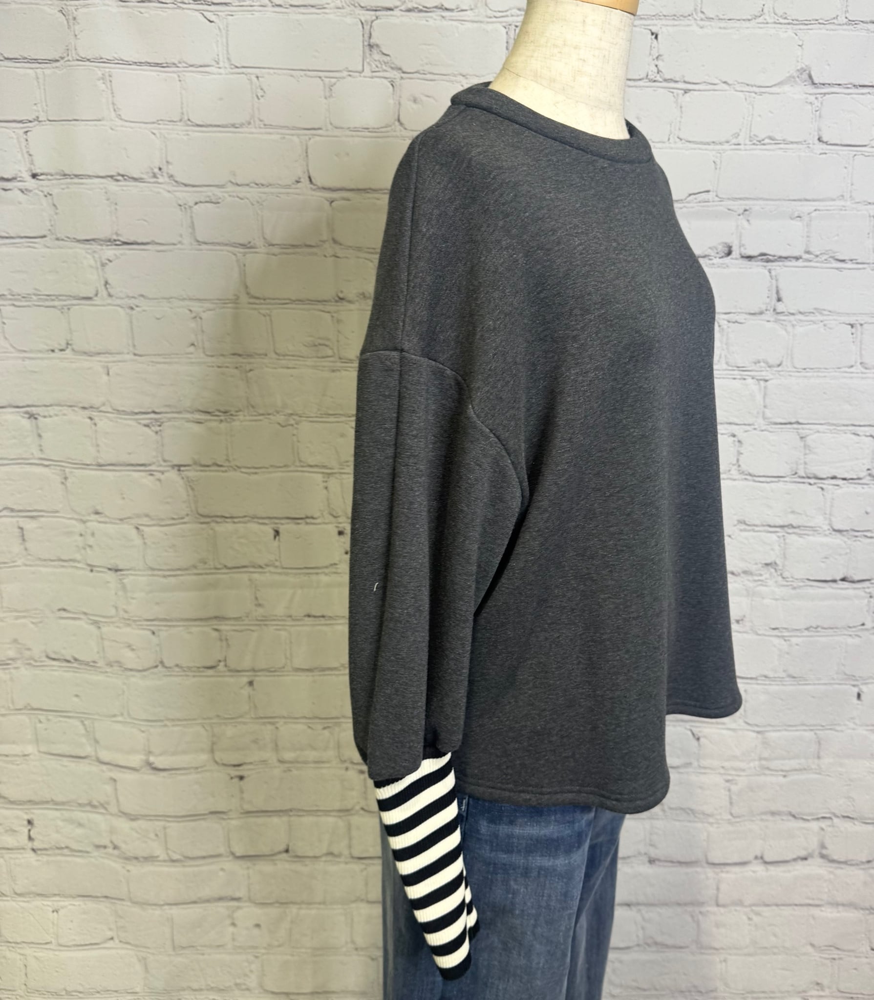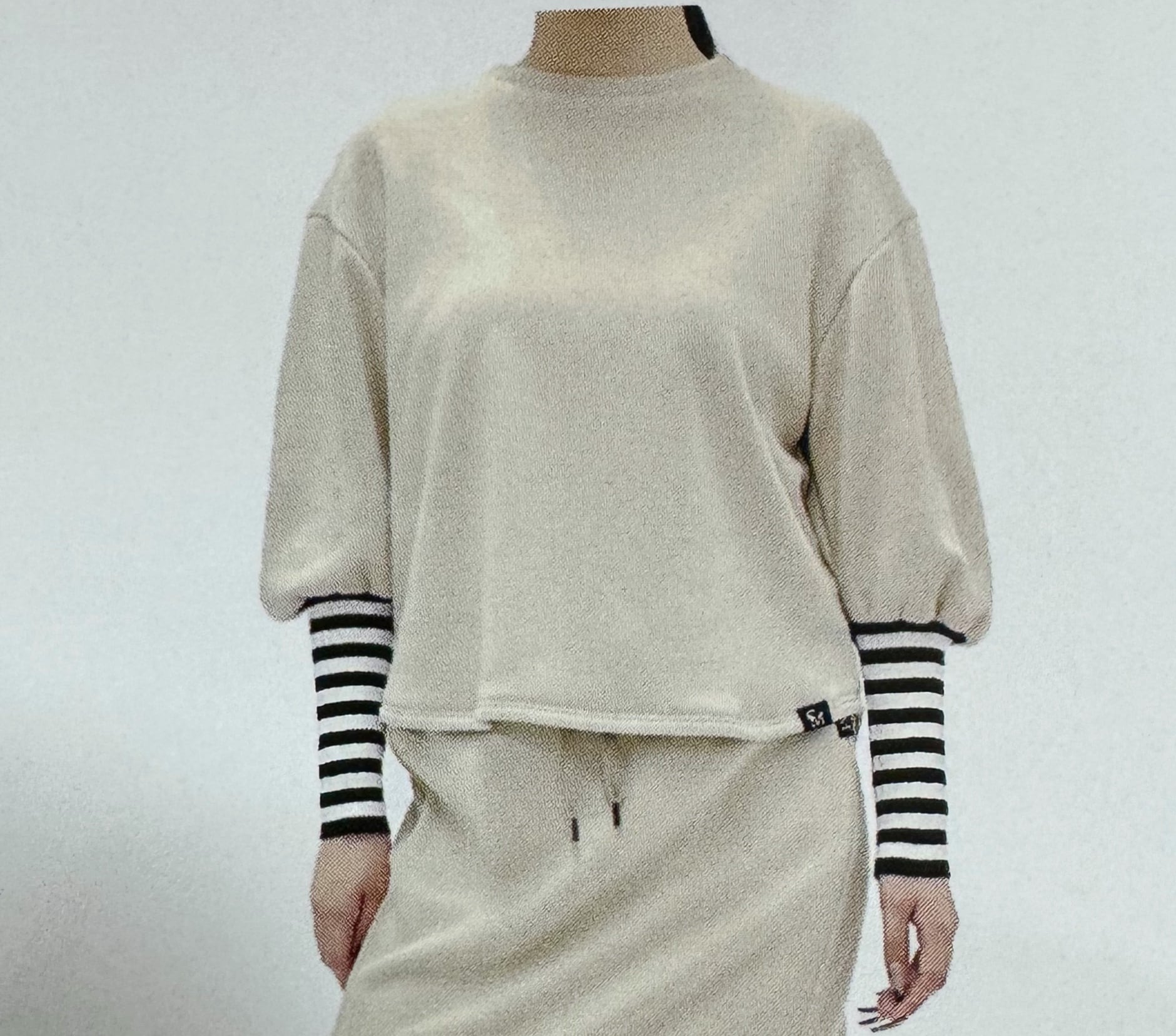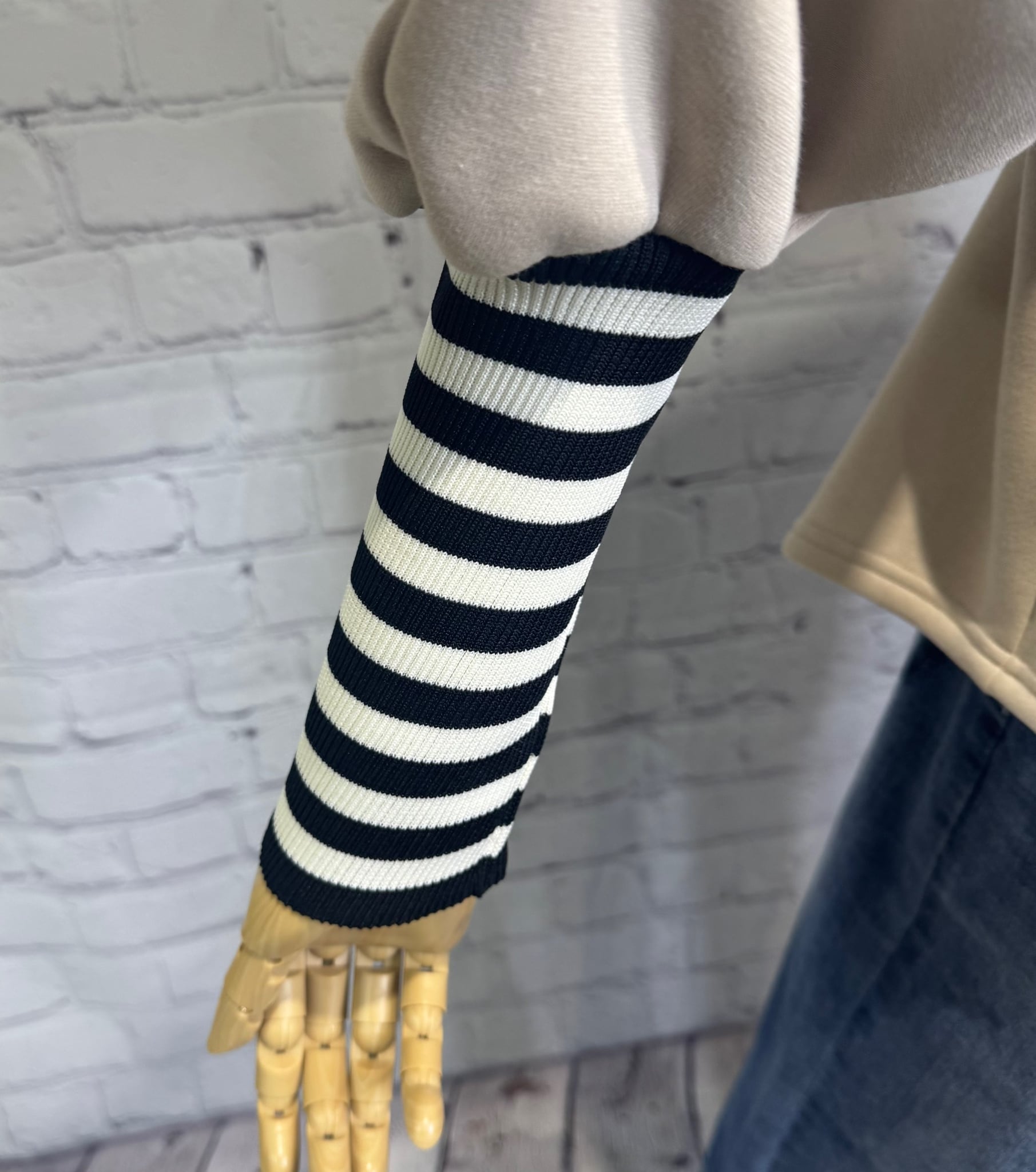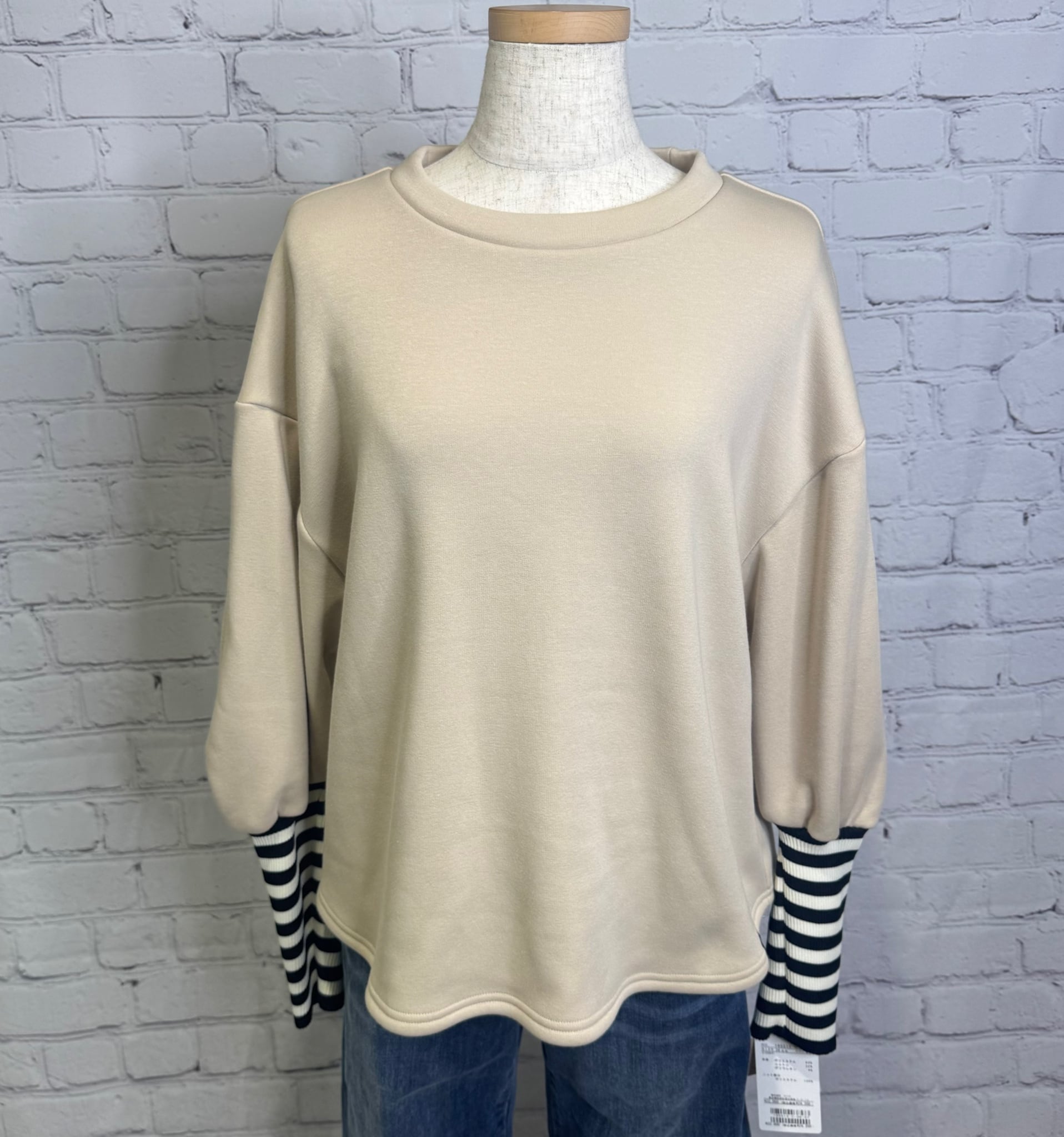 袖口の編み立てニットの長めボーダーがポイントの丸首プルオーバーです。ボンバーヒートでとても暖かく、羽織などの袖口から除くチラ見せコーデが大人可愛い♡ お家で洗えます。