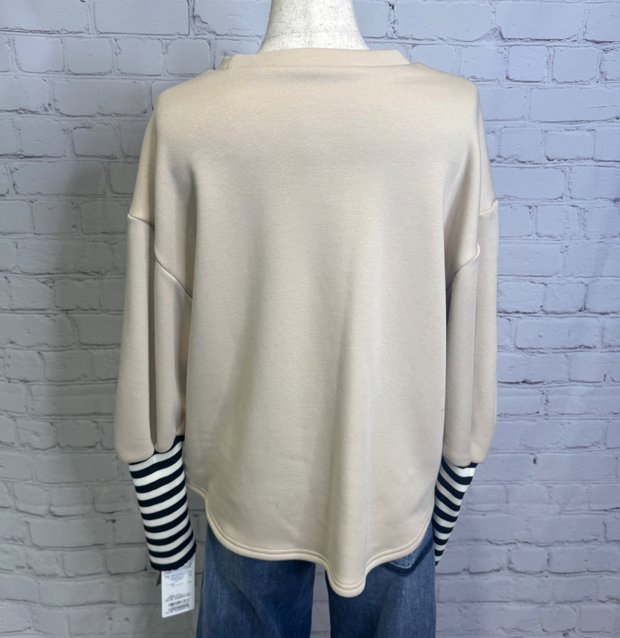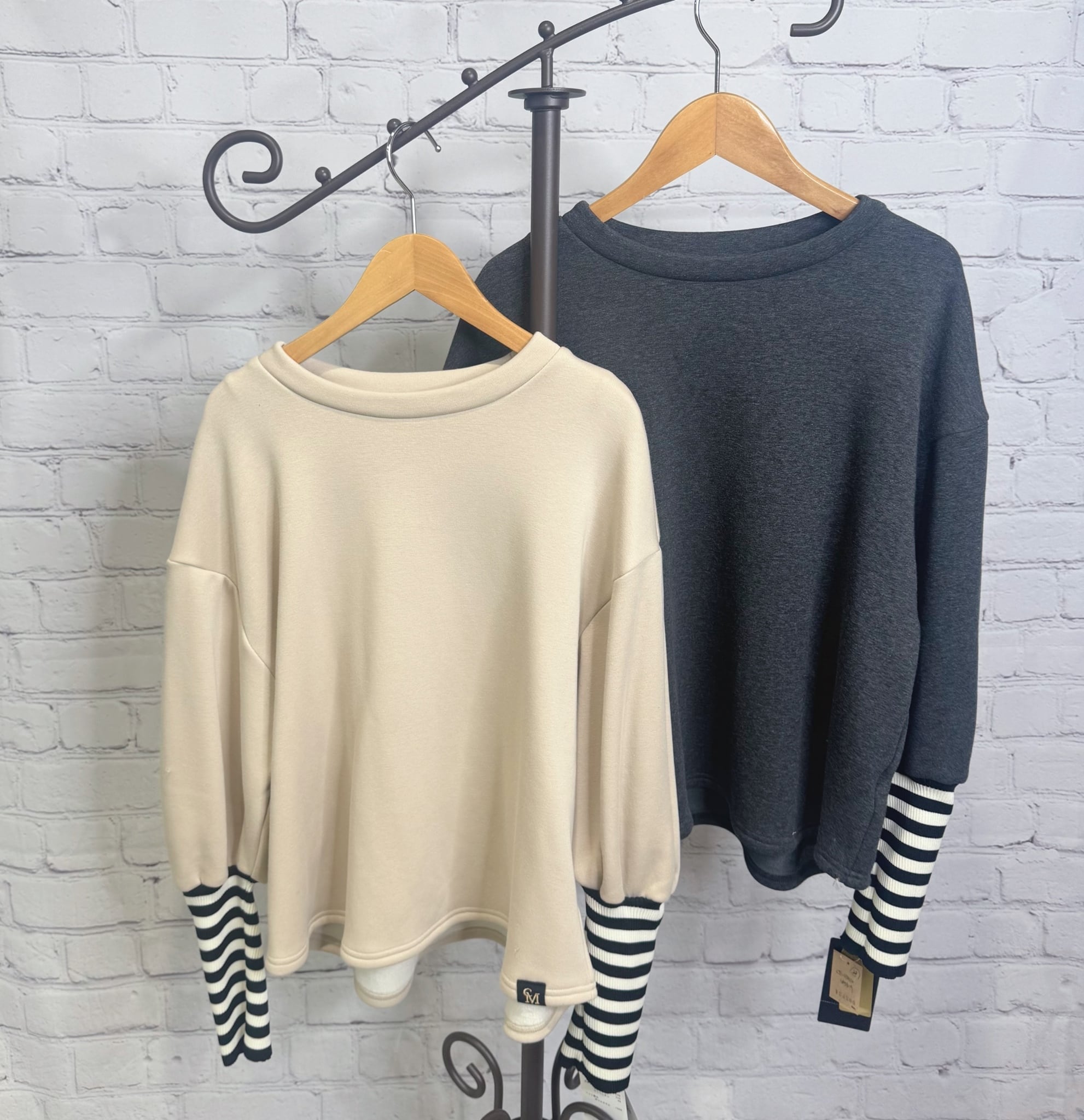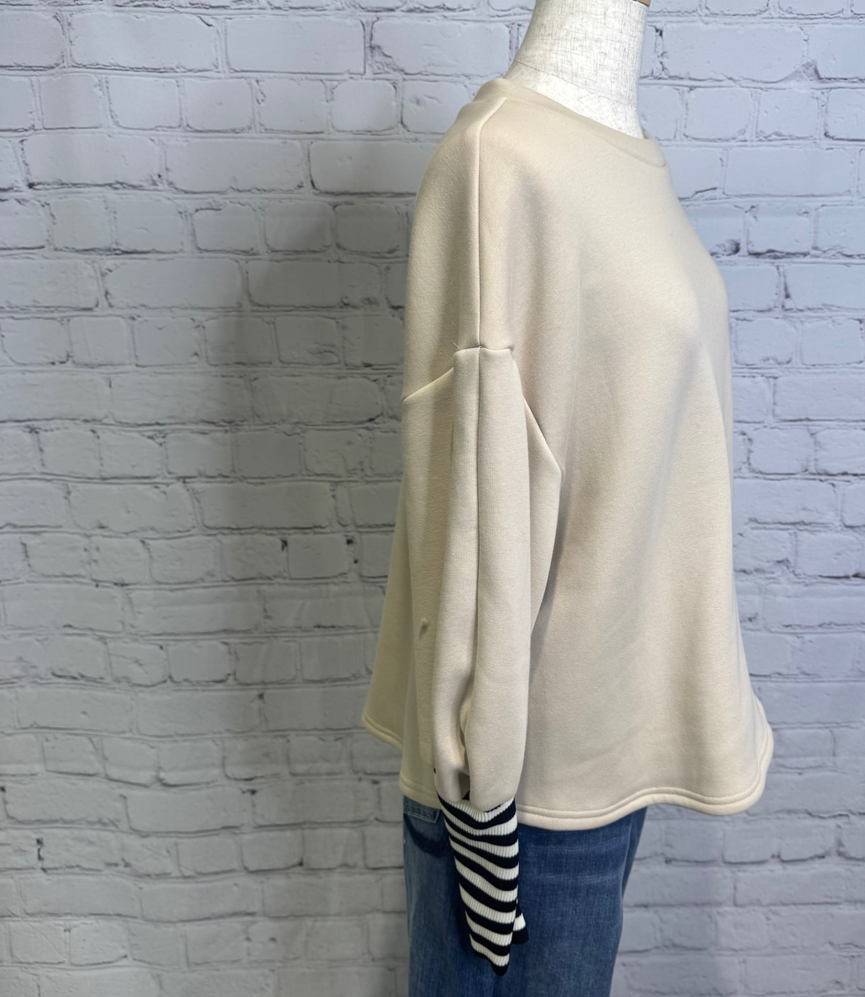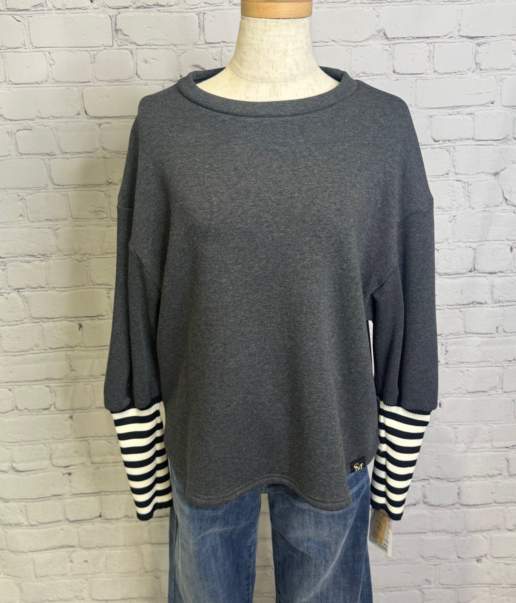 袖口の編み立てニットの長めボーダーがポイントの丸首プルオーバーです。ボンバーヒートでとても暖かく、羽織などの袖口から除くチラ見せコーデが大人可愛い♡ お家で洗えます。