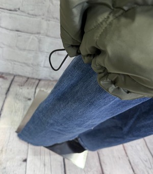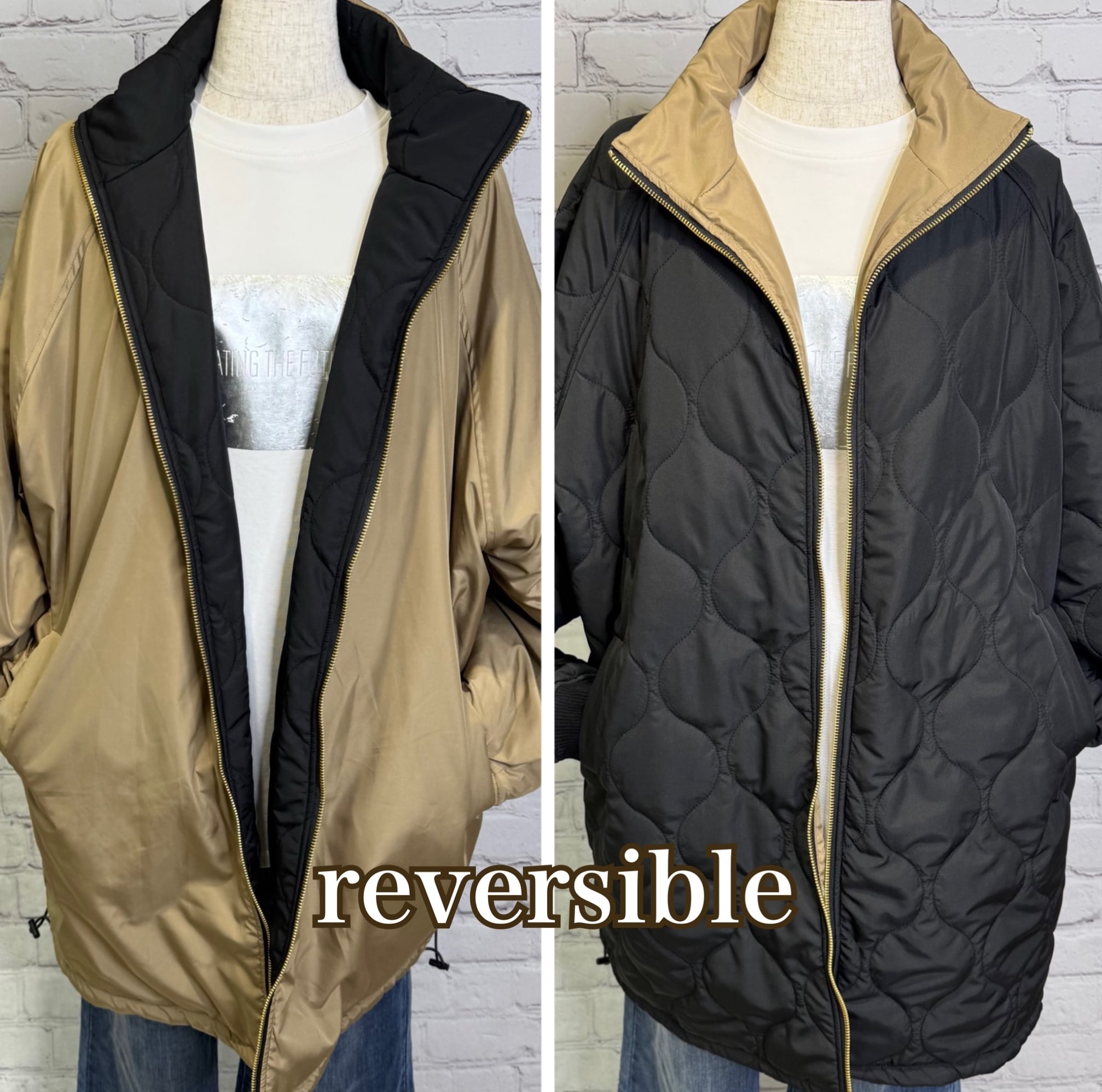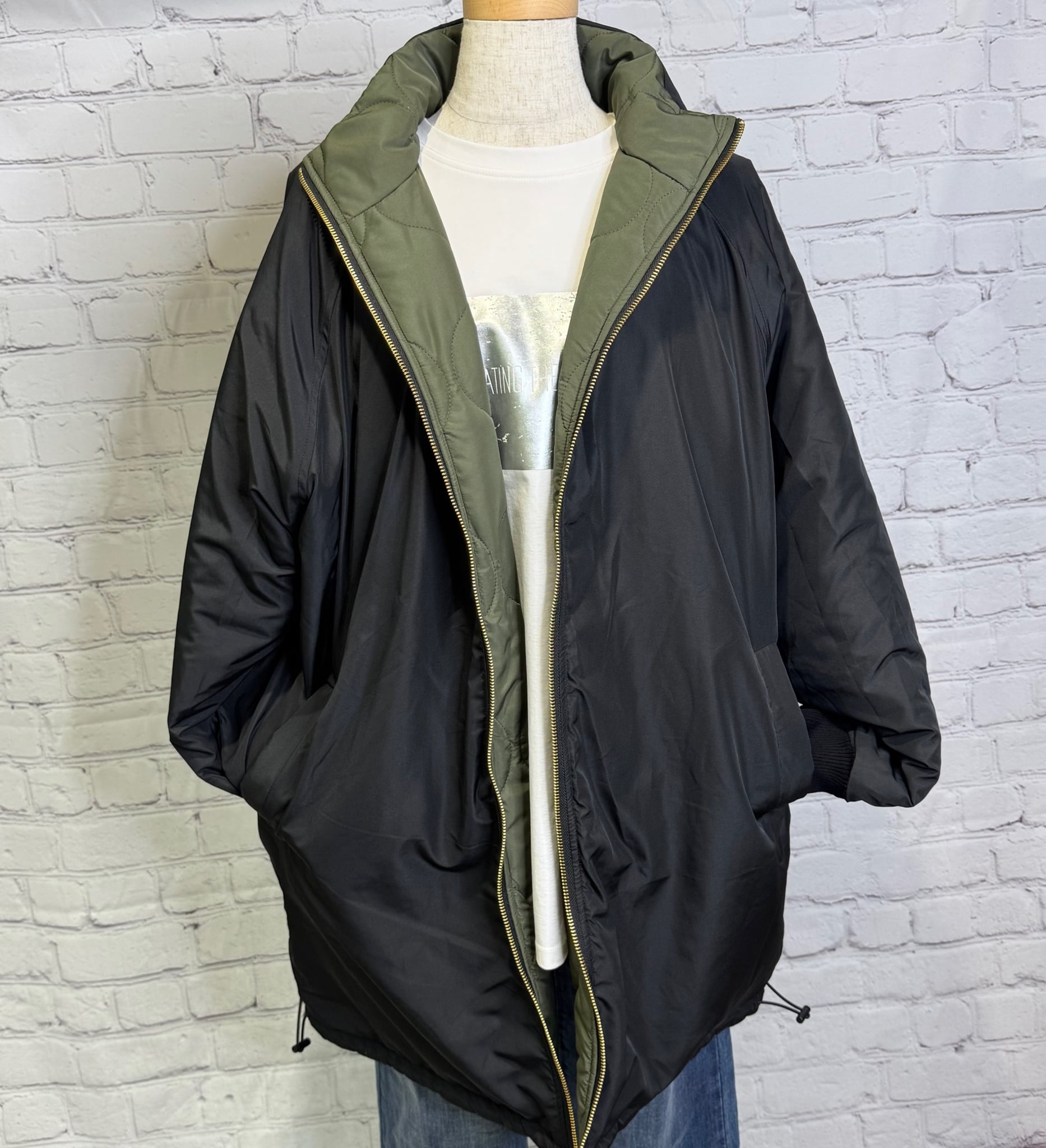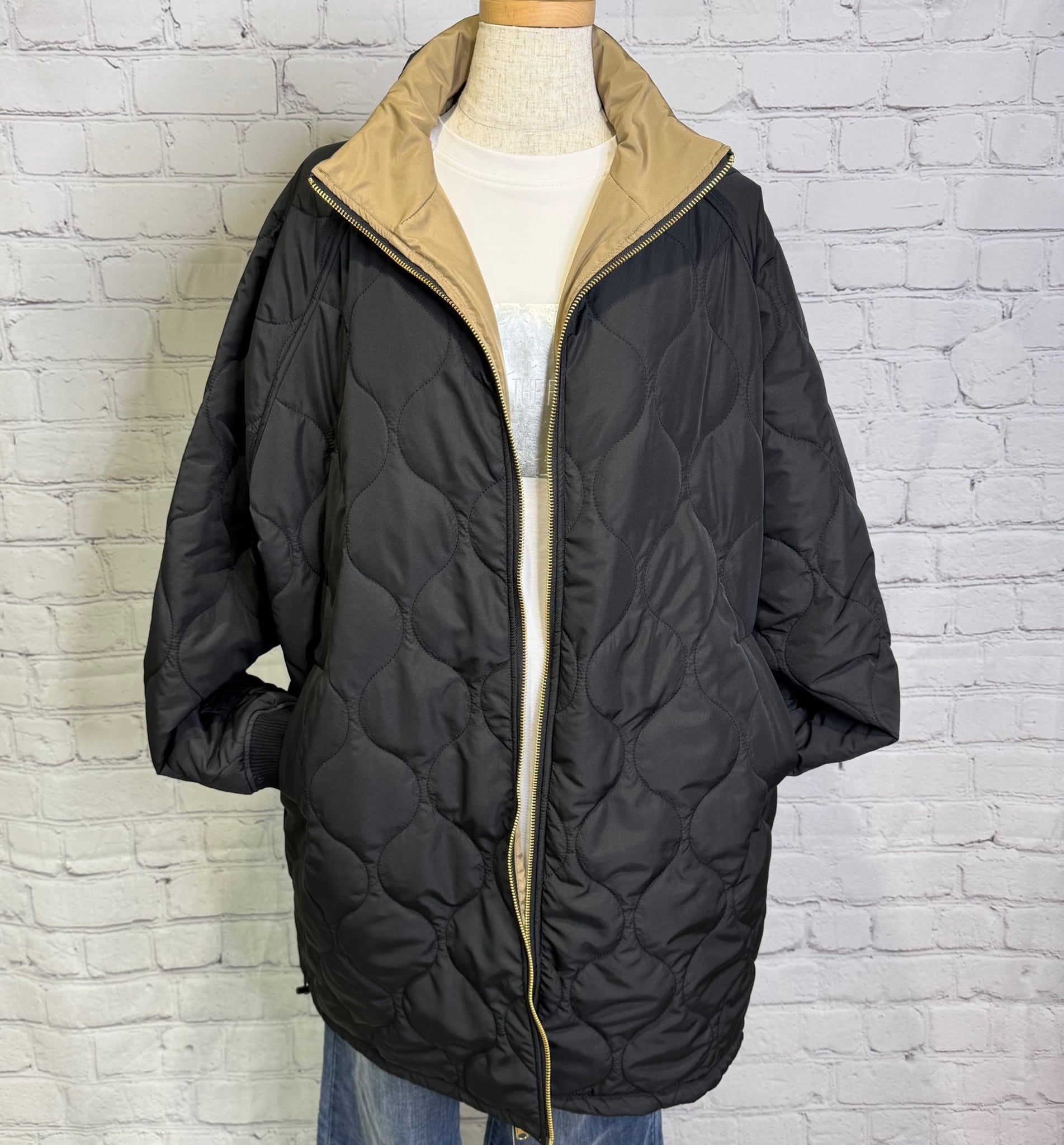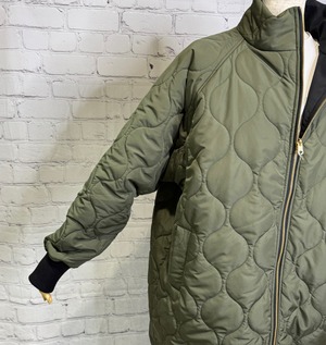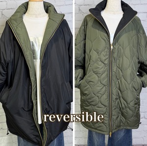 軽くて暖かく、程よくルーズでオーバーサイズのシルエットのミドル丈の中綿入りコートです。表と裏で配色になっていて、無地とキルティング柄のリバーシブル仕様になっています。表と裏で表情を楽しめて、どちらで着ても着回し力抜群のアウターです。裾のドロストで、絞ると立体感のある丸みをおびたシルエットにもなります。袖口は汚れが目ただないブラック仕様。リブも嬉しいポイント!ポケットあり。ダブルファスナー仕様。