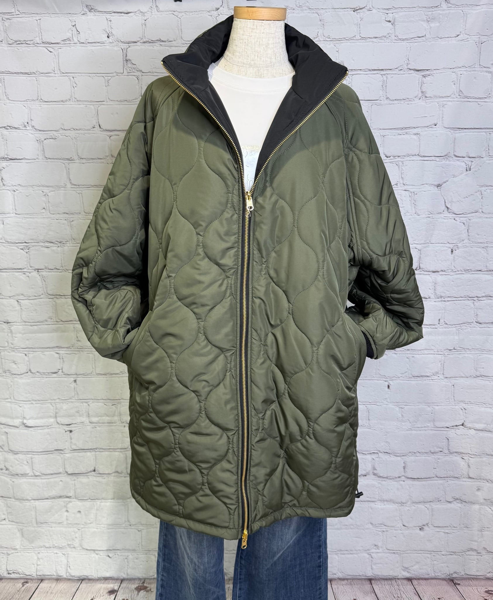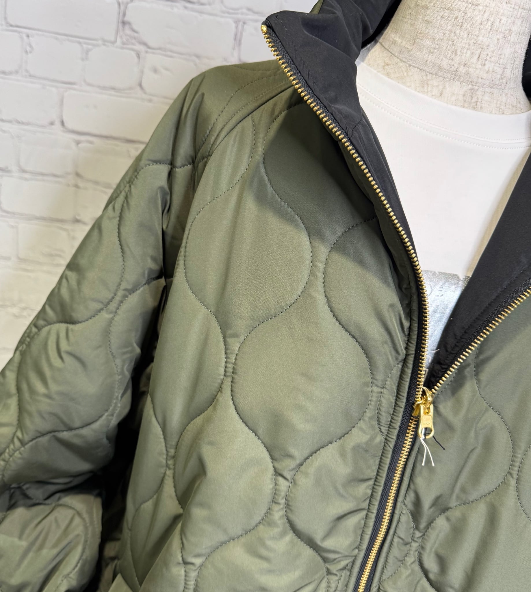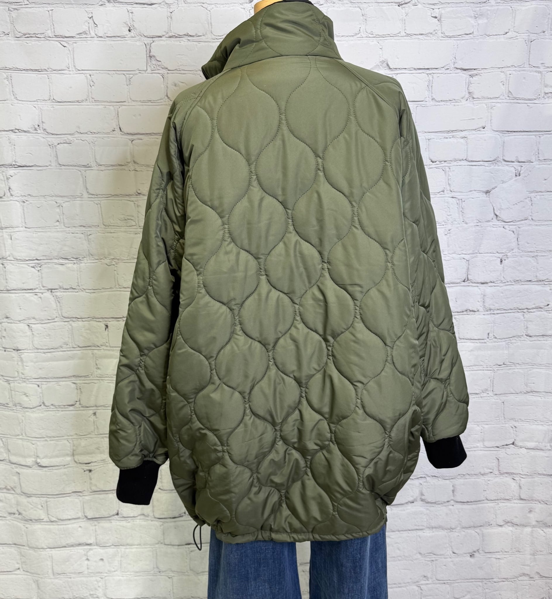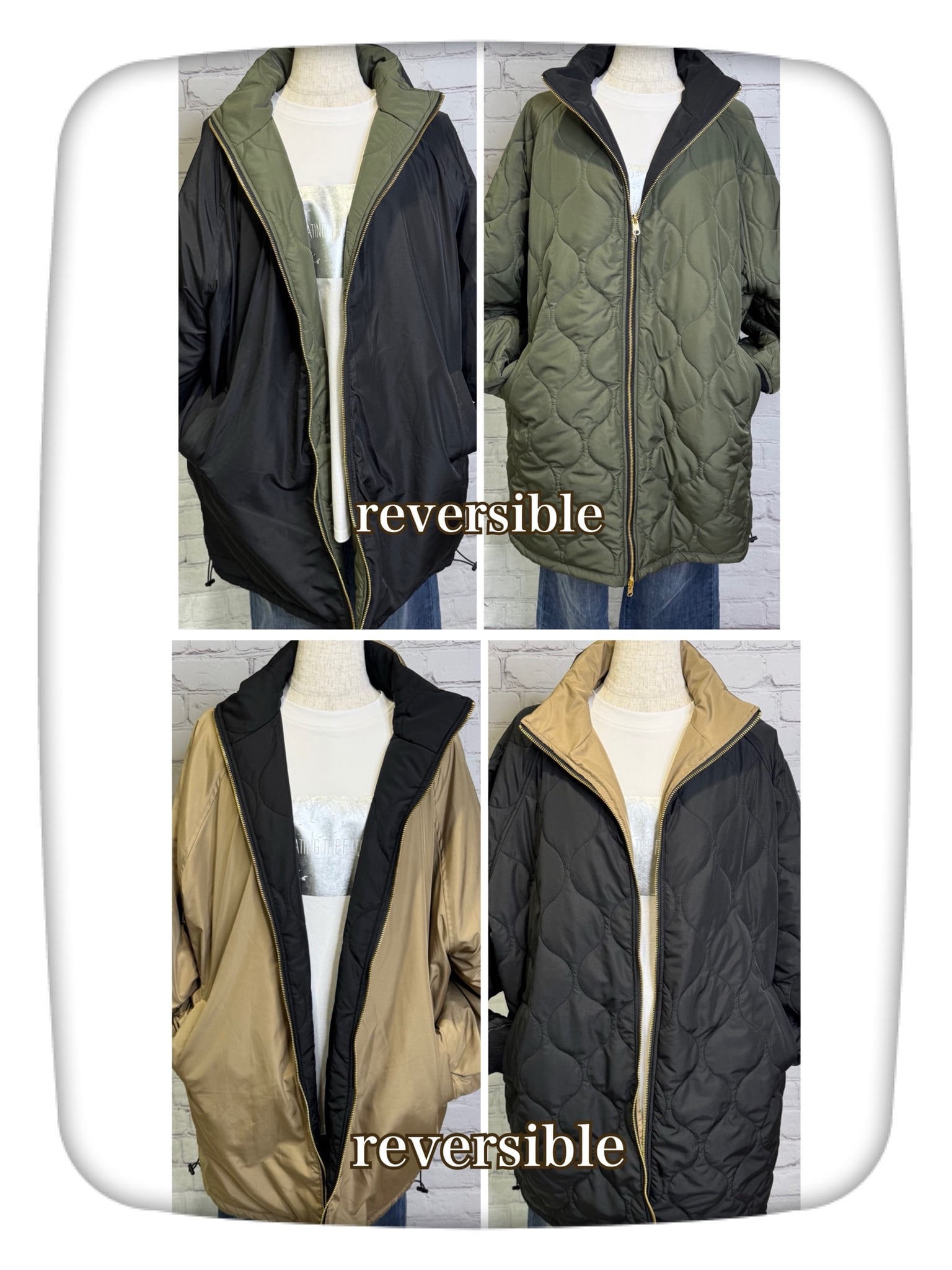 軽くて暖かく、程よくルーズでオーバーサイズのシルエットのミドル丈の中綿入りコートです。表と裏で配色になっていて、無地とキルティング柄のリバーシブル仕様になっています。表と裏で表情を楽しめて、どちらで着ても着回し力抜群のアウターです。裾のドロストで、絞ると立体感のある丸みをおびたシルエットにもなります。袖口は汚れが目ただないブラック仕様。リブも嬉しいポイント!ポケットあり。ダブルファスナー仕様。