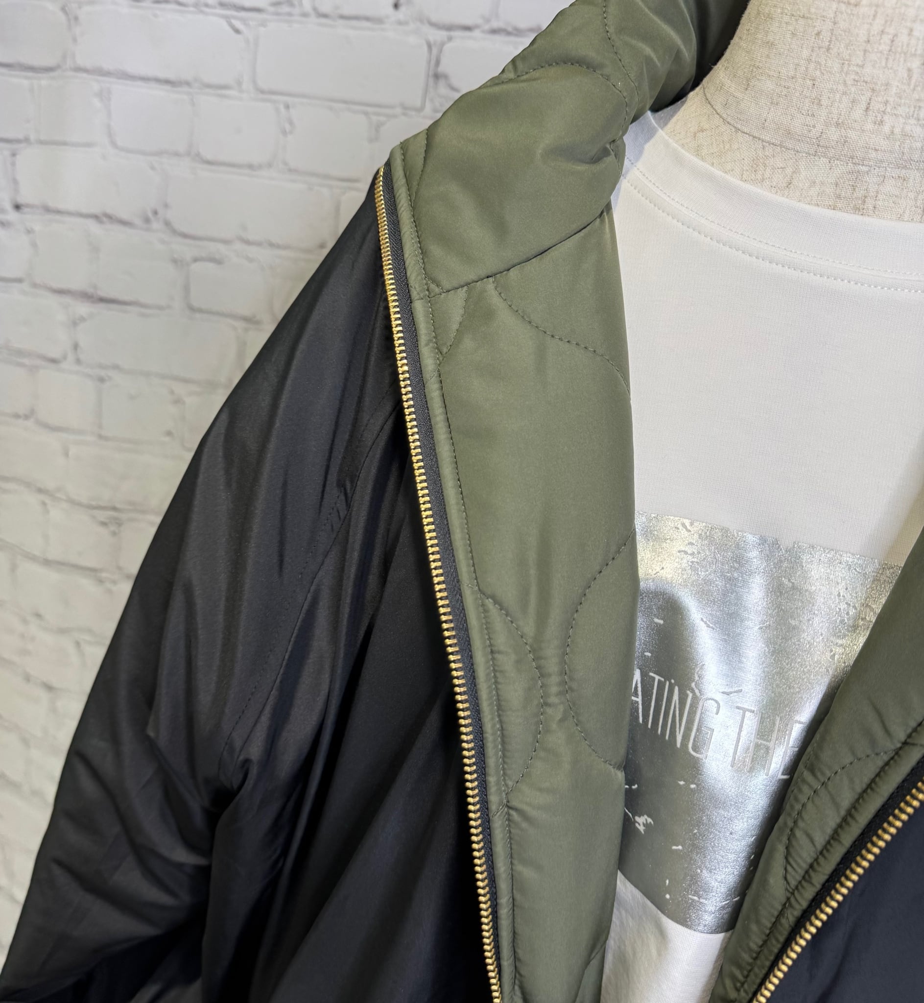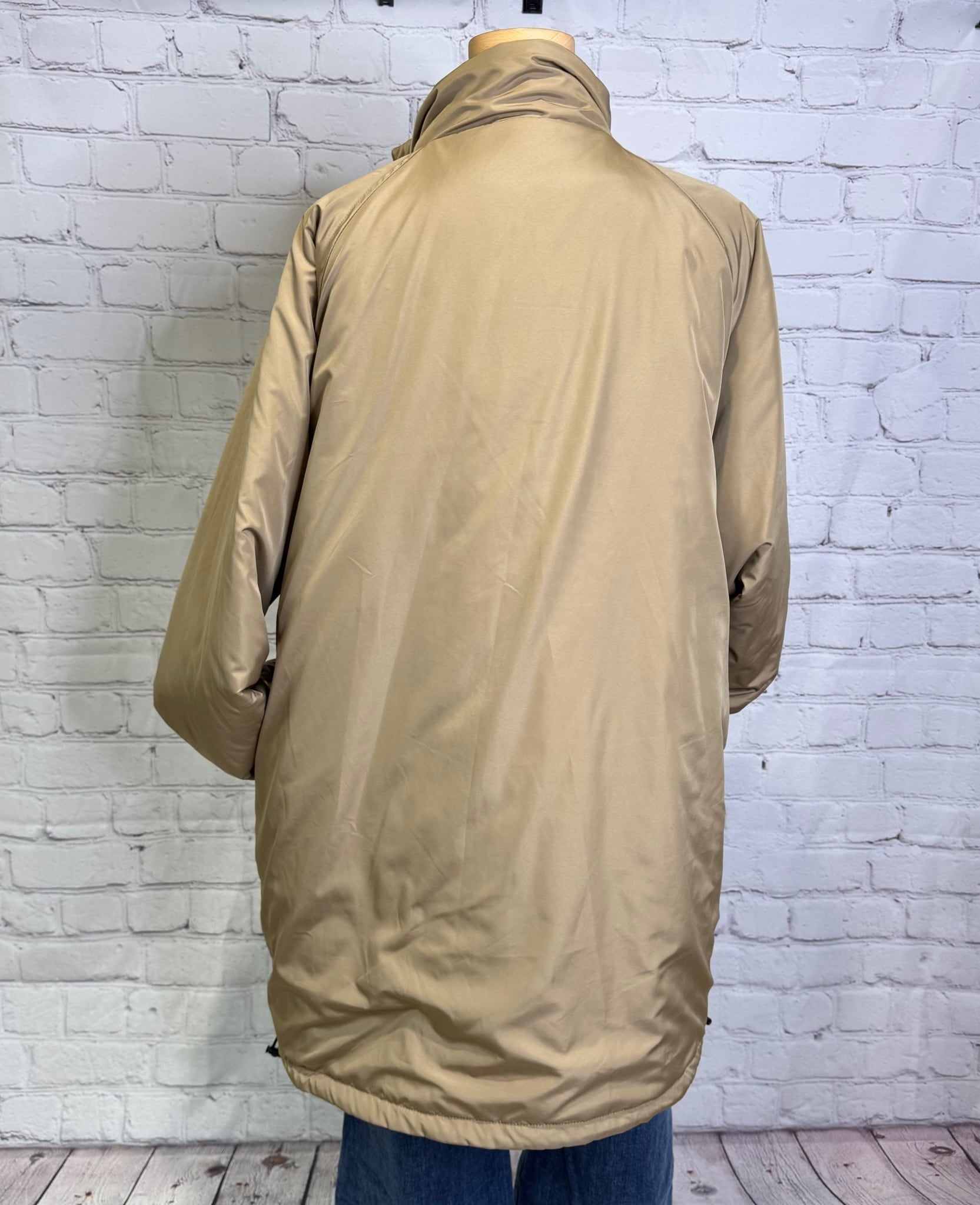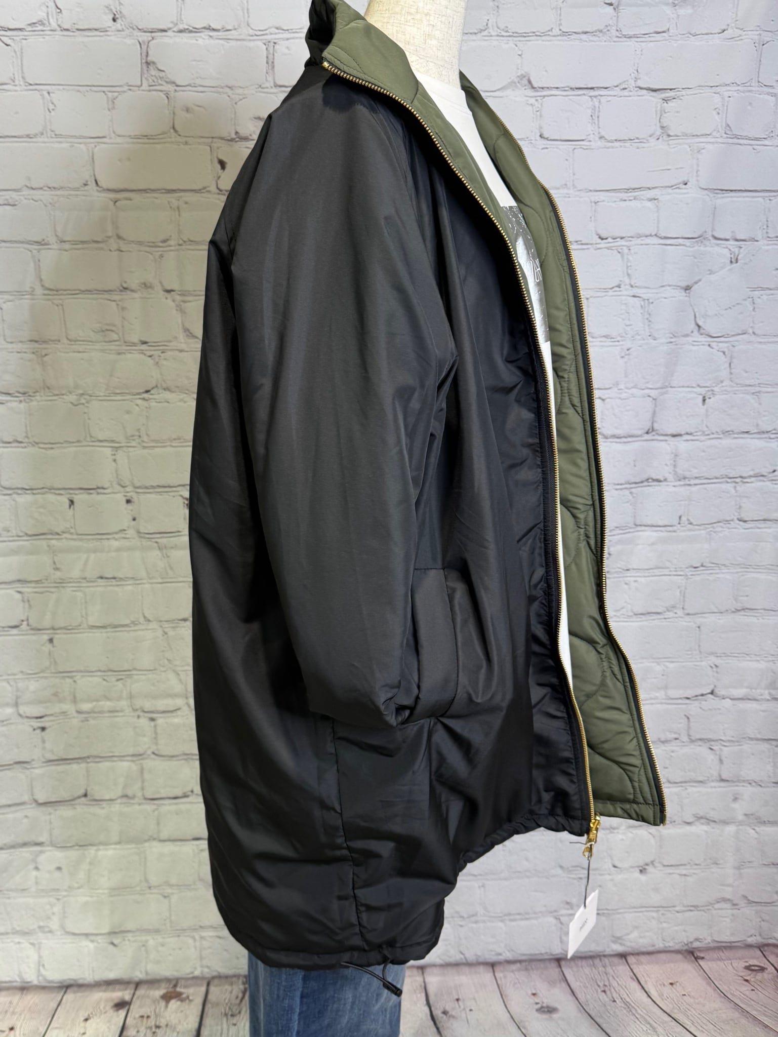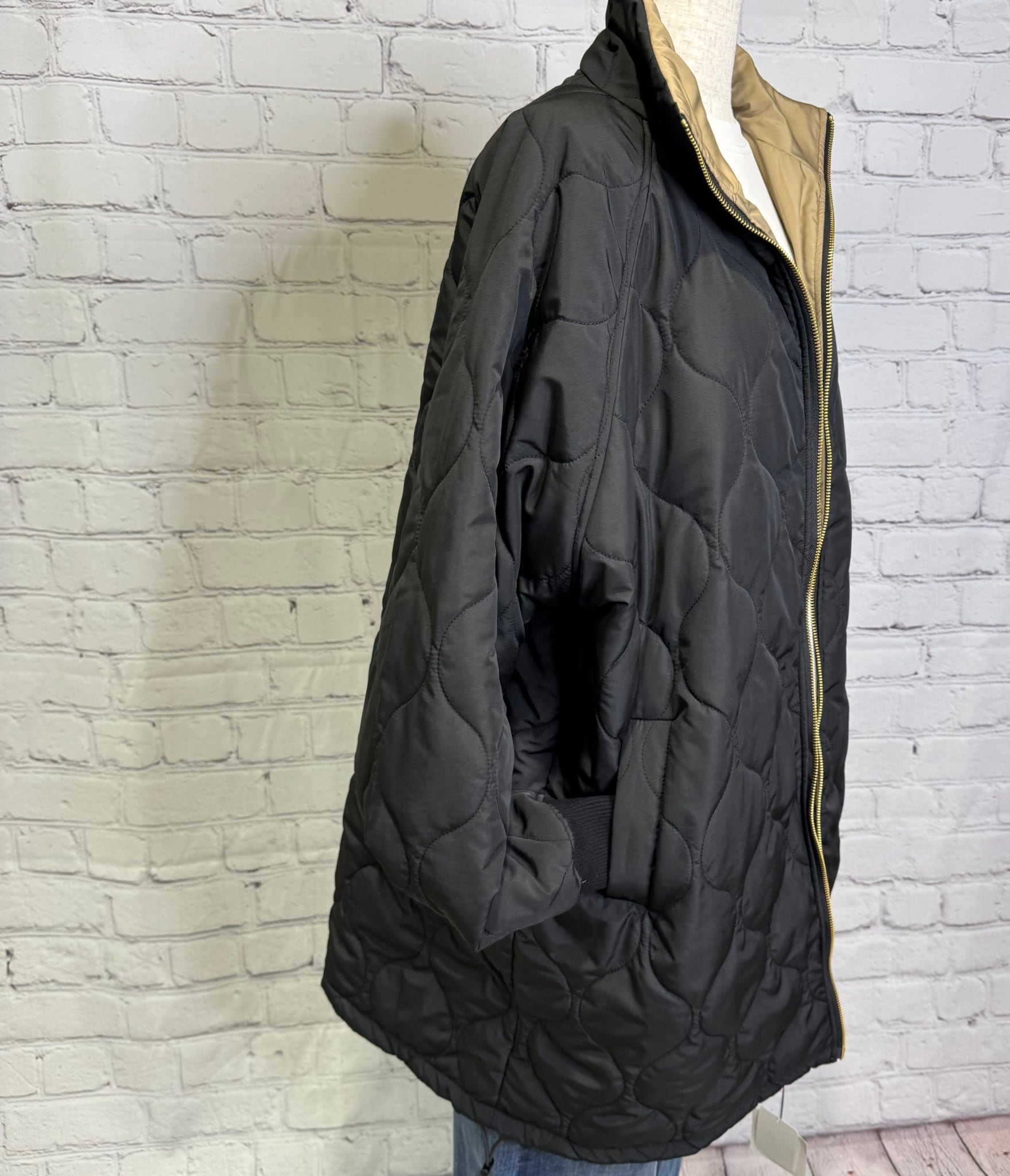軽くて暖かく、程よくルーズでオーバーサイズのシルエットのミドル丈の中綿入りコートです。表と裏で配色になっていて、無地とキルティング柄のリバーシブル仕様になっています。表と裏で表情を楽しめて、どちらで着ても着回し力抜群のアウターです。裾のドロストで、絞ると立体感のある丸みをおびたシルエットにもなります。袖口は汚れが目ただないブラック仕様。リブも嬉しいポイント!ポケットあり。ダブルファスナー仕様。