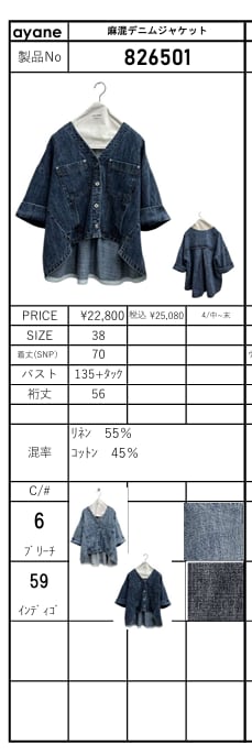 [予約販売] ayane アヤン 麻混デニムジャケット 826501 (4/中〜末入荷予定)