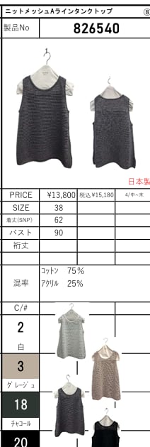 ![[予約販売] ayane アヤン ニットメッシュAラインタンクトップ 826540 (4/中〜末入荷予定)](https://baseec-img-mng.akamaized.net/images/item/origin/1ba8516f2d348e9322d7e0d96cfd459e.jpg?imformat=generic)