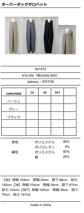 [予約販売] CYAN TOKYO シアントーキョー オーバータックサロペット 601472 (5月中旬入荷予定)