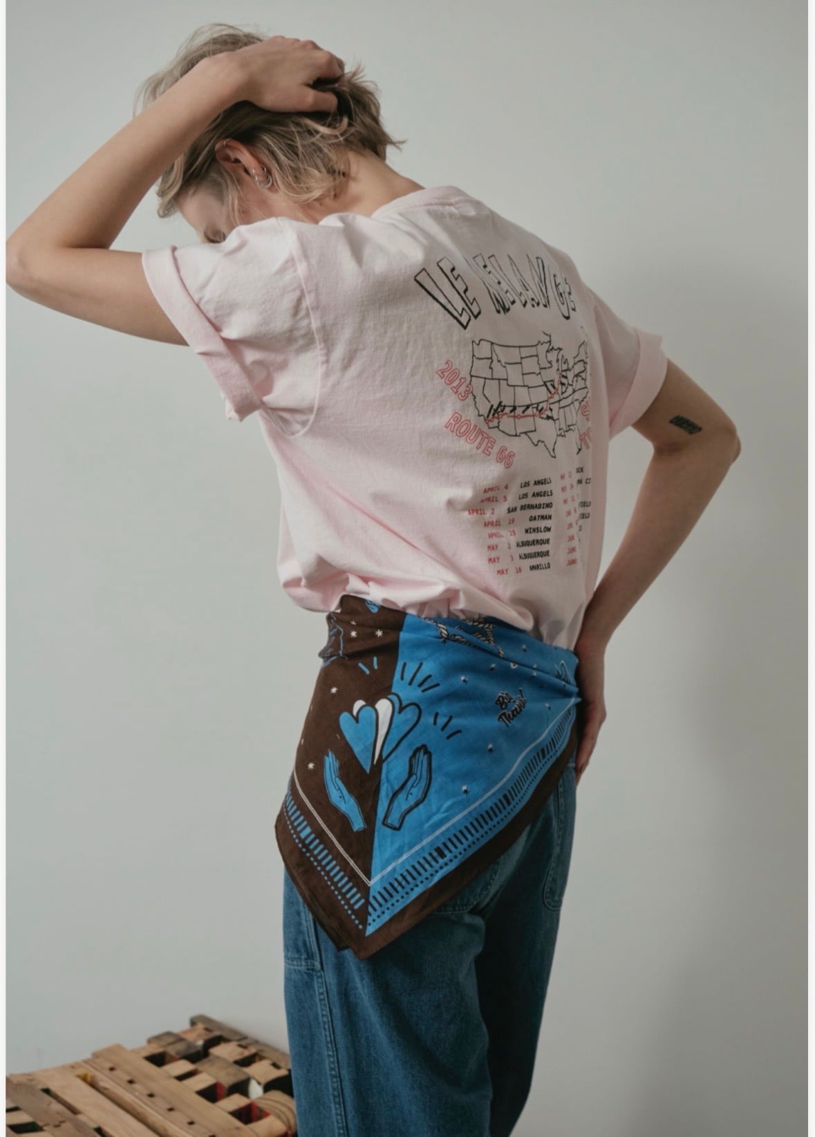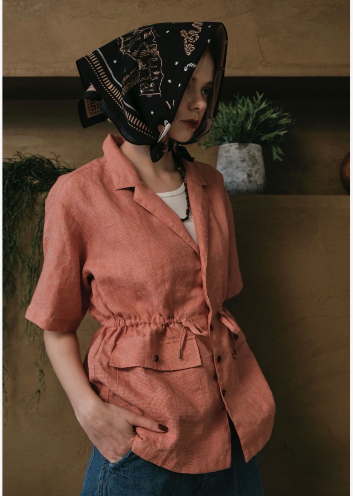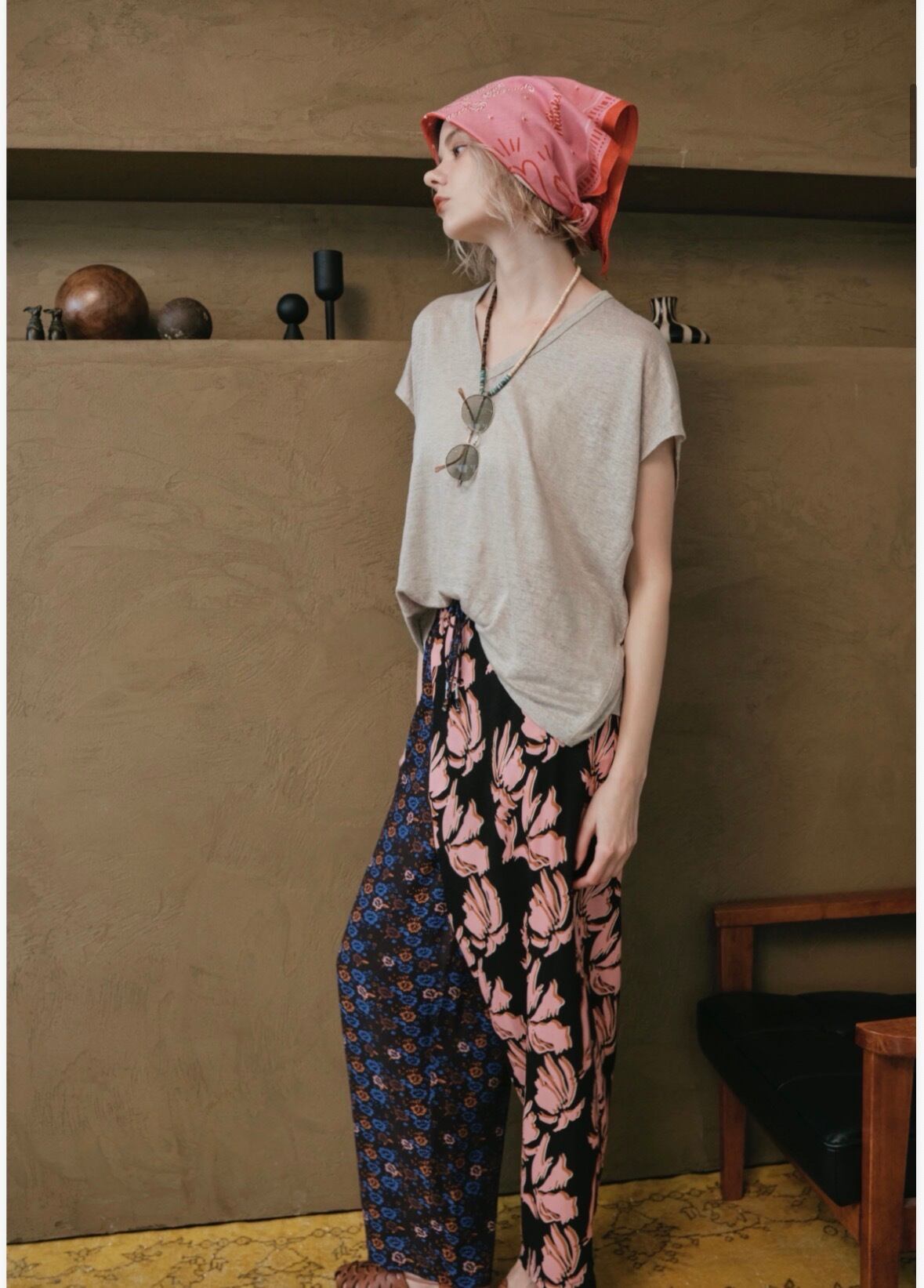 人気アイテムのアーカイブモチーフをレイアウト、対角線でカラーブロッキングしたデザインです。折り方で見えるカラーが変えられるので、同じ巻き方でもアレンジの巾が広がります。64㎝×64㎝サイズで対角線は90㎝以上あるので、ネックに、ビスチェ風に、ラップスカート、日除け、バックにつけたりと使い方は無限のおすすめアイテムです! 日本製。