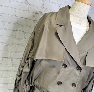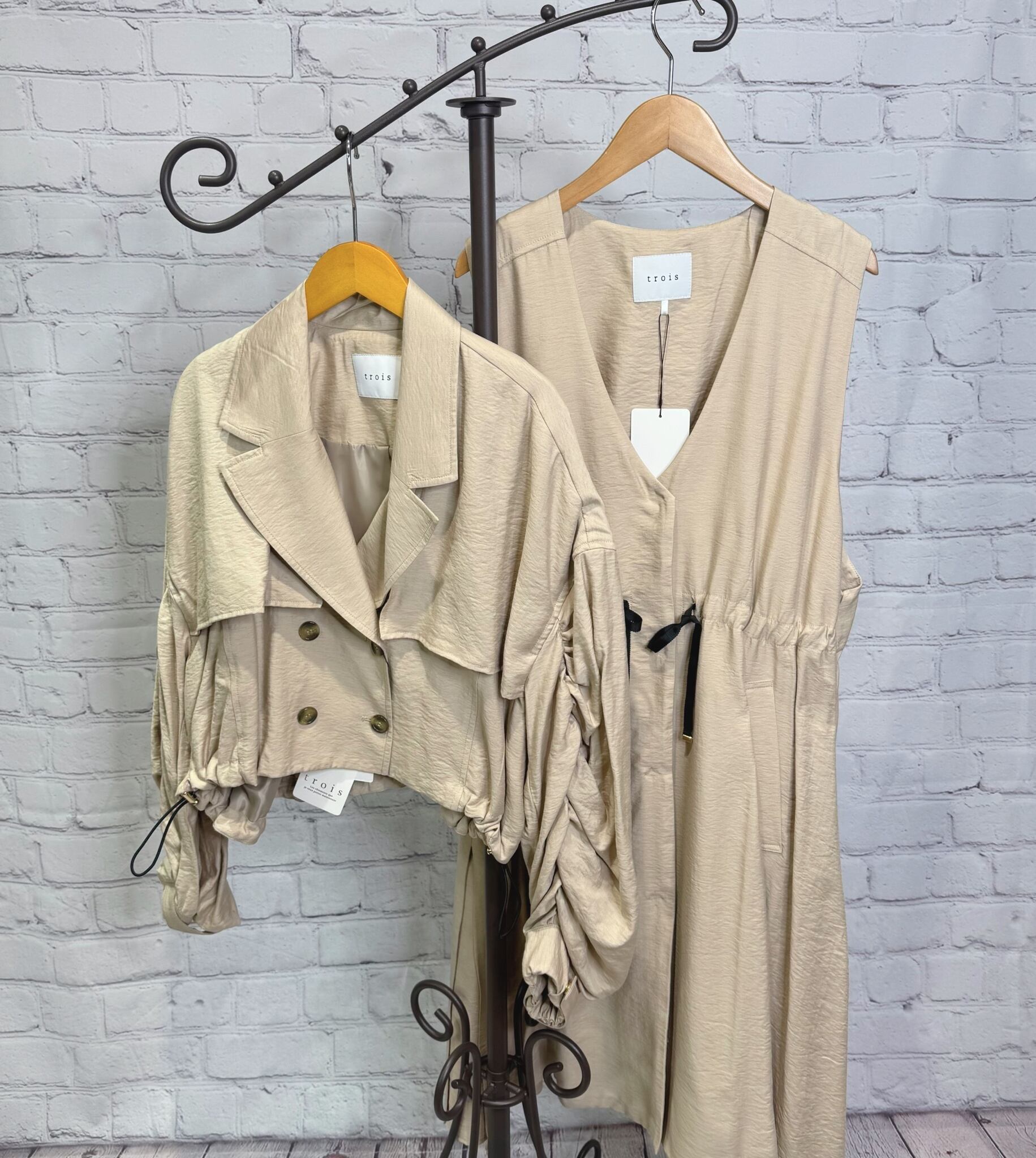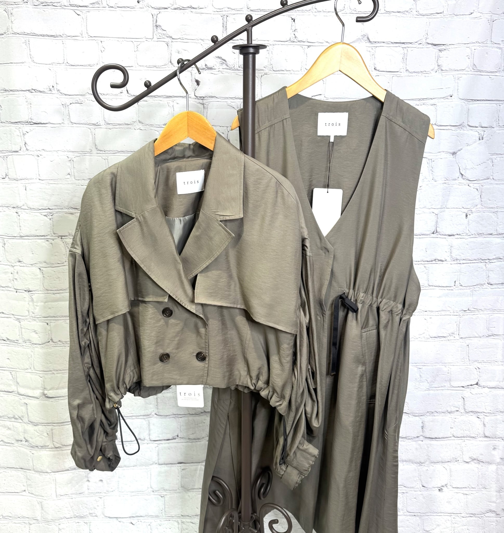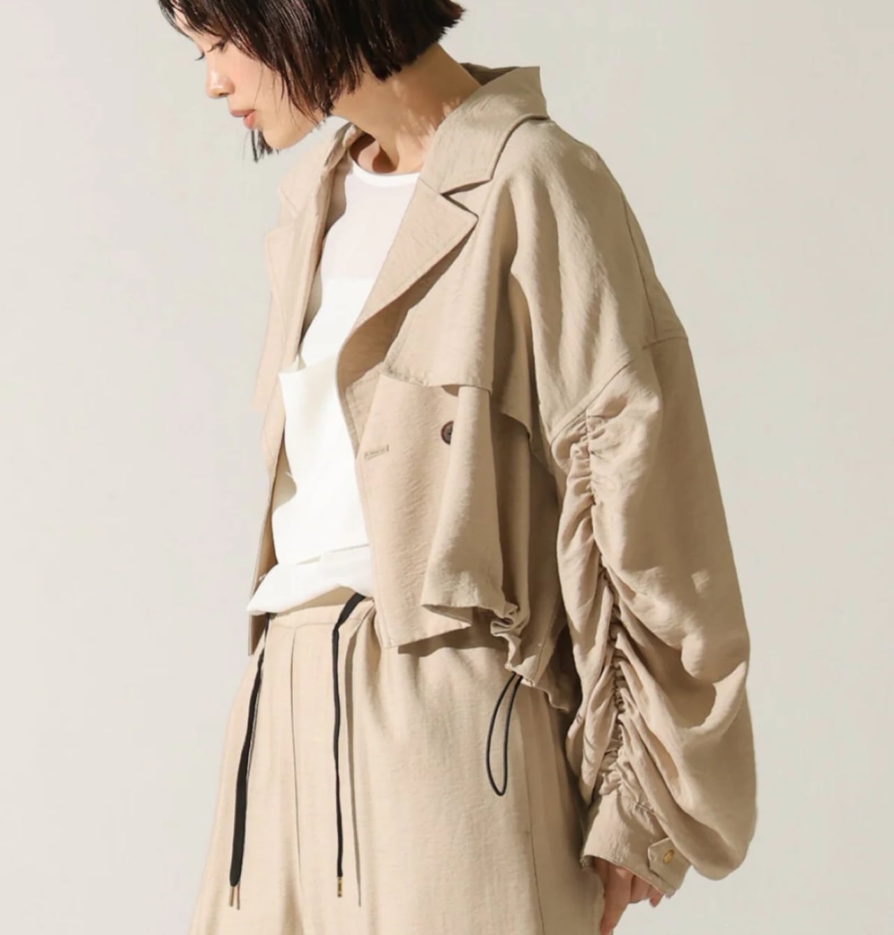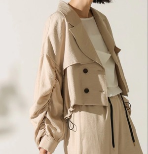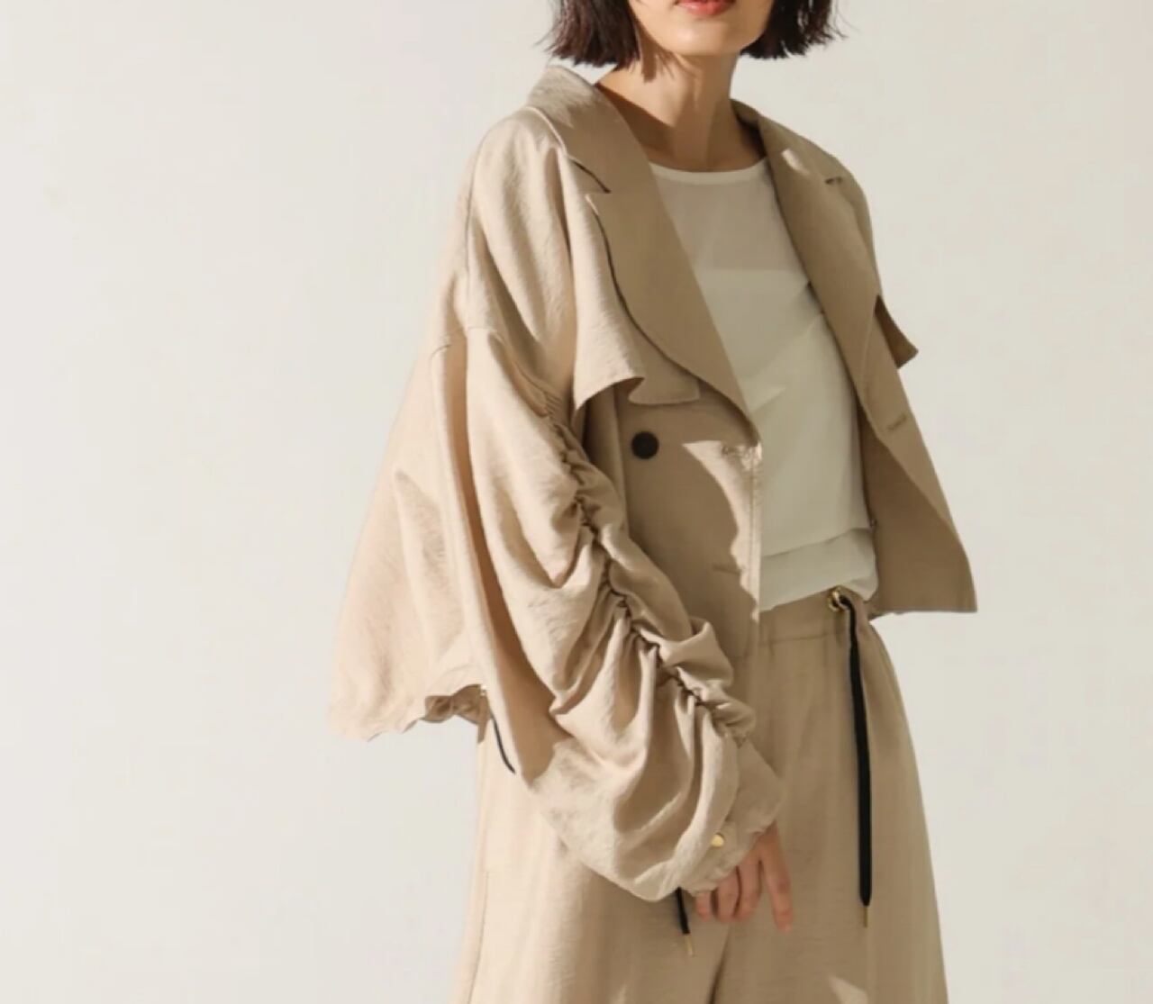落ち感のあるワッシャーデシンを使用したショートトレンチ。袖のボリュームやショート丈がアクセントに。短すぎない丈感で、パンツ、スカートどちらともバランスよく合わせられます。ラフに羽織れるデザインながら、素材の上品さで大人っぽく仕上がり、デイリーからきれいめカジュアルまで幅広くて活躍してくれます。同色同素材のロングジレ(T261-83014)と合わせてロングコート風でも着ていただけます。