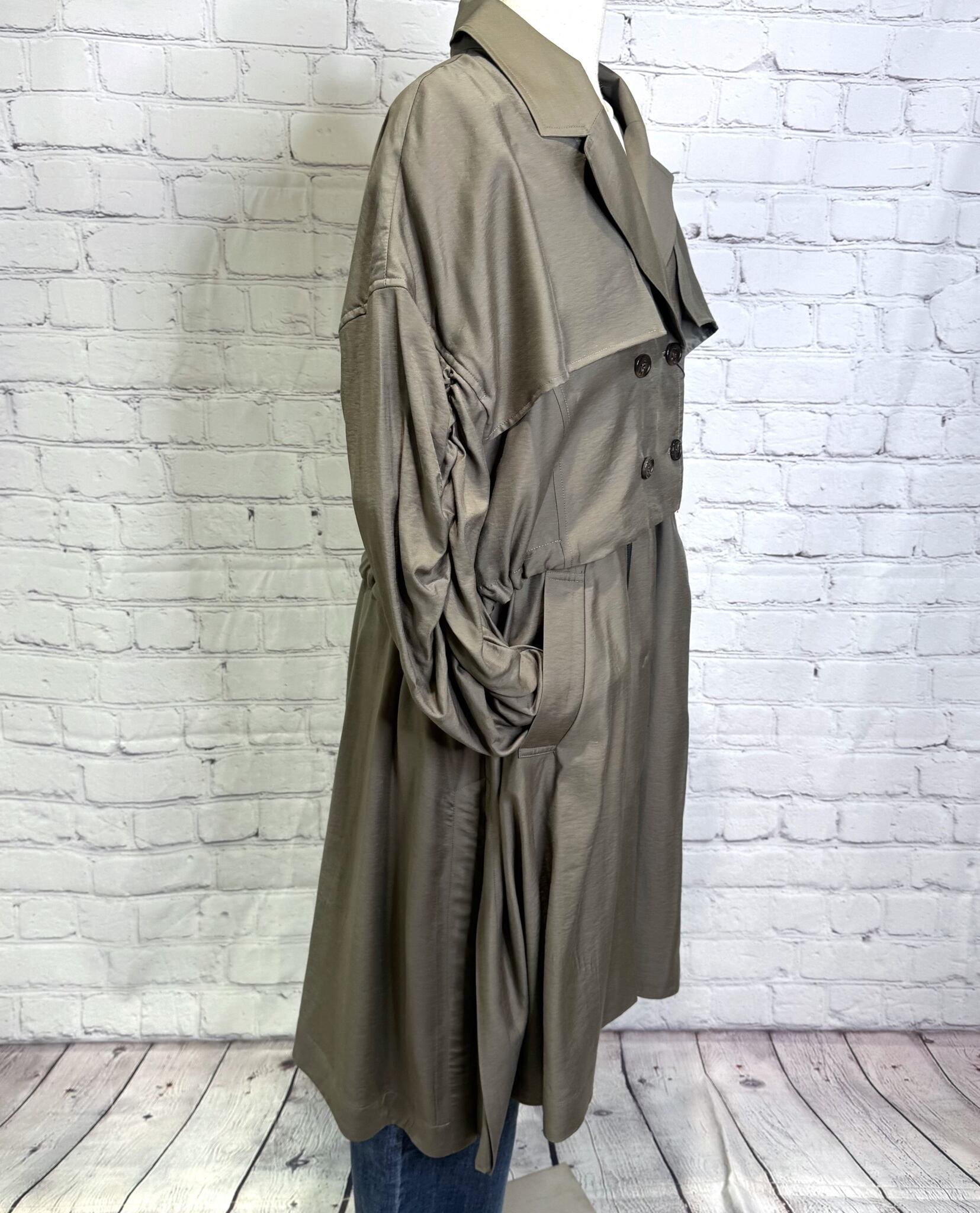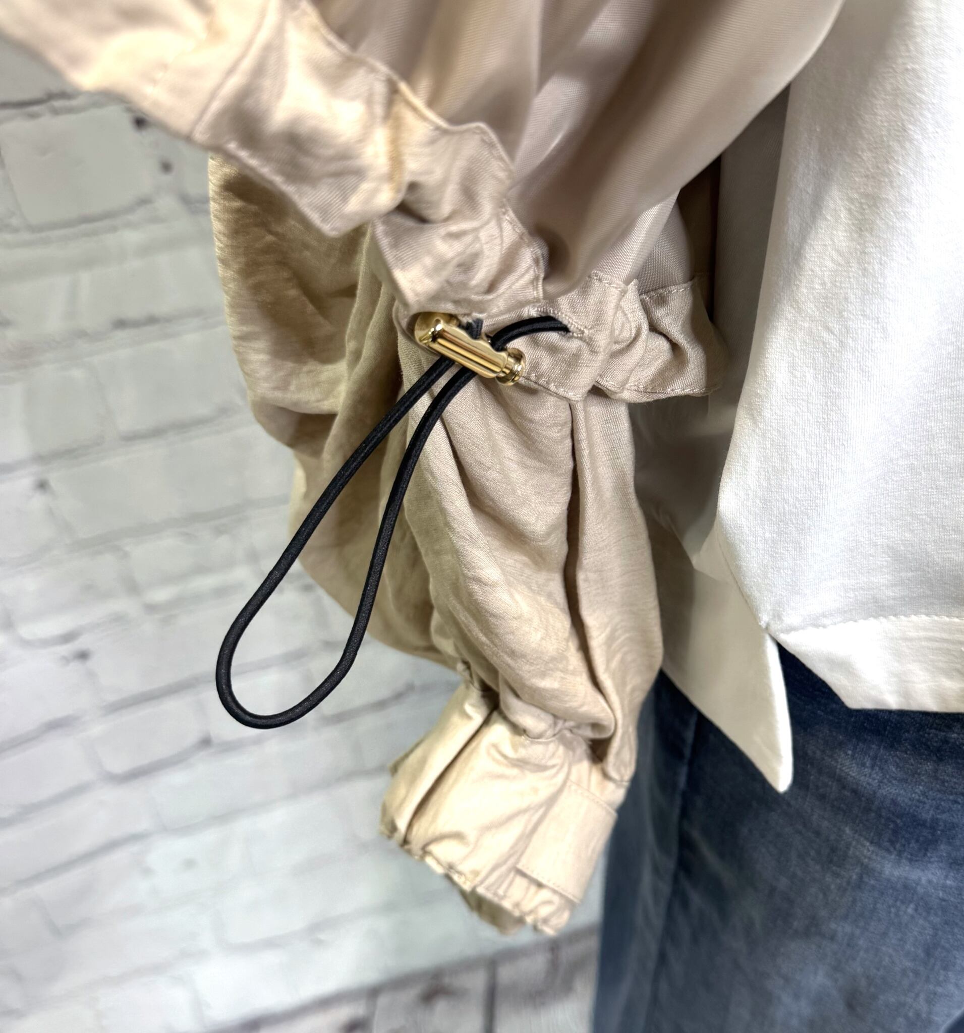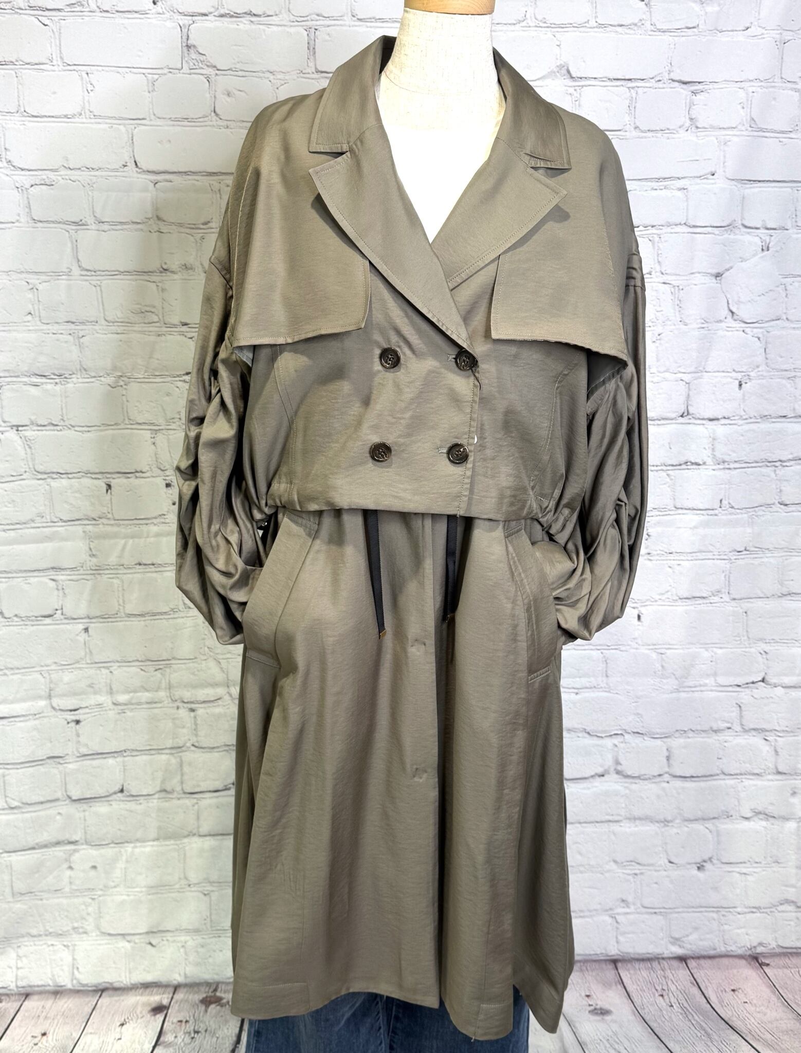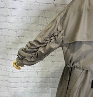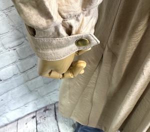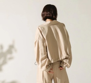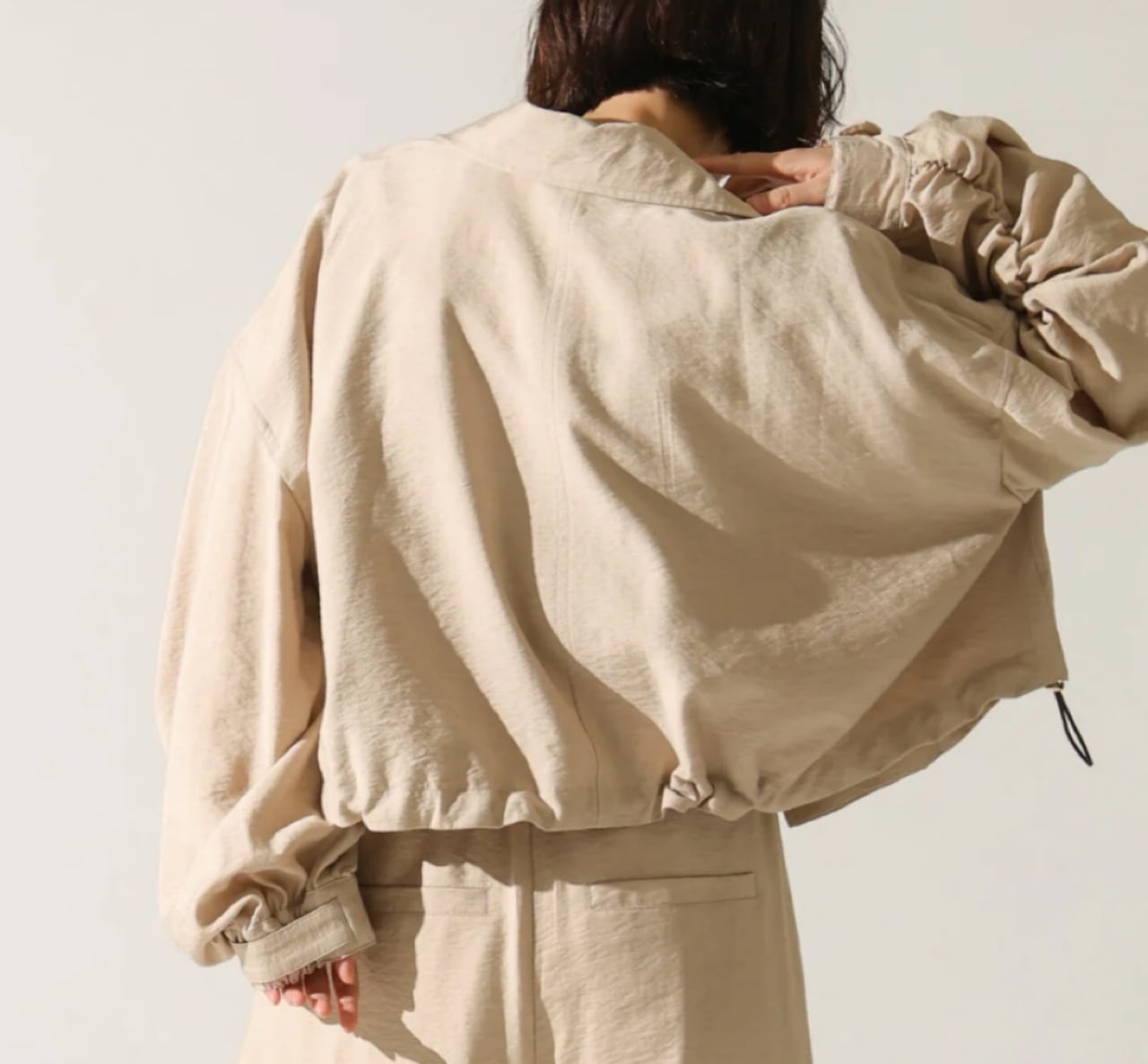 落ち感のあるワッシャーデシンを使用したショートトレンチ。袖のボリュームやショート丈がアクセントに。短すぎない丈感で、パンツ、スカートどちらともバランスよく合わせられます。ラフに羽織れるデザインながら、素材の上品さで大人っぽく仕上がり、デイリーからきれいめカジュアルまで幅広くて活躍してくれます。同色同素材のロングジレ(T261-83014)と合わせてロングコート風でも着ていただけます。