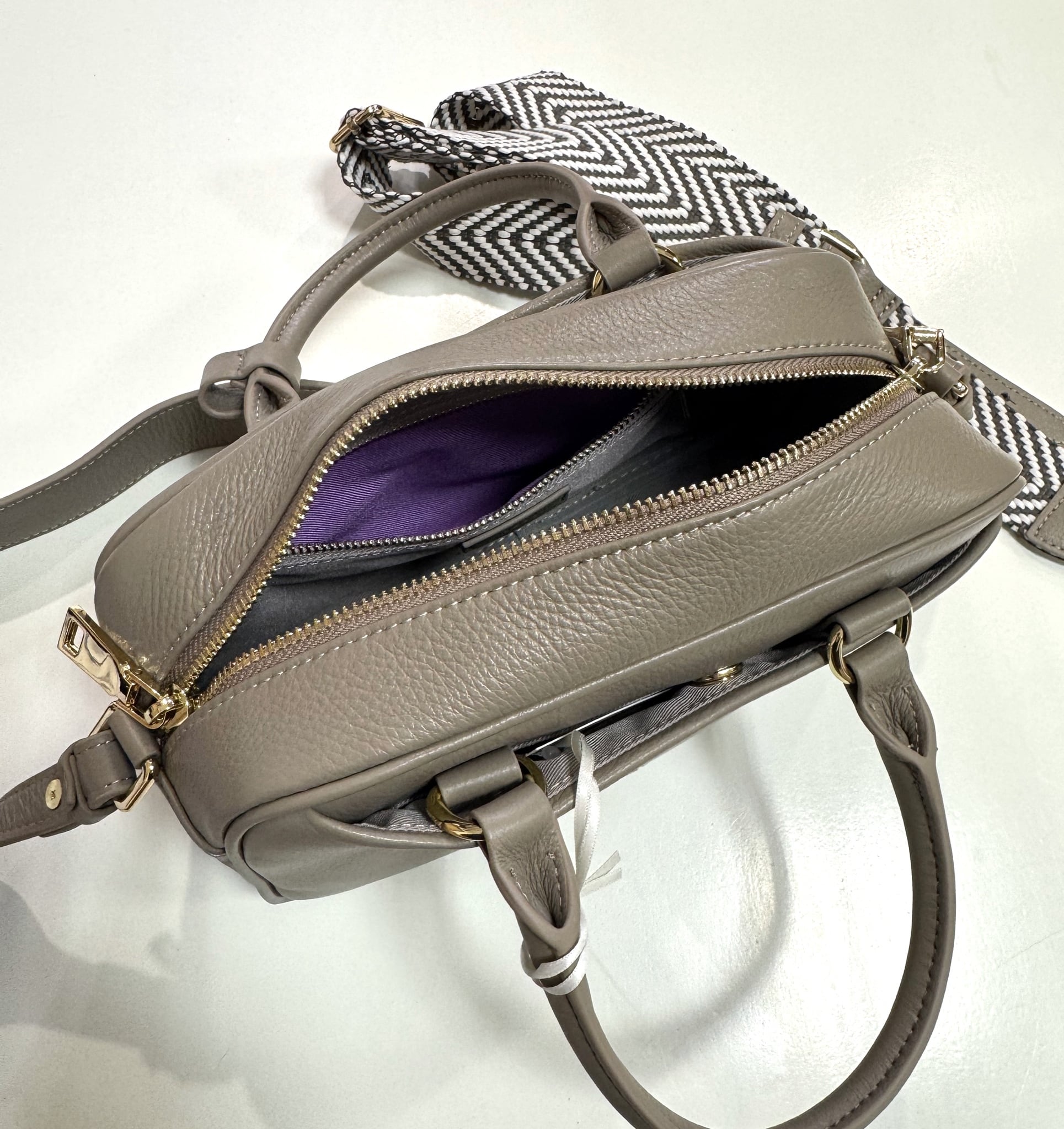 春夏らしい綾織の斜め掛けコンビテープ、肩掛け用のレザーストラップなどシーンに合わせて3WAYでお疲いいただけます。シボのある柔らかいレザーで傷や汚れが目立ちにくく、経年変化も楽しめます。