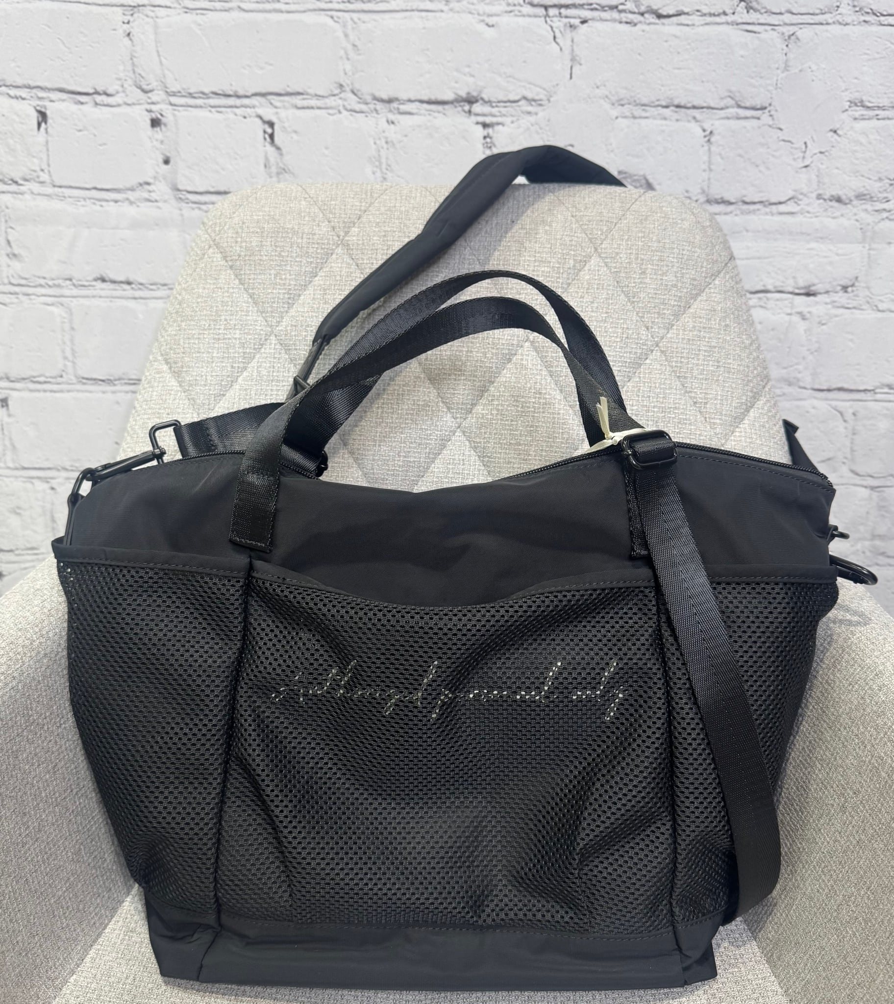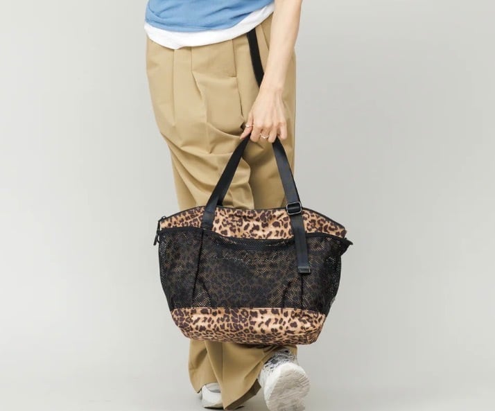 バッグ周囲に涼しげなメッシュポケットを配したユニセックスなミドルトートバッグです。