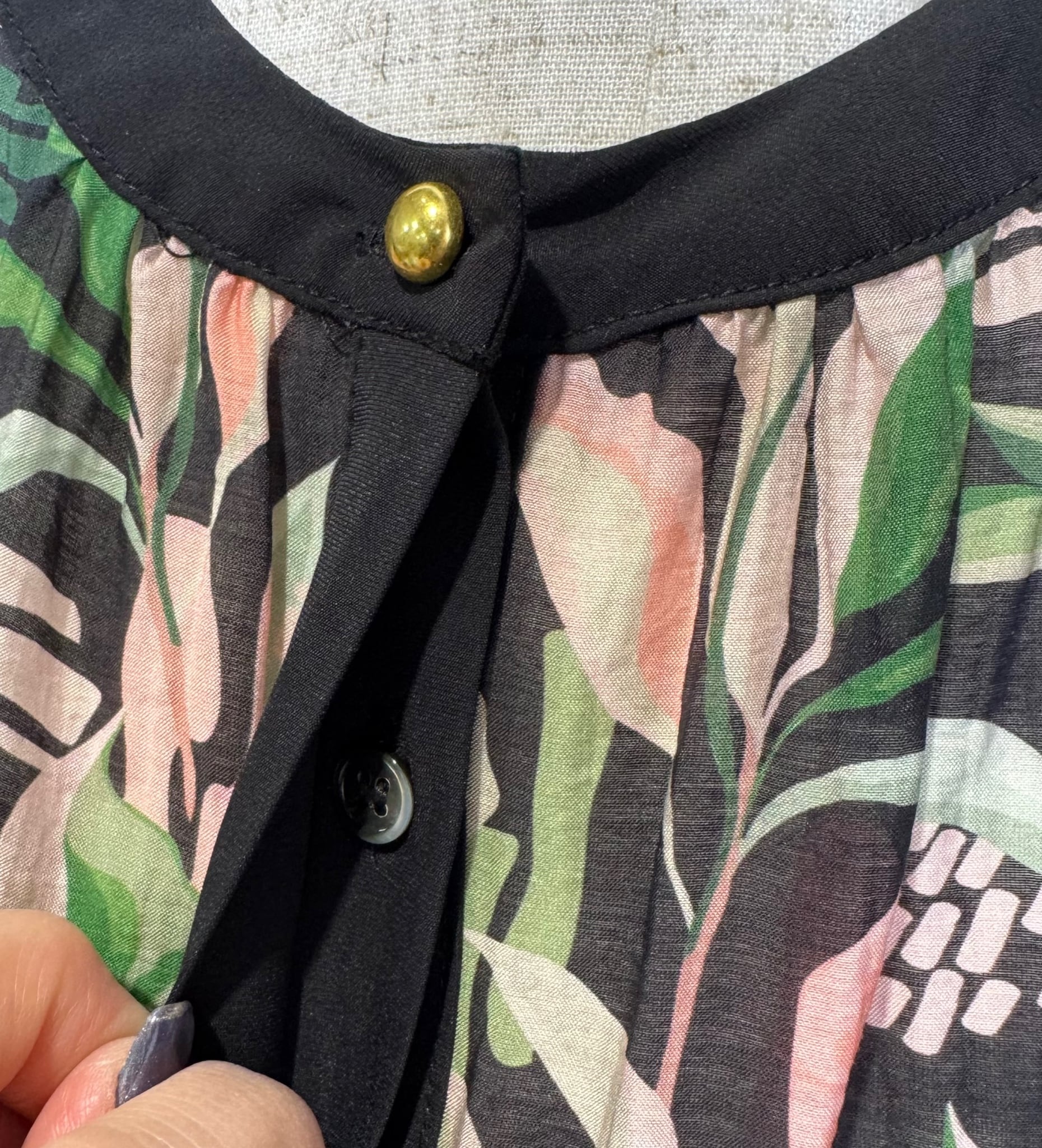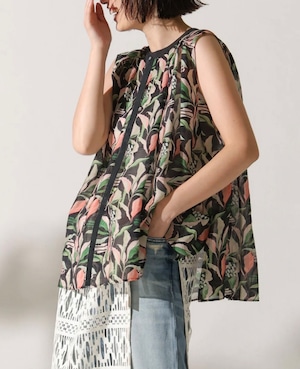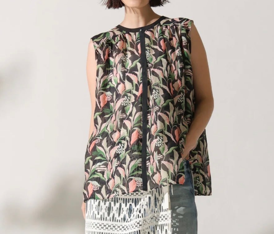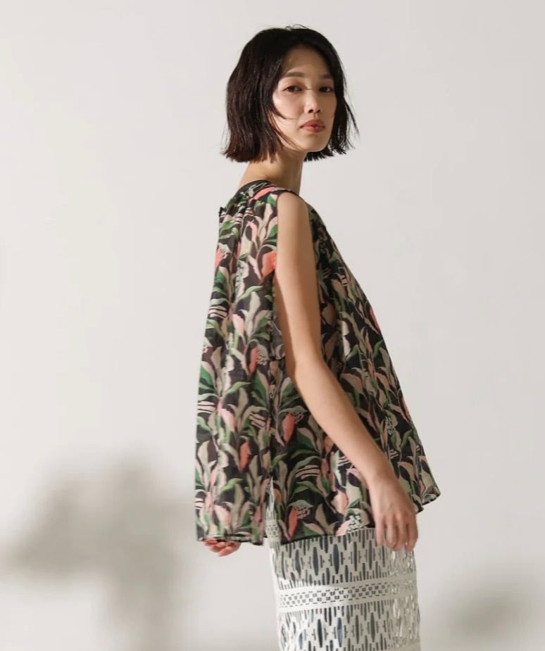 軽やかなフラワープリントが目を引く、ノースリーブのギャザーブラウスです。全体にたっぷりとギャザーを入れることで、ふんわりとした立体感のあるシルエットに仕上げています。比翼仕立てのフロントデザインがすっきりと上品な印象を与え、大人っぽく着こなせるのが魅力。ヒップにかかる丈感で体のラインを自然にカバーしつつ、パンツスタイルとの相性も抜群です。一枚で着映えするため、シンプルなボトムと合わせるだけでスタイリングが完成します。お家で洗えます。