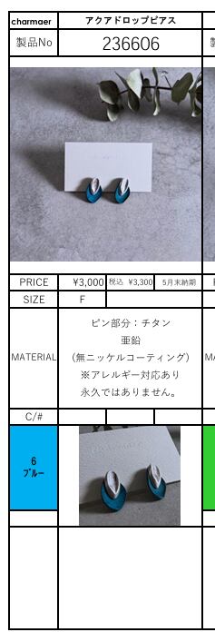 [予約販売] charmaer チャーマー アクアドロップピアス 236606 (5/末入荷予定)