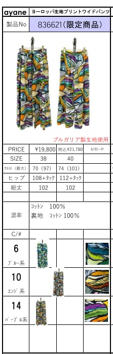 [予約販売] ayane アヤン ヨーロッパ生地プリントワイドパンツ 836621 (6/初〜中入荷予定)