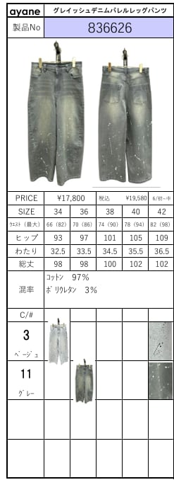 ![[予約販売] ayane アヤン グレイッシュデニムバレルレッグパンツ 836626 (5/末〜6/中入荷予定)](https://baseec-img-mng.akamaized.net/images/item/origin/8ec0925c8027ffd50b6cee0e649a9be8.jpg?imformat=generic)