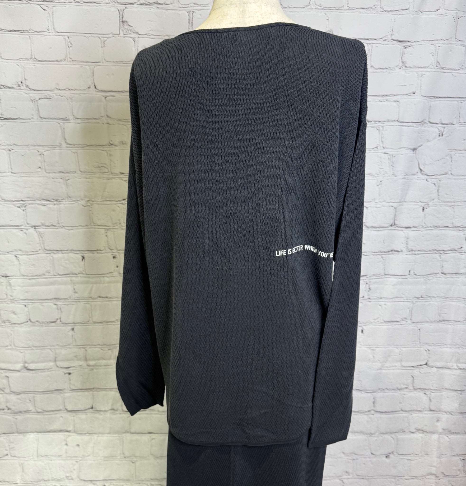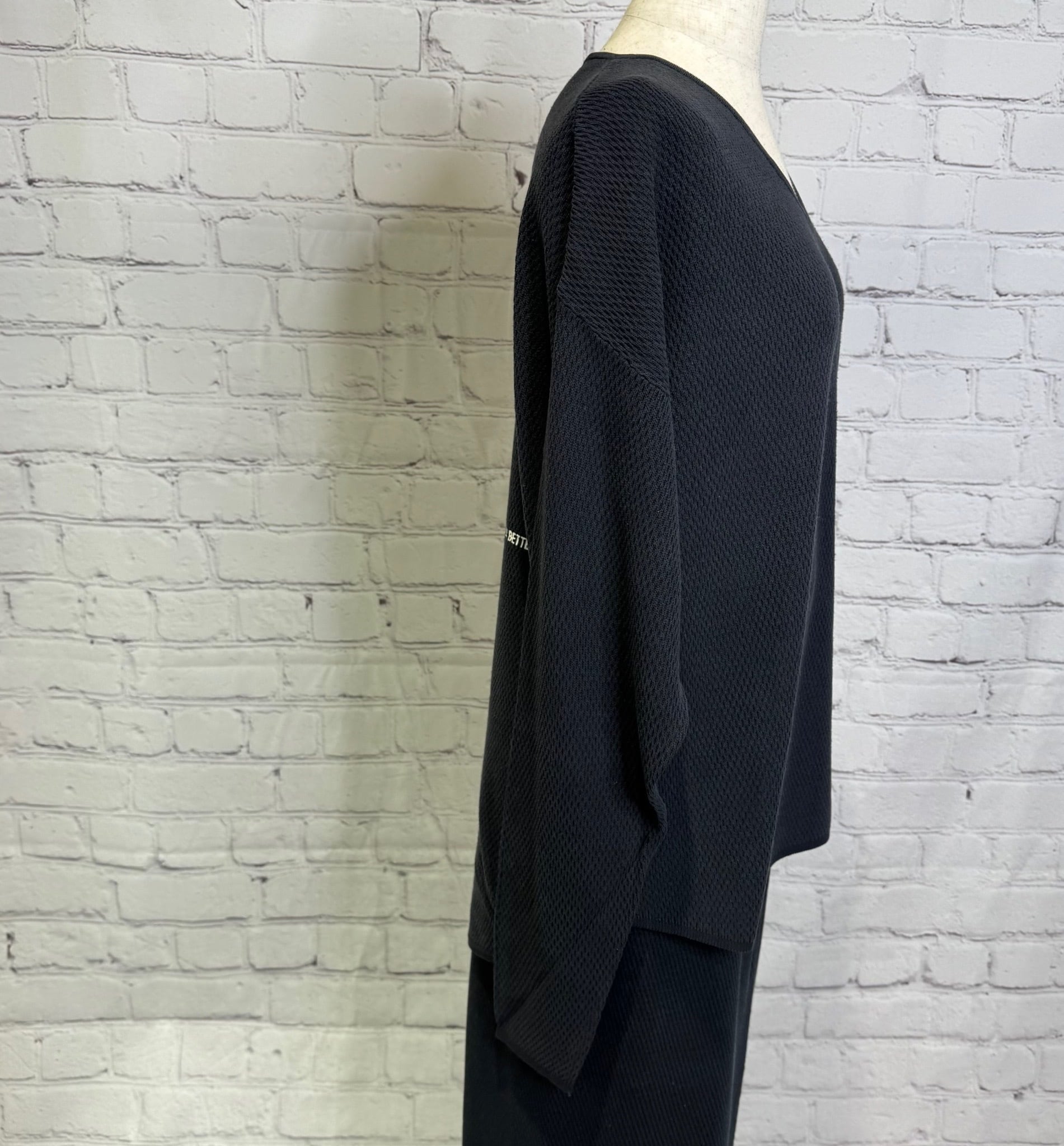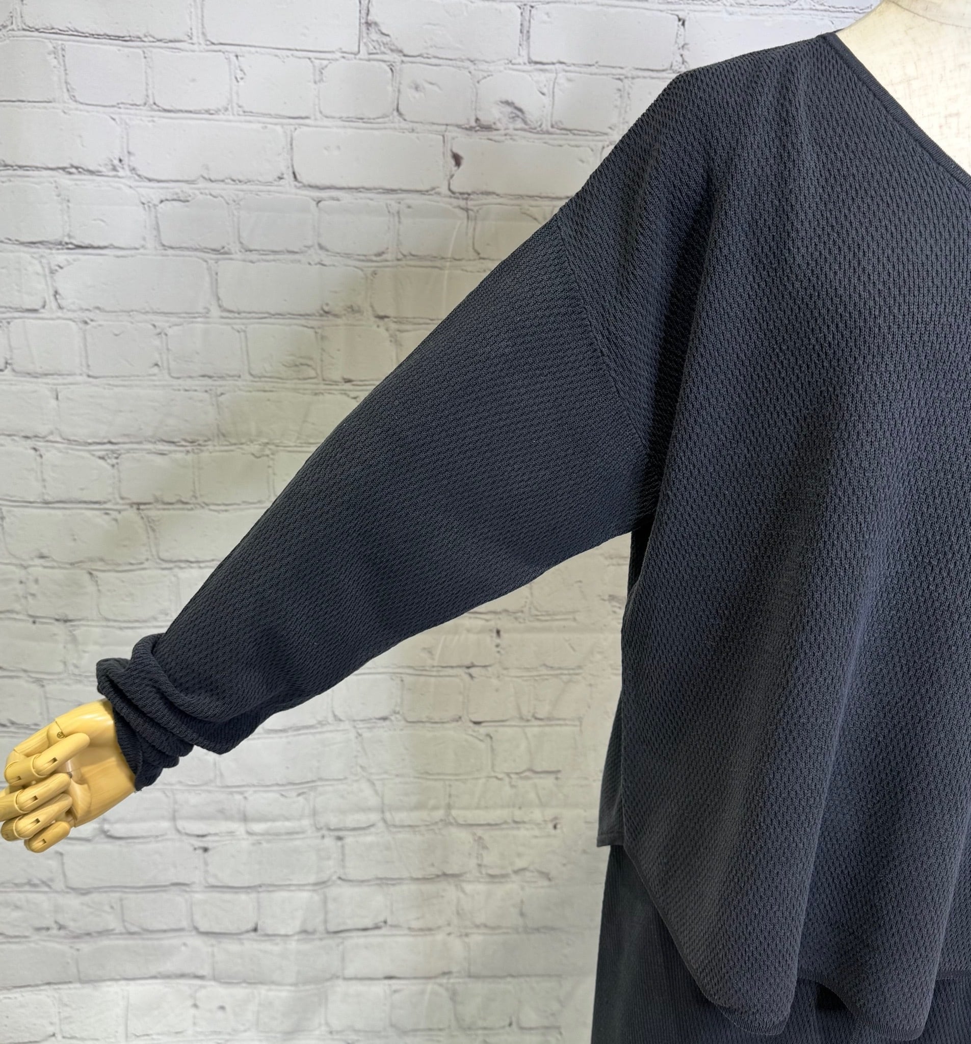 ハニカムワッフル編みのVネックプルオーバーです。Vネックで首元すっきり! バックスタイルのちょいロゴがポイントです。同色同素材のタイトルスカート(510113)とのセットアップコーデもおすすめです。お家で洗えます。