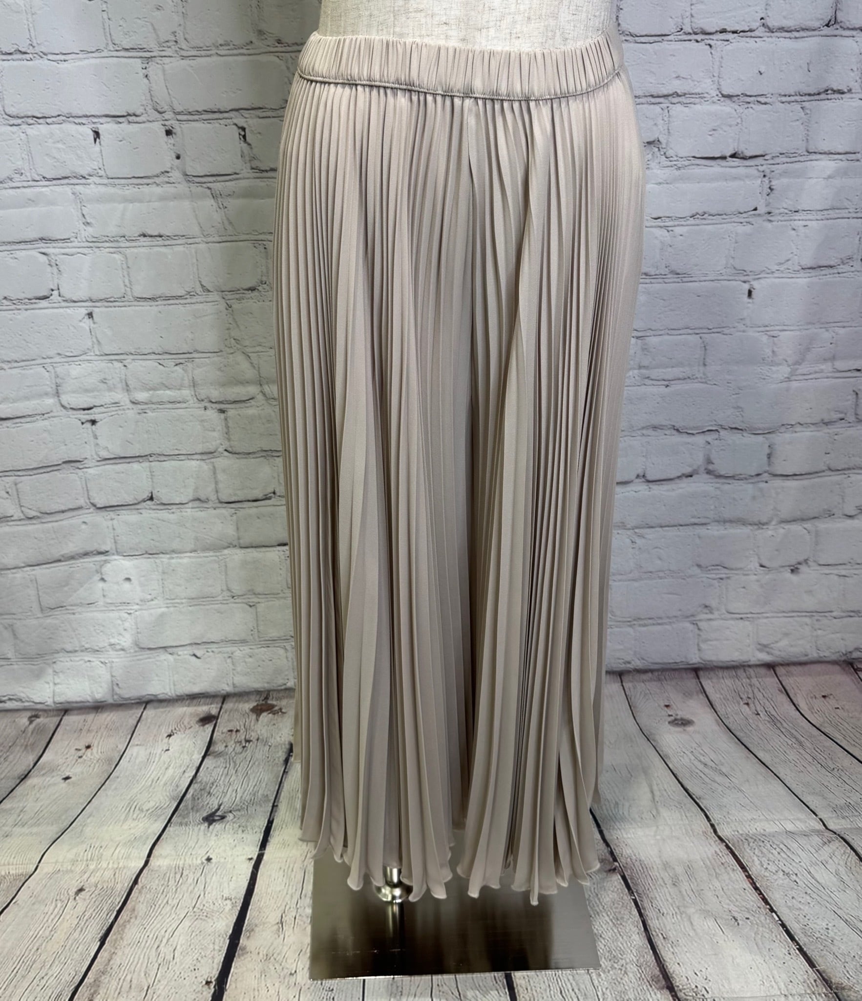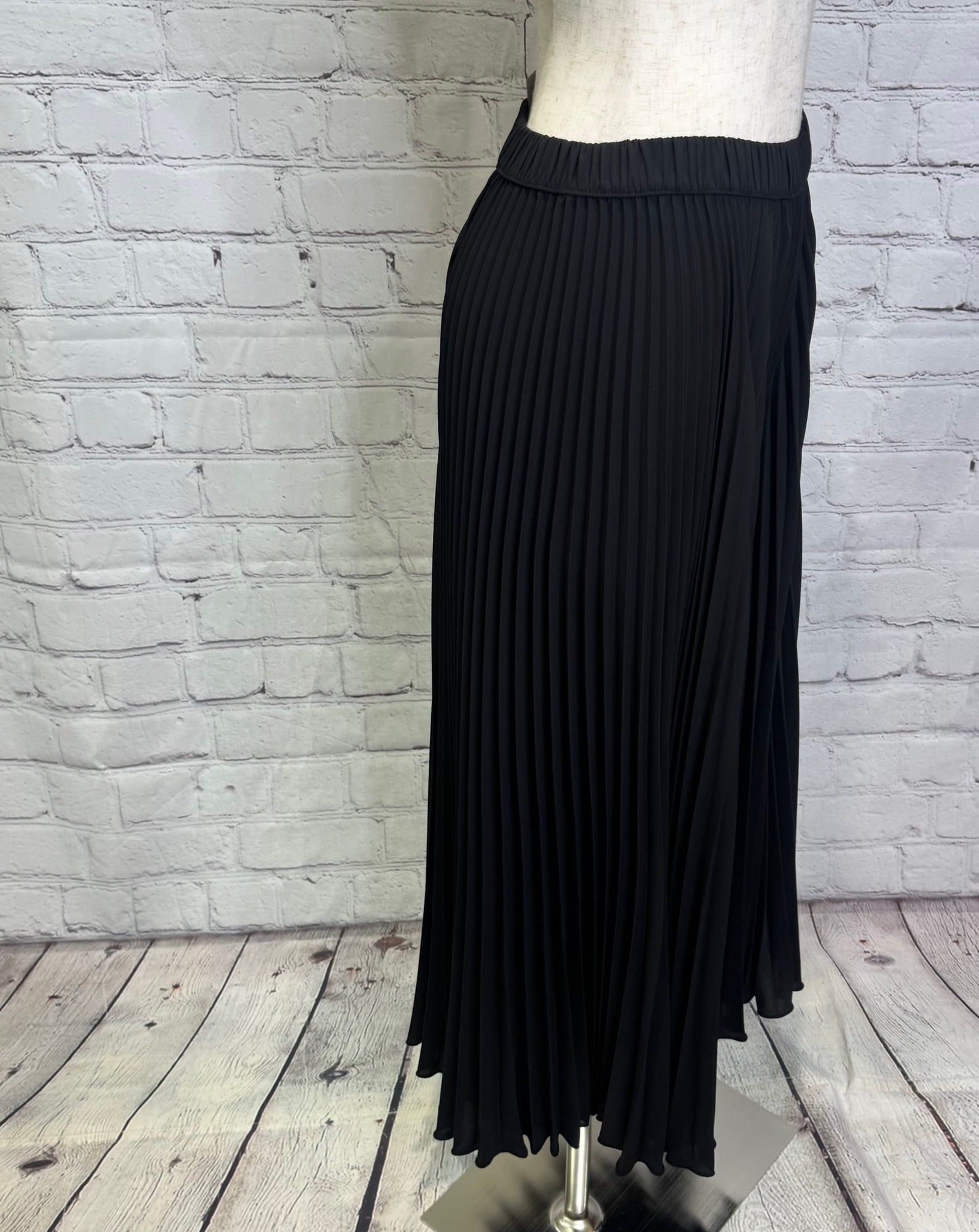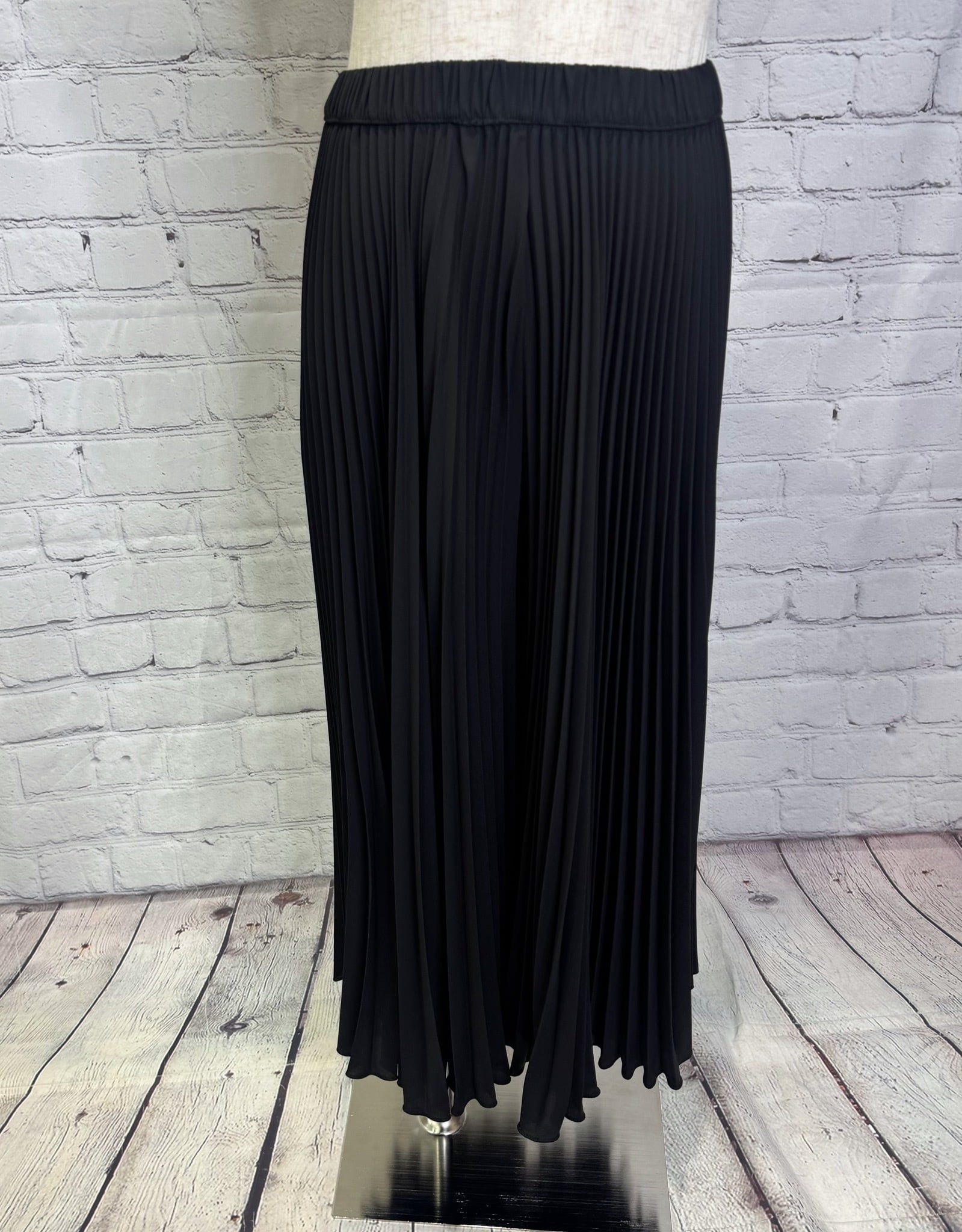 アコーディオンプリーツですがボリュームを抑えた作りですっきりと着用できます。サラッとした風合いで、裏地無しでも透け感が気にならず涼しく着用できます。ウエストゴムも嬉しいですね♡ お家で洗えます。