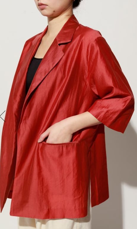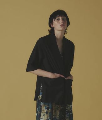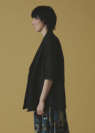 程よい透け感が映える、テンセル五分袖ジャケットです。シンプルなデザインながら、素材の上質さが際立つ大人アイテム。程よい透け感が涼しげで、肌に触れるテンセルの柔らかさが心地よく、アセテート特有の自然な光沢が上品な印象です。きれいめボトムと合わせれば通勤スタイルに、Tシャツやデニムと合わせれば大人の抜け感カジュアルに、シーンを選ばず、上品な軽やかさとモード感を兼ね備えた洗練されたワードロープに必須の万能ジャケットです。