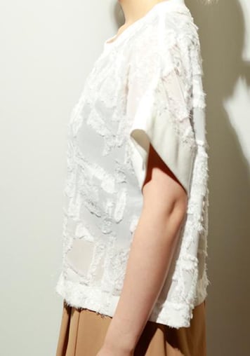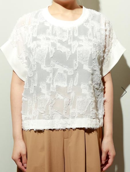 立体的なカットジャガードが生み出す微細な陰影とほんのりとした透け感、軽さがオンオフにも対応し、品良く抜け感を作る万能プルオーバーです。袖口と衿には別布リブを添え、フェミニンな表情にほどよいカジュアルさをプラス。ヒップにかからないすっきり丈が、どんなボトムともバランスよく決まり自然とスタイルアップに♡