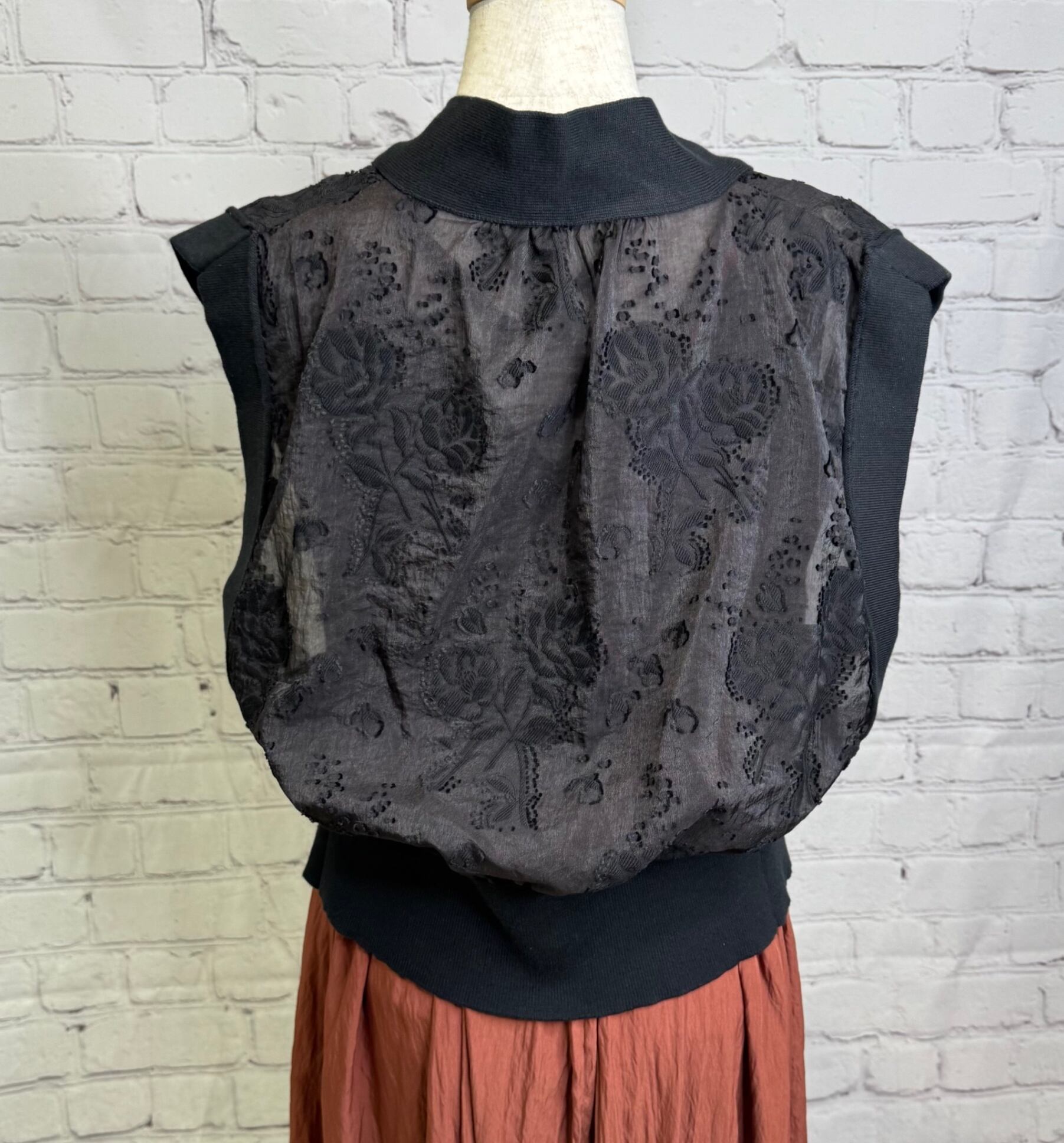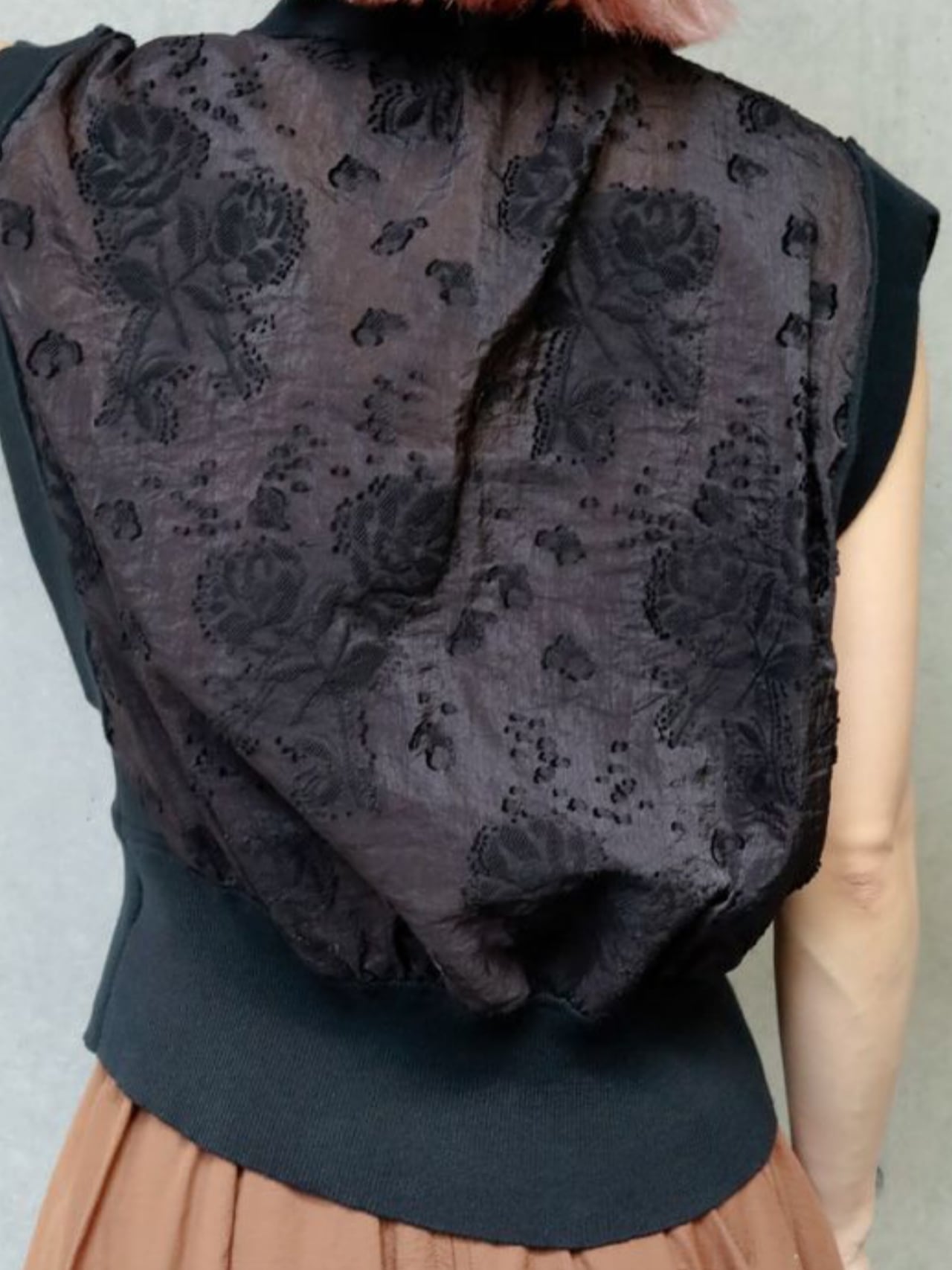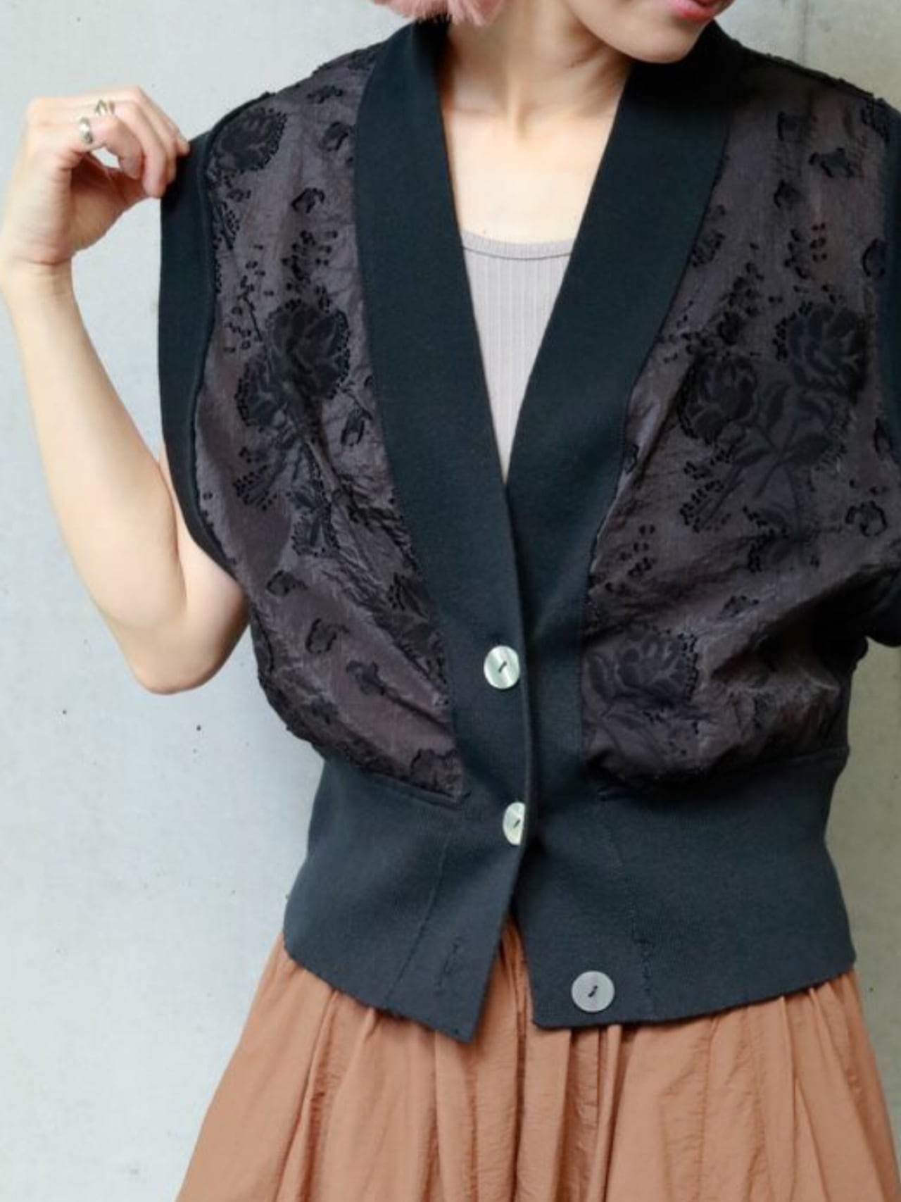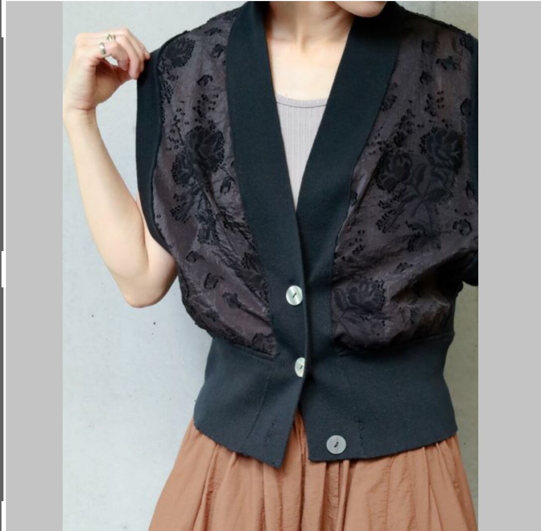 リブニットとカットジャガードをドッキングしたデザインベストです。程よい張り感の高見えするジャガード素材を使用したきれいめアイテムです。コンパクトなサイジングですがリブの伸縮性が柔らかいので締め付け感がなく着用いただけます。裾のリブは太めにしているのでウエストマーク効果で細見えしてくれます♪ ボタン開きになっているので、開けて着用頂くとこなれ感のある着こなしができます。お家で洗えます。