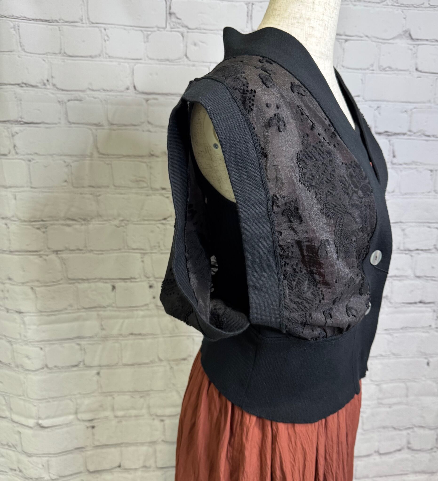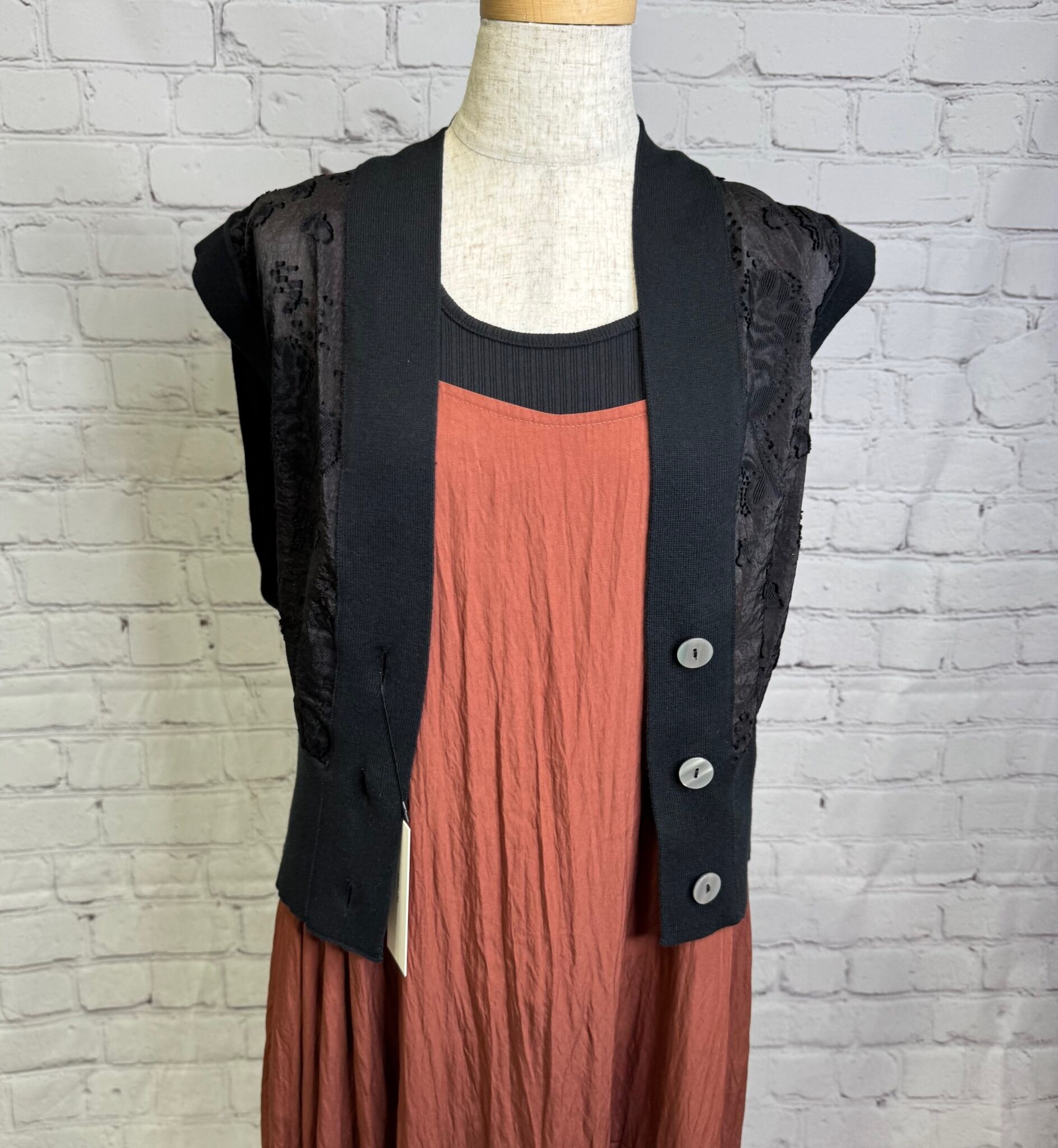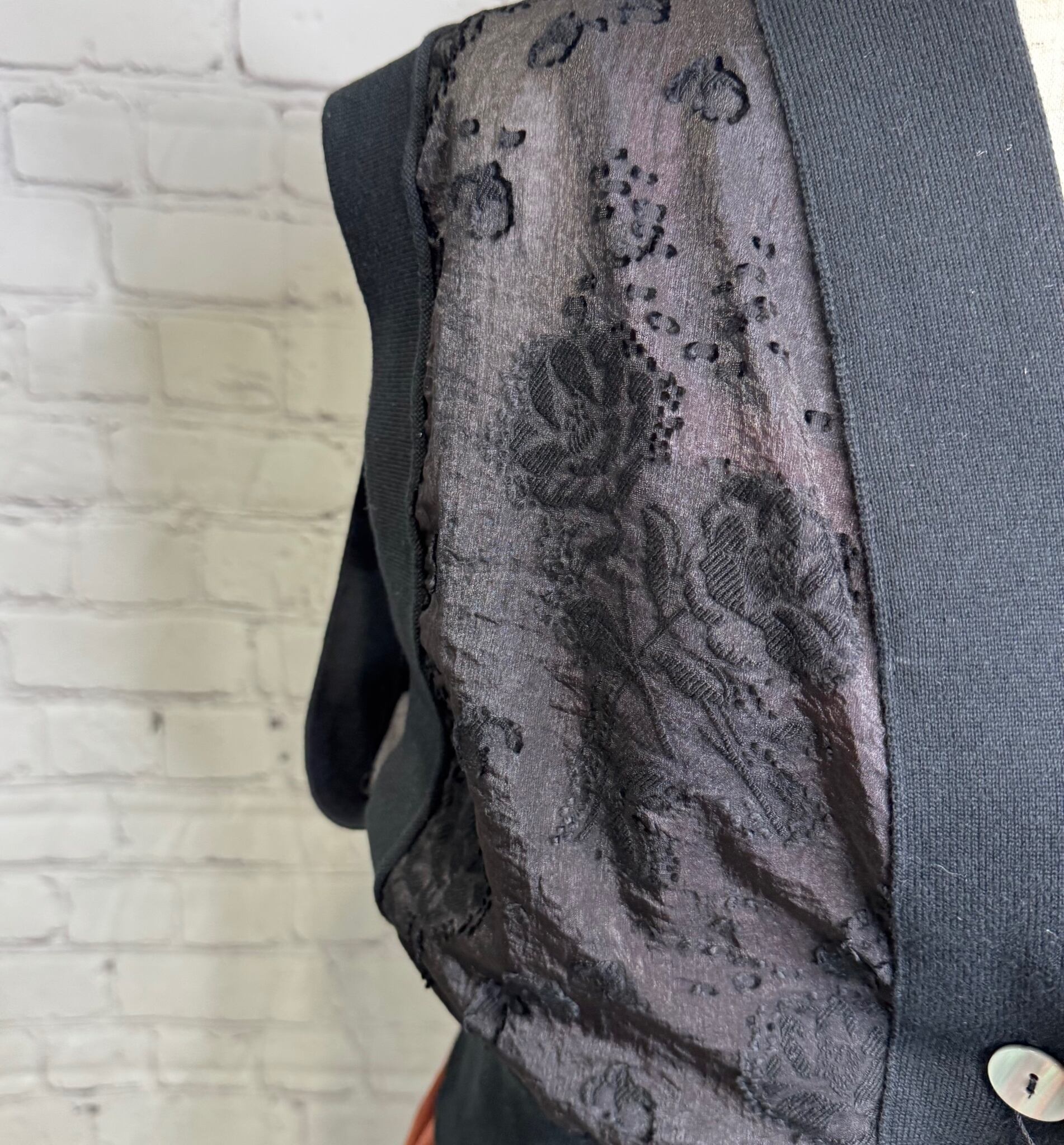 リブニットとカットジャガードをドッキングしたデザインベストです。程よい張り感の高見えするジャガード素材を使用したきれいめアイテムです。コンパクトなサイジングですがリブの伸縮性が柔らかいので締め付け感がなく着用いただけます。裾のリブは太めにしているのでウエストマーク効果で細見えしてくれます♪ ボタン開きになっているので、開けて着用頂くとこなれ感のある着こなしができます。お家で洗えます。