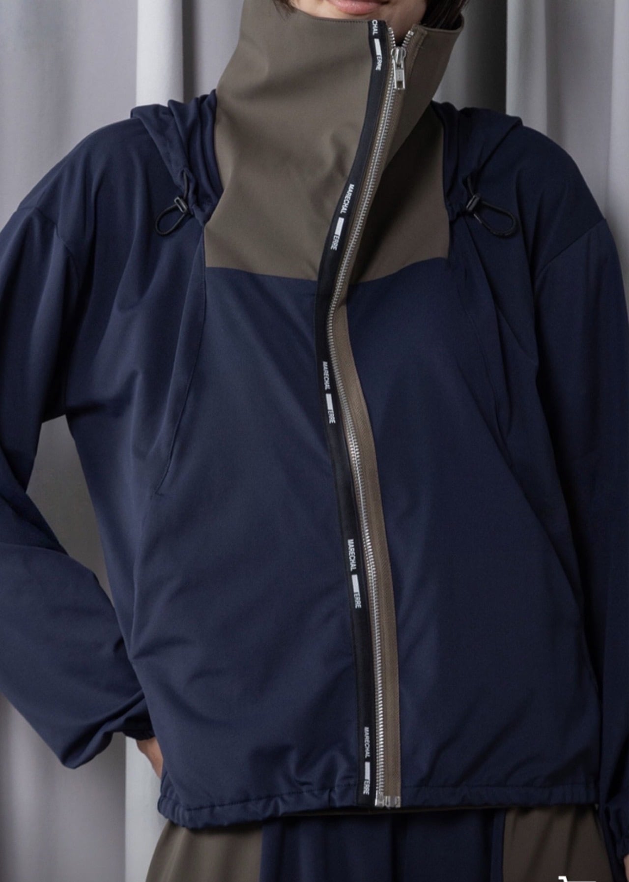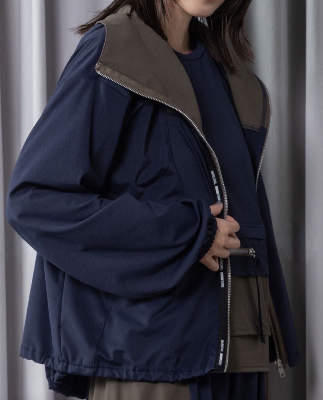 ★高さのある異素材の配色スタンドカラー、鼻まで隠れる、日焼け予防にも最適なディテール。